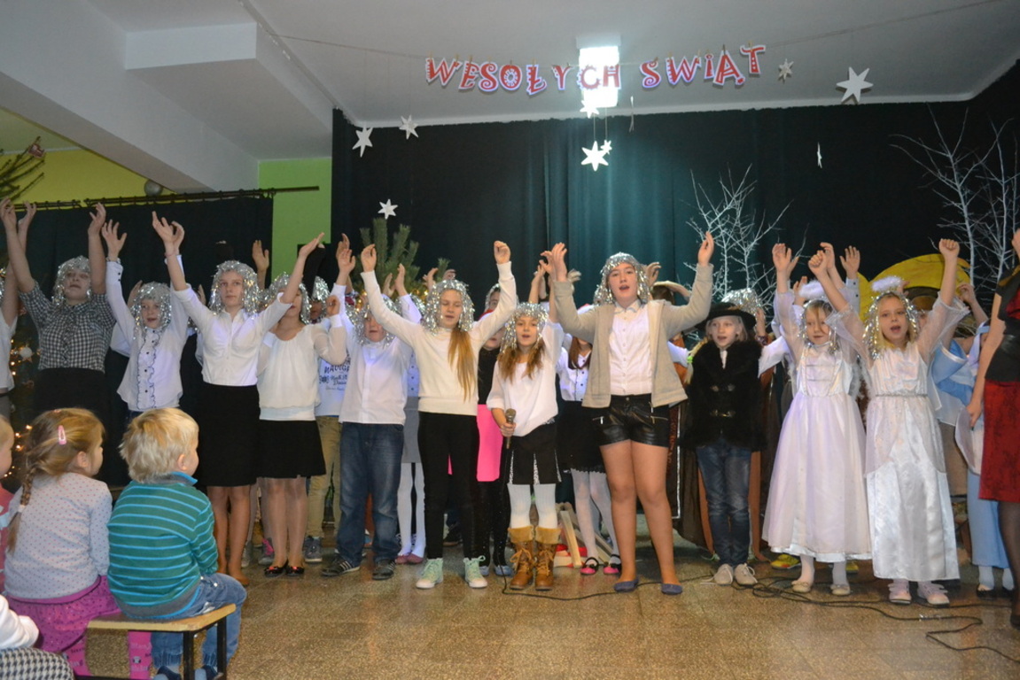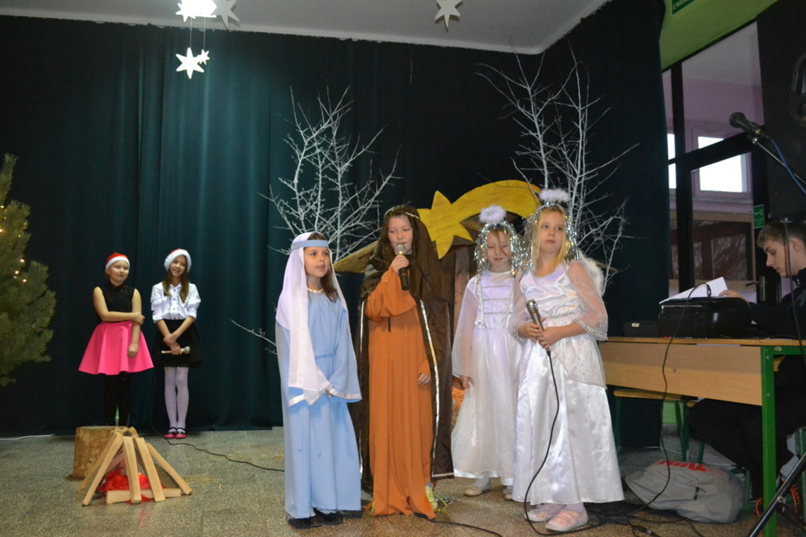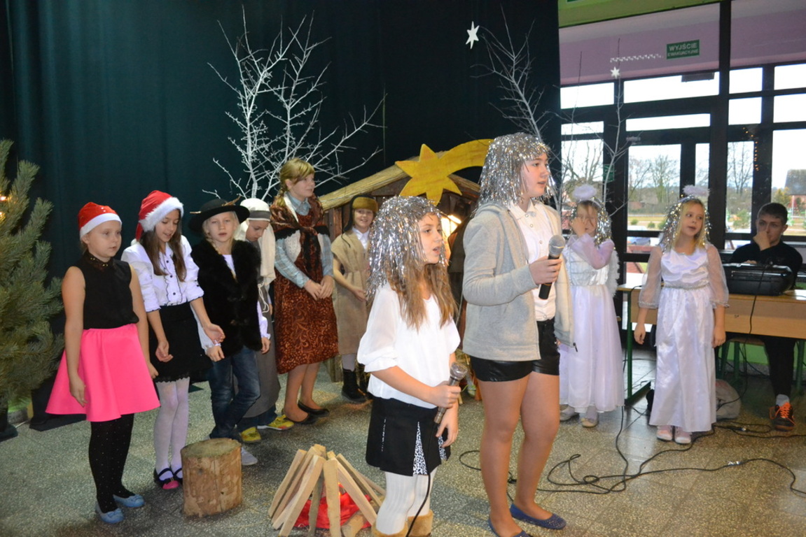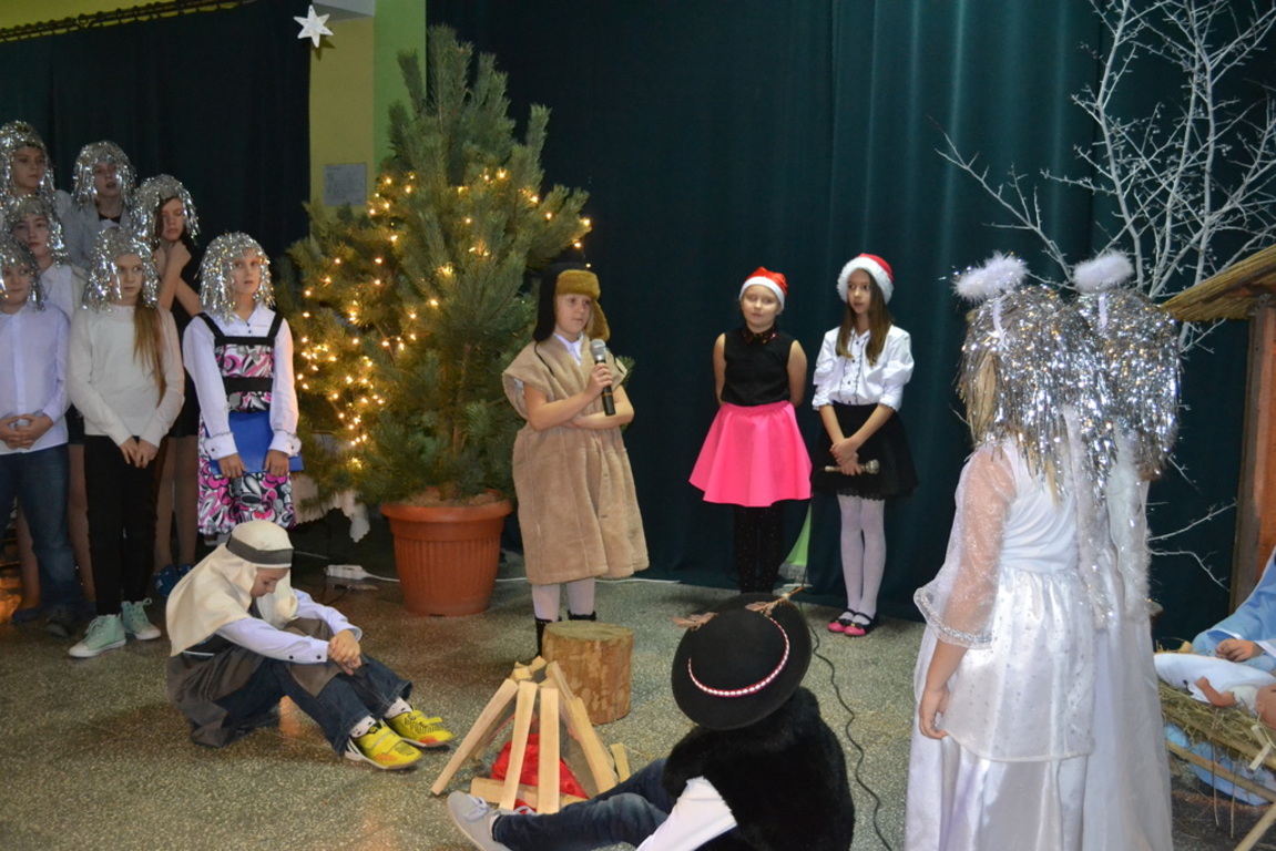 Dzisiejszego dnia w świąteczny nastrój wprowadzili nas uczniowie ze Szkoły Podstawowej, którzy pod kierunkiem pani Aleksandry Jeziorowskiej i pani Marzeny Łapy przygotowali Jasełka wigilijne przypominające nam istotę Świąt Bożego Narodzenia. Po występie pan dyrektor Krzysztof Wojtysiak życzył wszystkim uczniom i ich rodzicom rodzinnych, spokojnych i radosnych Świąt. Na koniec wręczone zostały gimnazjalistom nagrody za konkurs na „Najpiękniejszy list do św. Mikołaja”. W tym świątecznym i radosnym nastroju uczniowie spotkali się następnie ze swoimi wychowawcami obchodząc zgodnie z tradycją Wigilie w swoich klasach.