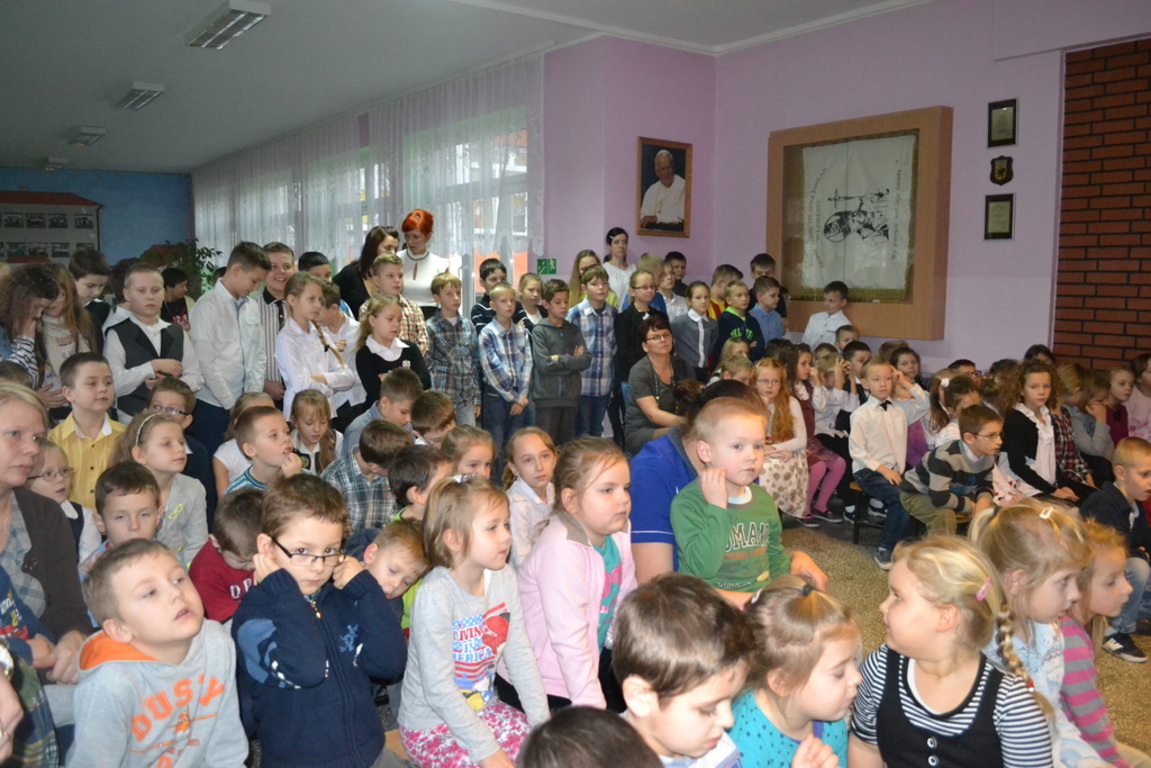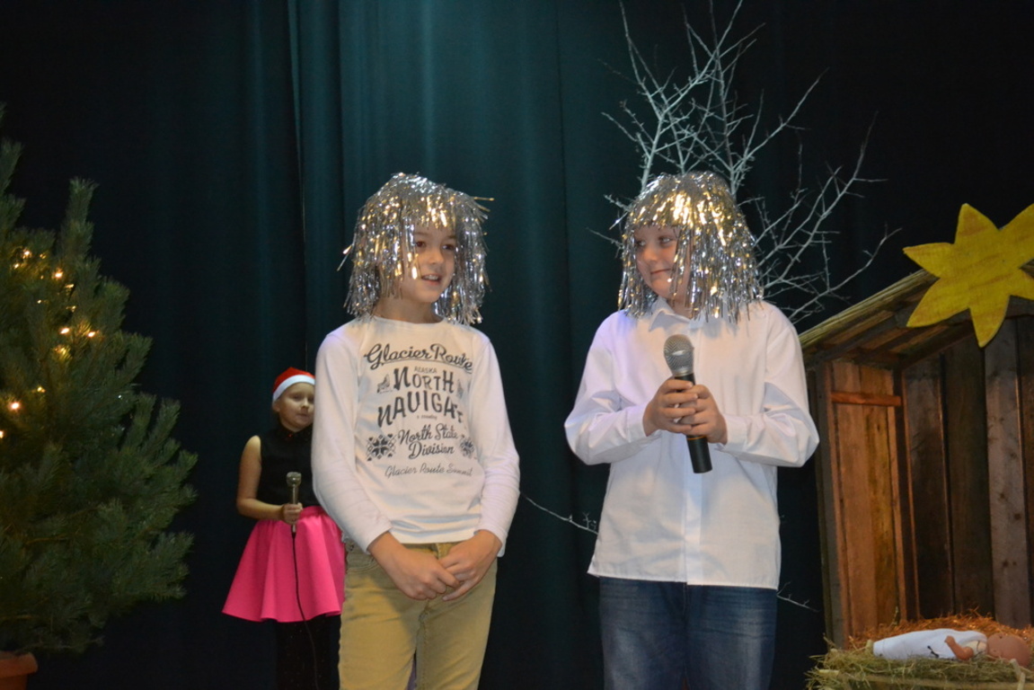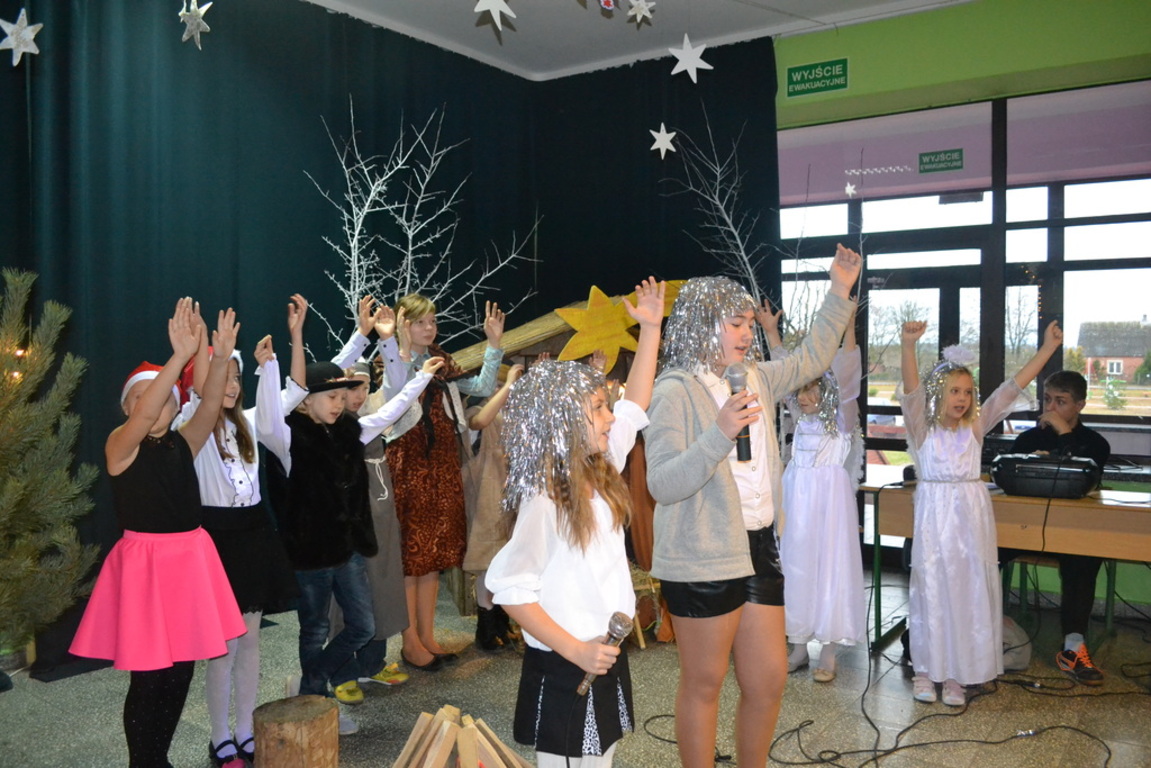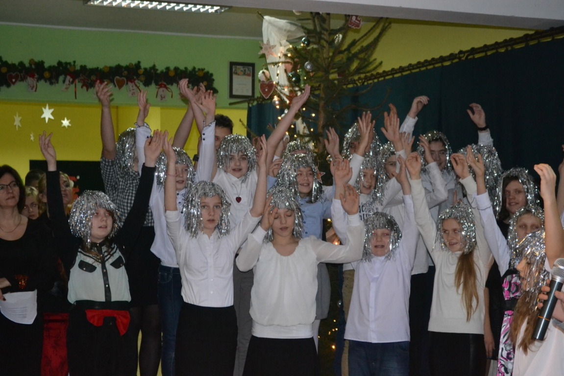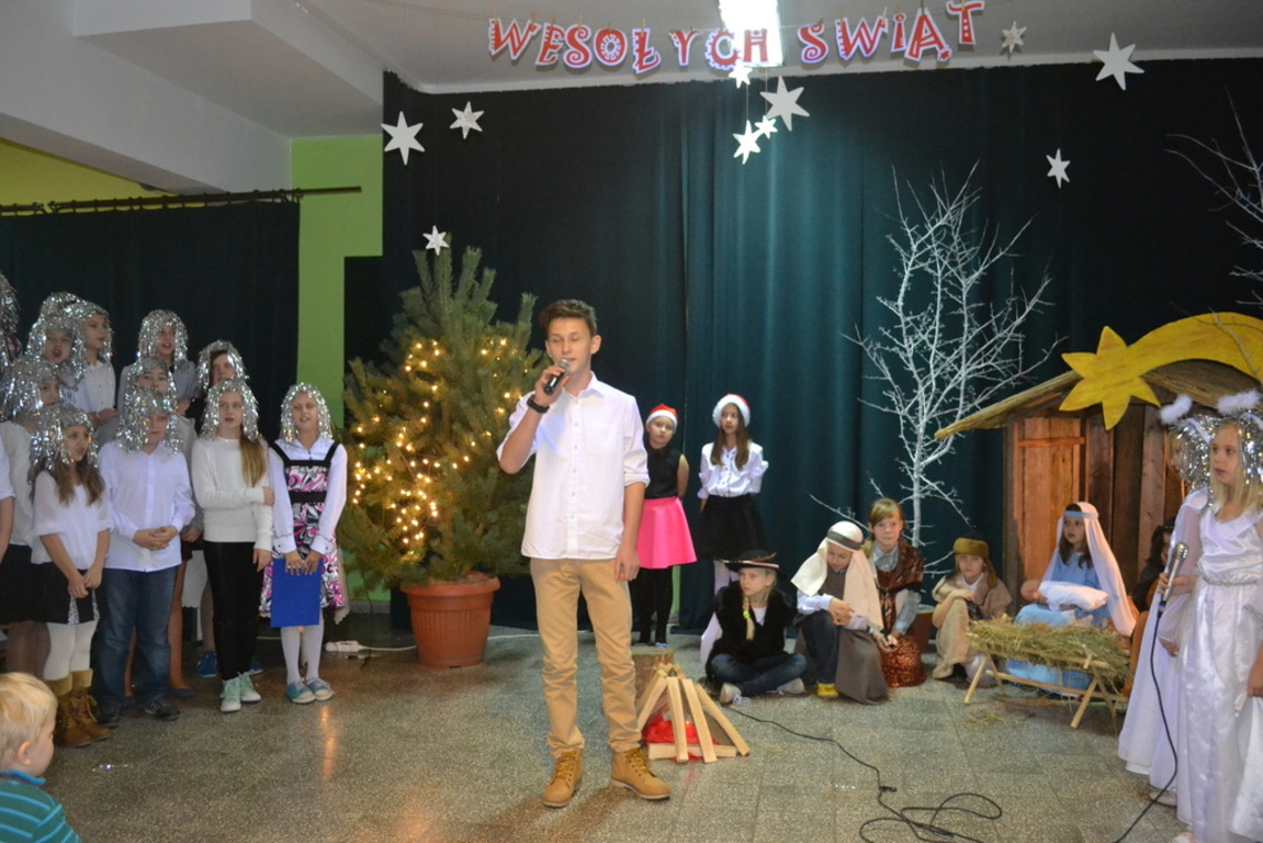 Dzisiejszego dnia w świąteczny nastrój wprowadzili nas uczniowie ze Szkoły Podstawowej, którzy pod kierunkiem pani Aleksandry Jeziorowskiej i pani Marzeny Łapy przygotowali Jasełka wigilijne przypominające nam istotę Świąt Bożego Narodzenia. Po występie pan dyrektor Krzysztof Wojtysiak życzył wszystkim uczniom i ich rodzicom rodzinnych, spokojnych i radosnych Świąt. Na koniec wręczone zostały gimnazjalistom nagrody za konkurs na „Najpiękniejszy list do św. Mikołaja”. W tym świątecznym i radosnym nastroju uczniowie spotkali się następnie ze swoimi wychowawcami obchodząc zgodnie z tradycją Wigilie w swoich klasach.