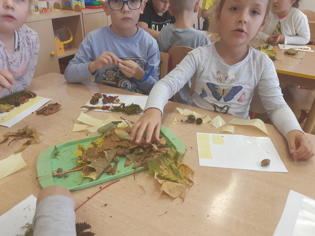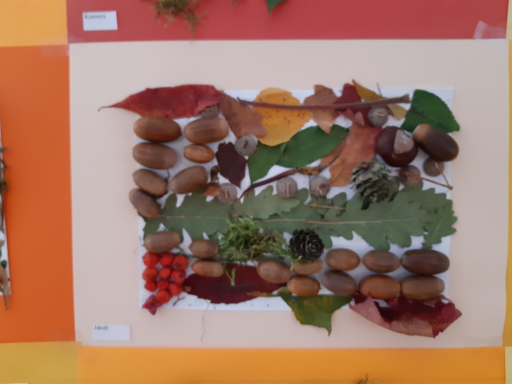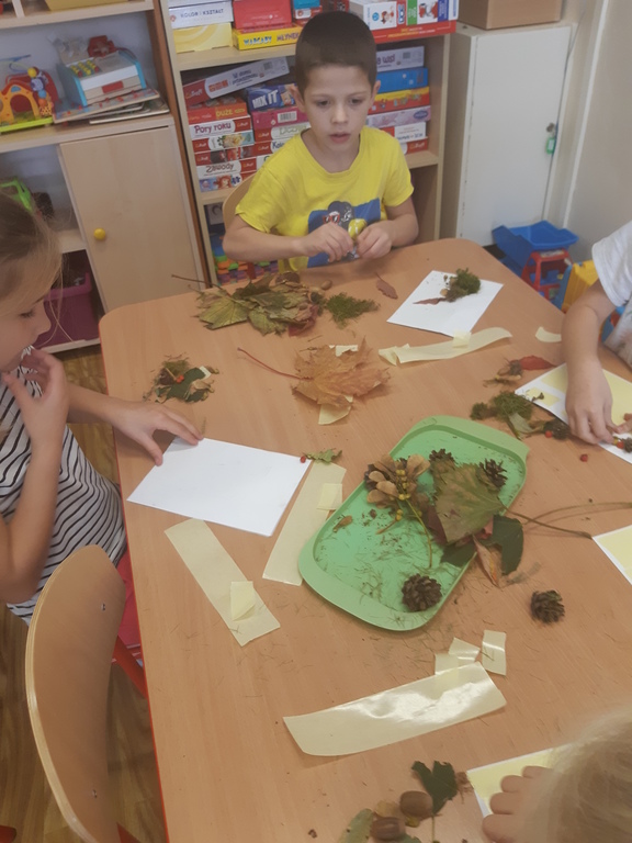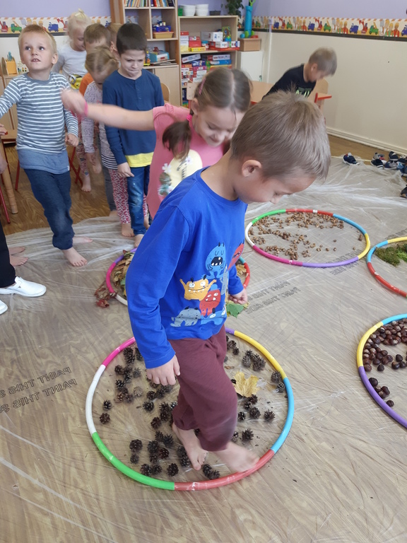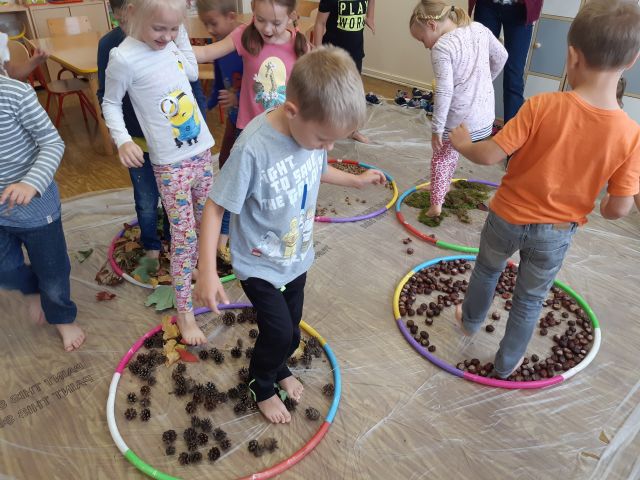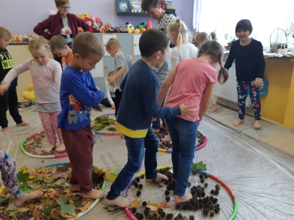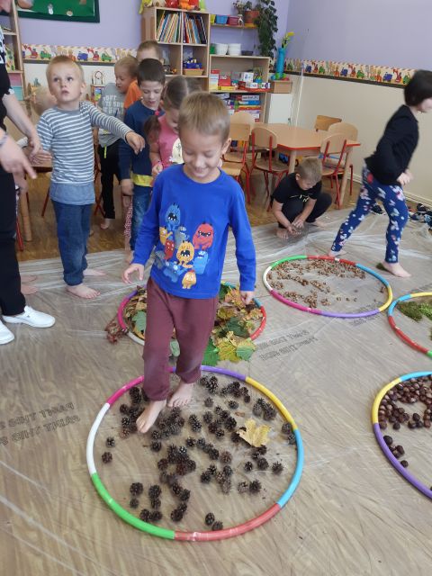 Dlatego korzystając z darów natury "Puchatki" stworzyły ścieżkę sensoryczną, która składała się z: liści, szyszek,mchu, kasztanów oraz żołędzi. Najpierw musieliśmy się odpowiednio przygotować do wspólnej zabawy. Zabezpieczyliśmy folią podłogę, przygotowaliśmy plastikowe koła, do których wsypaliśmy „dary natury”, ustawiliśmy się kolejno jedno za drugim i... ruszyliśmy bosymi stopami po jesiennej ścieżce! A na zakończenie zajęć ze wszystkich darów jesieni powstały kreatywne prace pt.: "Jesienny pejzaż".