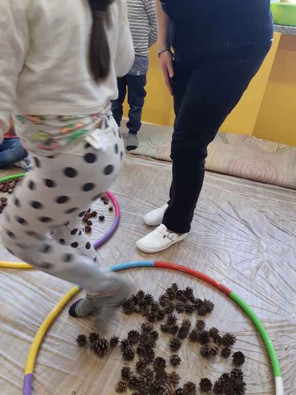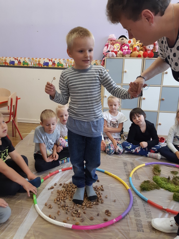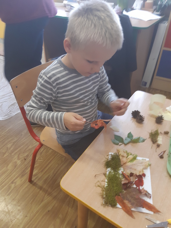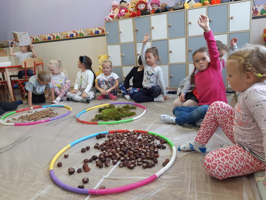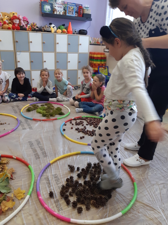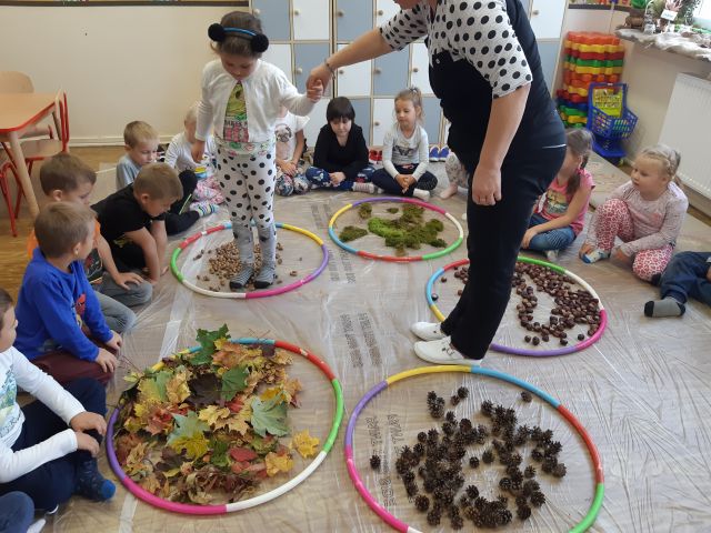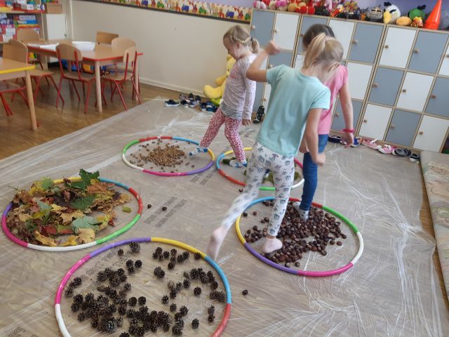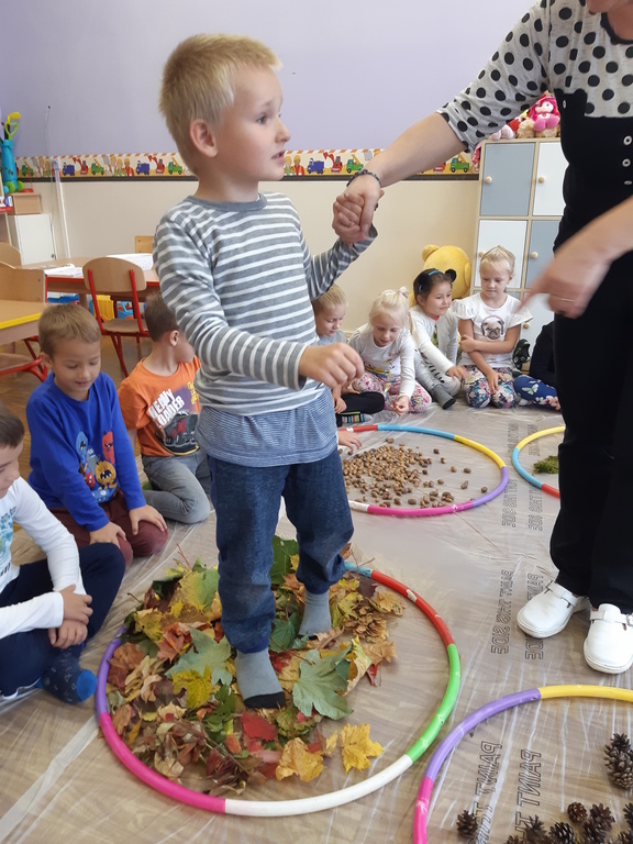 Dlatego korzystając z darów natury "Puchatki" stworzyły ścieżkę sensoryczną, która składała się z: liści, szyszek,mchu, kasztanów oraz żołędzi. Najpierw musieliśmy się odpowiednio przygotować do wspólnej zabawy. Zabezpieczyliśmy folią podłogę, przygotowaliśmy plastikowe koła, do których wsypaliśmy „dary natury”, ustawiliśmy się kolejno jedno za drugim i... ruszyliśmy bosymi stopami po jesiennej ścieżce! A na zakończenie zajęć ze wszystkich darów jesieni powstały kreatywne prace pt.: "Jesienny pejzaż".