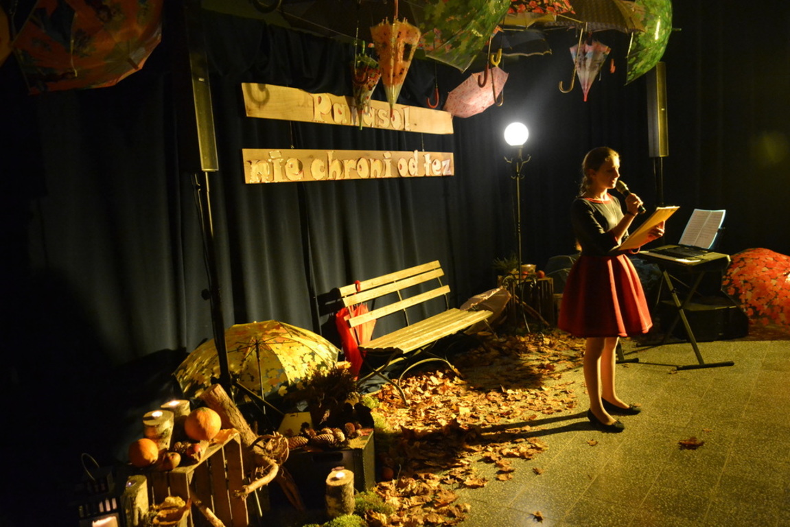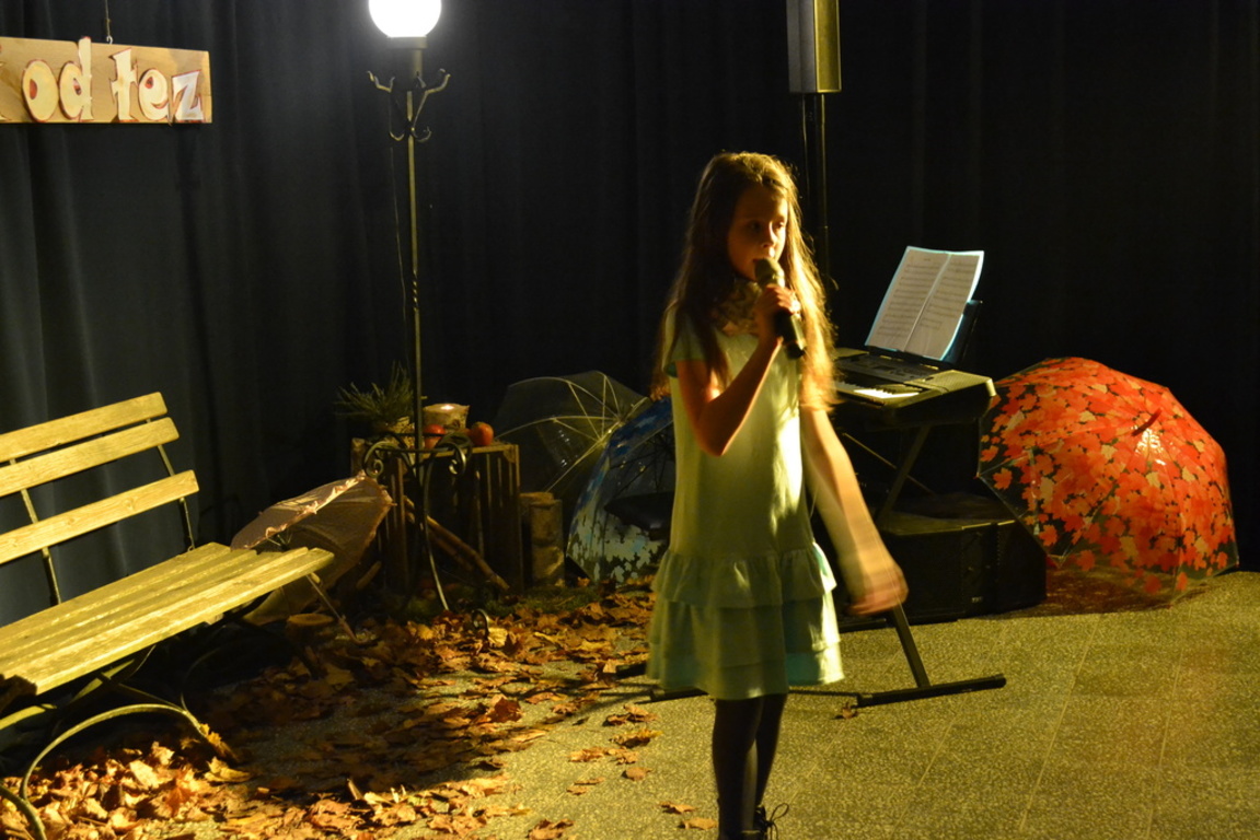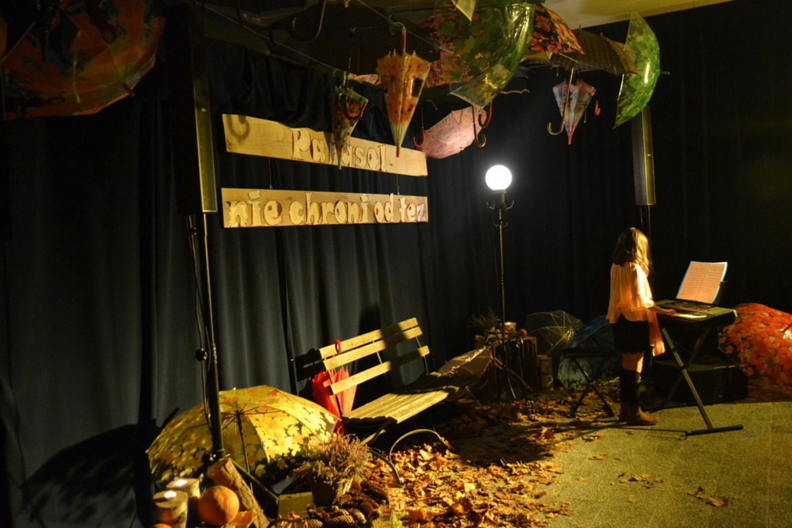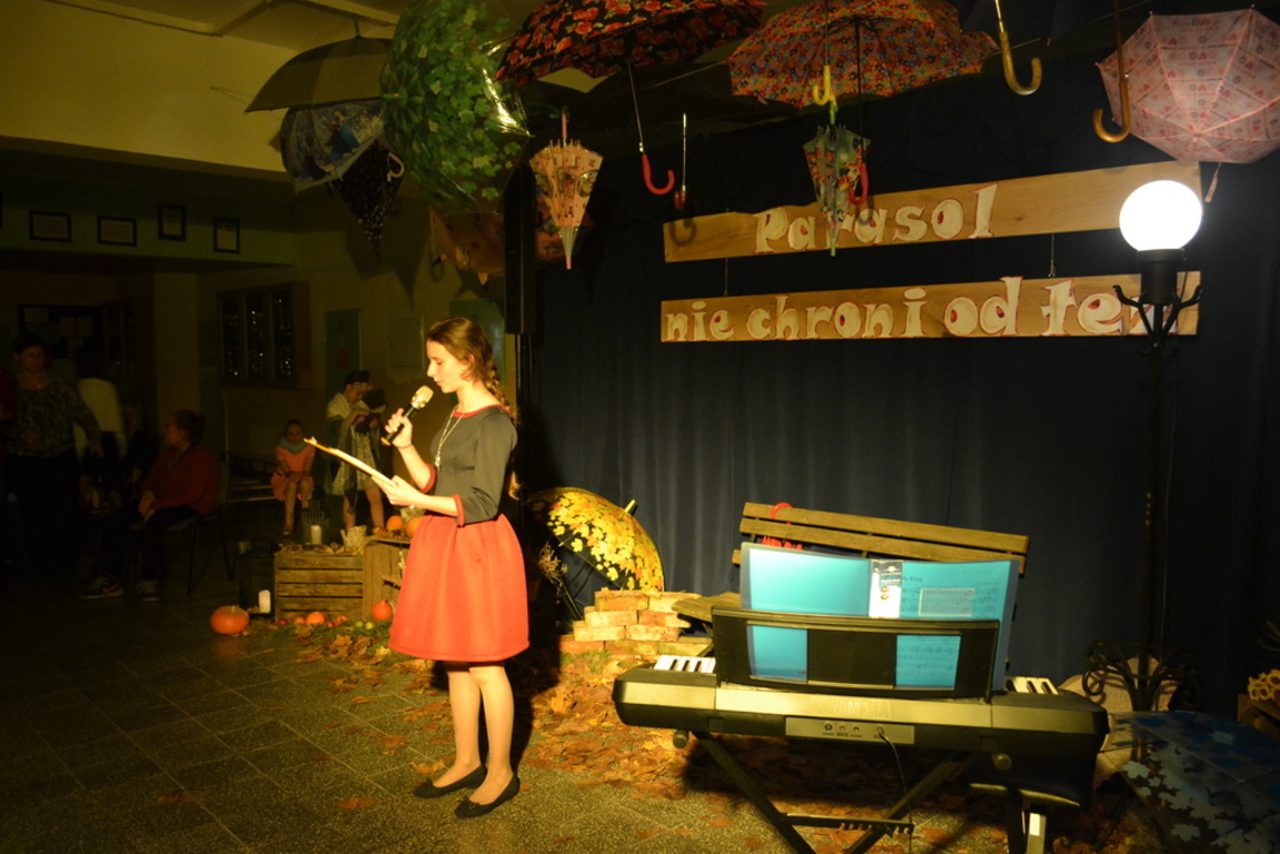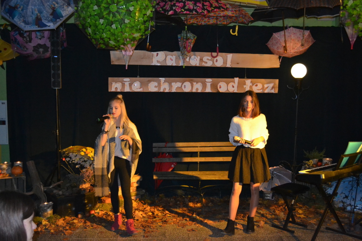 3 listopada 2017 roku miała w naszej szkole miejsce niespotykana uroczystość, która zorganizowana została z inicjatywy naszej utalentowanej artystycznie młodzieży. Inicjatorką przedsięwzięcia o nazwie ,,Jesienne śpiewogranie'' była uczennica II klasy gimnazjum - Katarzyna Paprocka, która swym talentem zachwyciła zaproszonych i licznie przybyłych gości. W montażu słowno-muzycznym (który wspólnie z gimnazjalistką opracowały panie Elżbieta Laskiewicz i Aleksandra Jeziorowska) wzięli również udział inni uzdolnieni wokalnie uczniowie, którzy na tle wspaniałej jesiennej dekoracji (pomysłu p. Doroty Studzińskiej) śpiewali o tym, że ,,Parasol nie chroni od łez''. Podczas występów podziwiać mogliśmy również młodych instrumentalistów. Opisana jesienna zaduma była pięknym artystycznym przeżyciem, a także realizacją projektu edukacyjnego o nazwie ,,Z muzyką przez szkolny rok''. Mamy nadzieję, że taka muzyczna uczta z dodatkiem aromatu kawy i ciast stanie się naszą jesienną tradycją i przybędą Państwo do naszej muzycznej kawiarenki również za rok. Gratulujemy pomysłowości i zaangażowania realizatorom projektu. Dyrekcji, Wszystkim Rodzicom i przybyłym gościom dziękujemy za wsparcie i ciepłe słowa.