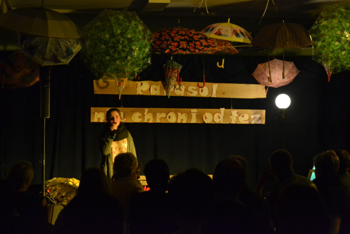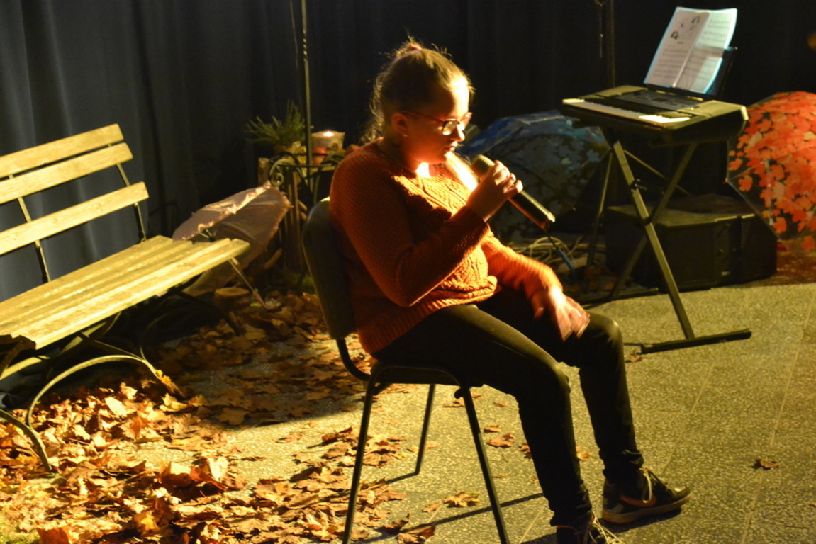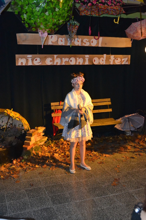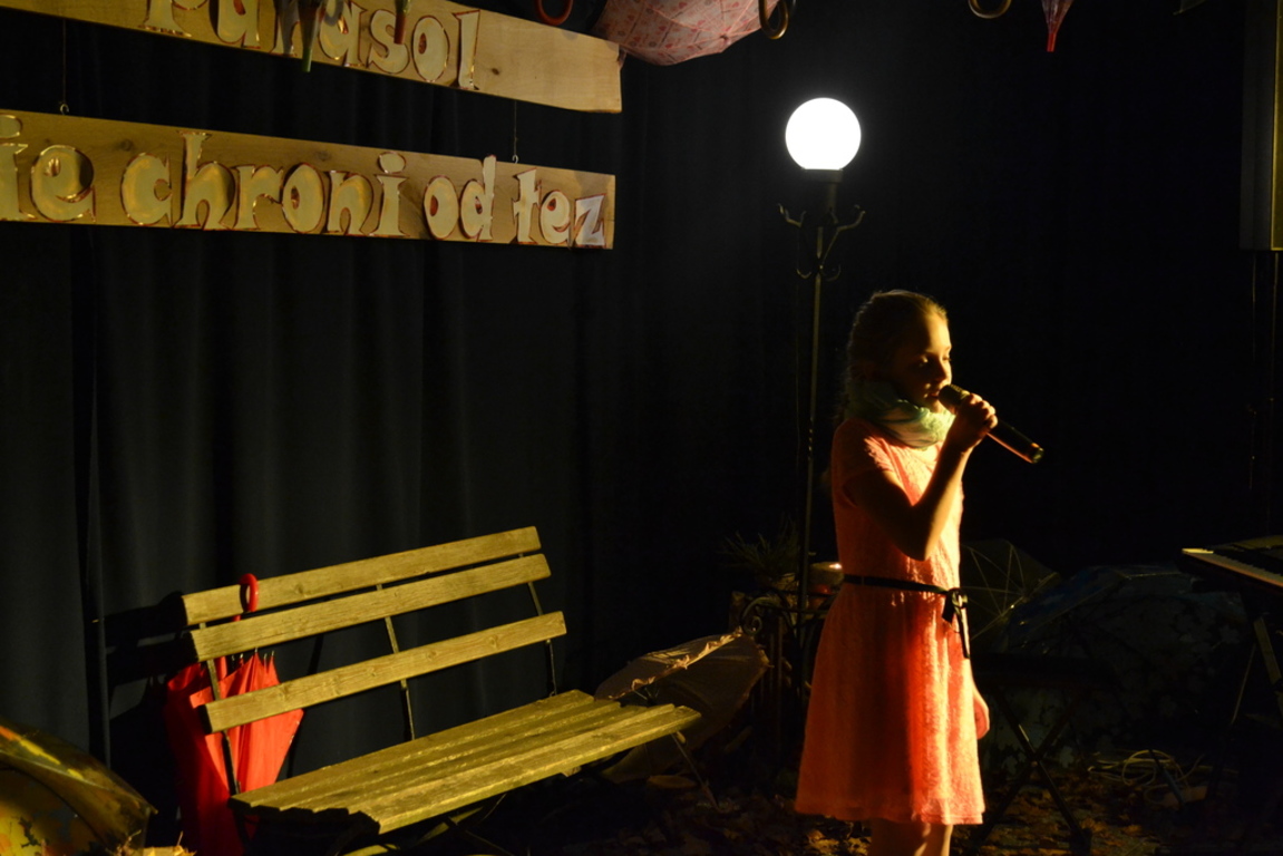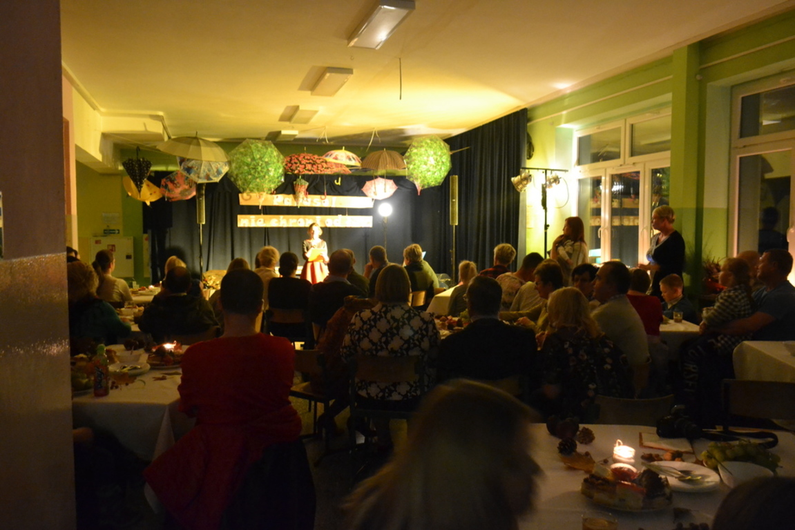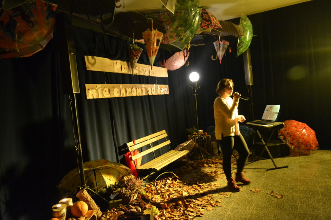 3 listopada 2017 roku miała w naszej szkole miejsce niespotykana uroczystość, która zorganizowana została z inicjatywy naszej utalentowanej artystycznie młodzieży. Inicjatorką przedsięwzięcia o nazwie ,,Jesienne śpiewogranie'' była uczennica II klasy gimnazjum - Katarzyna Paprocka, która swym talentem zachwyciła zaproszonych i licznie przybyłych gości. W montażu słowno-muzycznym (który wspólnie z gimnazjalistką opracowały panie Elżbieta Laskiewicz i Aleksandra Jeziorowska) wzięli również udział inni uzdolnieni wokalnie uczniowie, którzy na tle wspaniałej jesiennej dekoracji (pomysłu p. Doroty Studzińskiej) śpiewali o tym, że ,,Parasol nie chroni od łez''. Podczas występów podziwiać mogliśmy również młodych instrumentalistów. Opisana jesienna zaduma była pięknym artystycznym przeżyciem, a także realizacją projektu edukacyjnego o nazwie ,,Z muzyką przez szkolny rok''. Mamy nadzieję, że taka muzyczna uczta z dodatkiem aromatu kawy i ciast stanie się naszą jesienną tradycją i przybędą Państwo do naszej muzycznej kawiarenki również za rok. Gratulujemy pomysłowości i zaangażowania realizatorom projektu. Dyrekcji, Wszystkim Rodzicom i przybyłym gościom dziękujemy za wsparcie i ciepłe słowa.