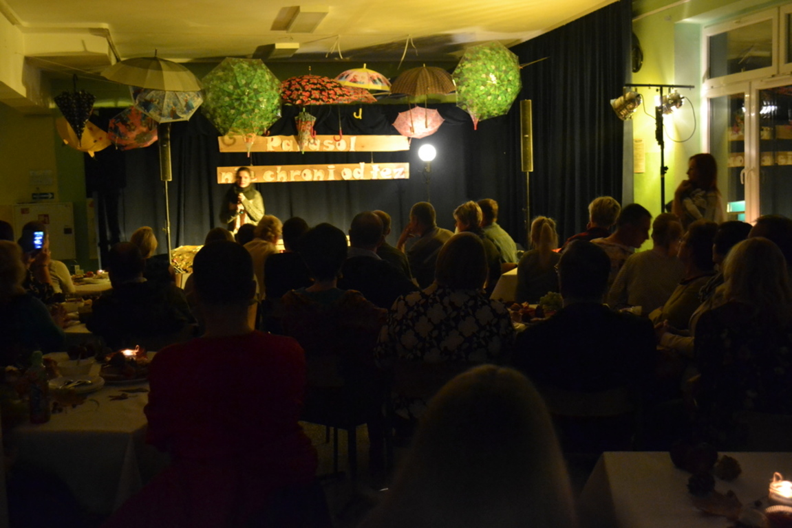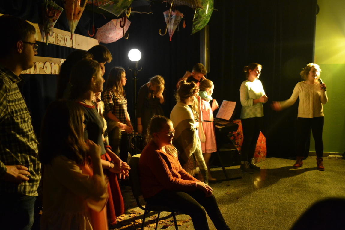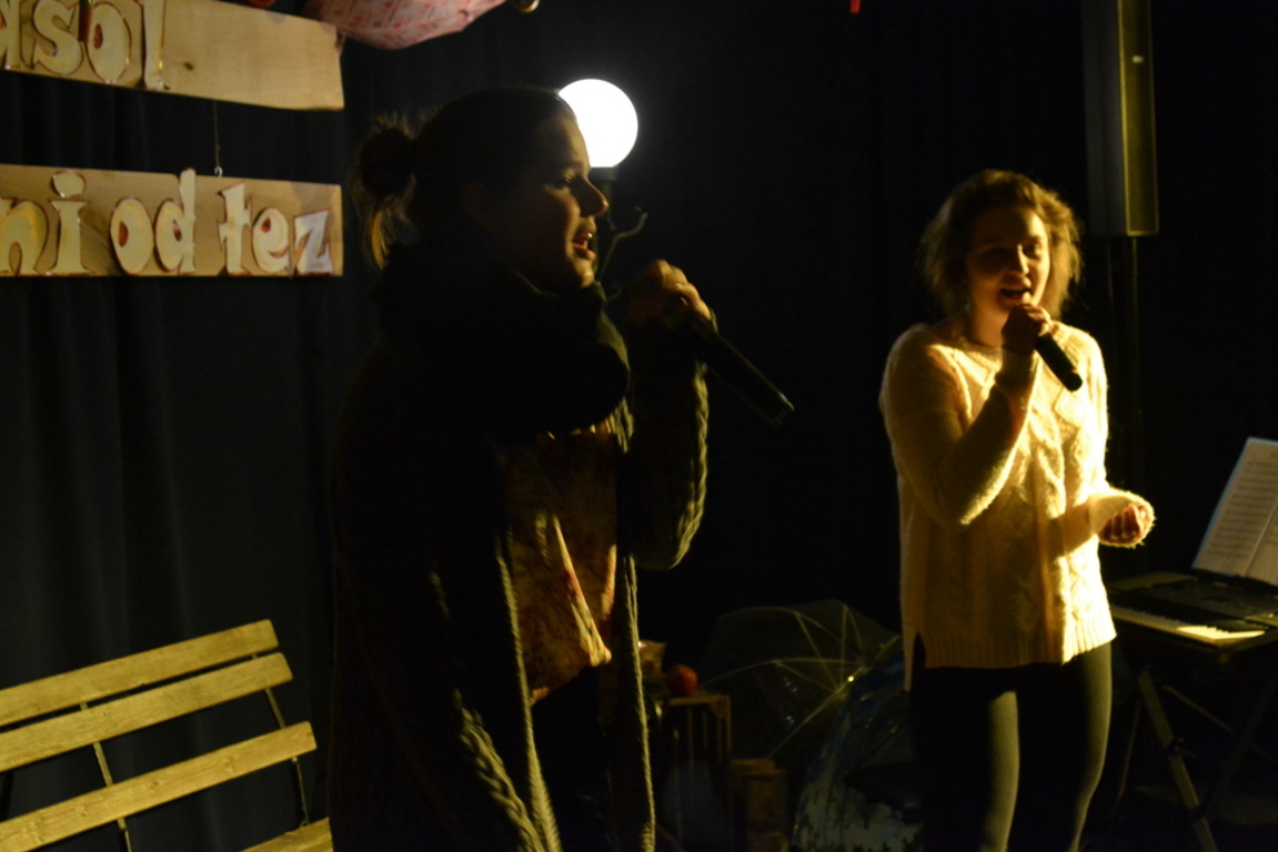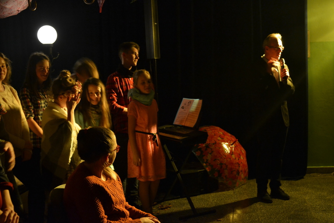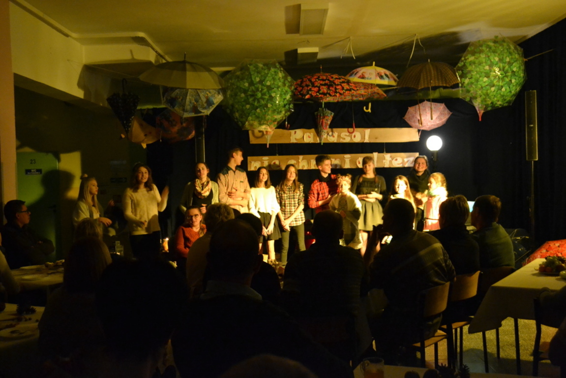 3 listopada 2017 roku miała w naszej szkole miejsce niespotykana uroczystość, która zorganizowana została z inicjatywy naszej utalentowanej artystycznie młodzieży. Inicjatorką przedsięwzięcia o nazwie ,,Jesienne śpiewogranie'' była uczennica II klasy gimnazjum - Katarzyna Paprocka, która swym talentem zachwyciła zaproszonych i licznie przybyłych gości. W montażu słowno-muzycznym (który wspólnie z gimnazjalistką opracowały panie Elżbieta Laskiewicz i Aleksandra Jeziorowska) wzięli również udział inni uzdolnieni wokalnie uczniowie, którzy na tle wspaniałej jesiennej dekoracji (pomysłu p. Doroty Studzińskiej) śpiewali o tym, że ,,Parasol nie chroni od łez''. Podczas występów podziwiać mogliśmy również młodych instrumentalistów. Opisana jesienna zaduma była pięknym artystycznym przeżyciem, a także realizacją projektu edukacyjnego o nazwie ,,Z muzyką przez szkolny rok''. Mamy nadzieję, że taka muzyczna uczta z dodatkiem aromatu kawy i ciast stanie się naszą jesienną tradycją i przybędą Państwo do naszej muzycznej kawiarenki również za rok. Gratulujemy pomysłowości i zaangażowania realizatorom projektu. Dyrekcji, Wszystkim Rodzicom i przybyłym gościom dziękujemy za wsparcie i ciepłe słowa.