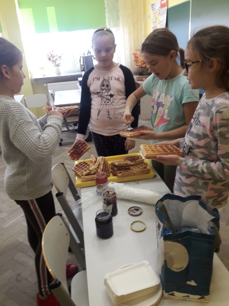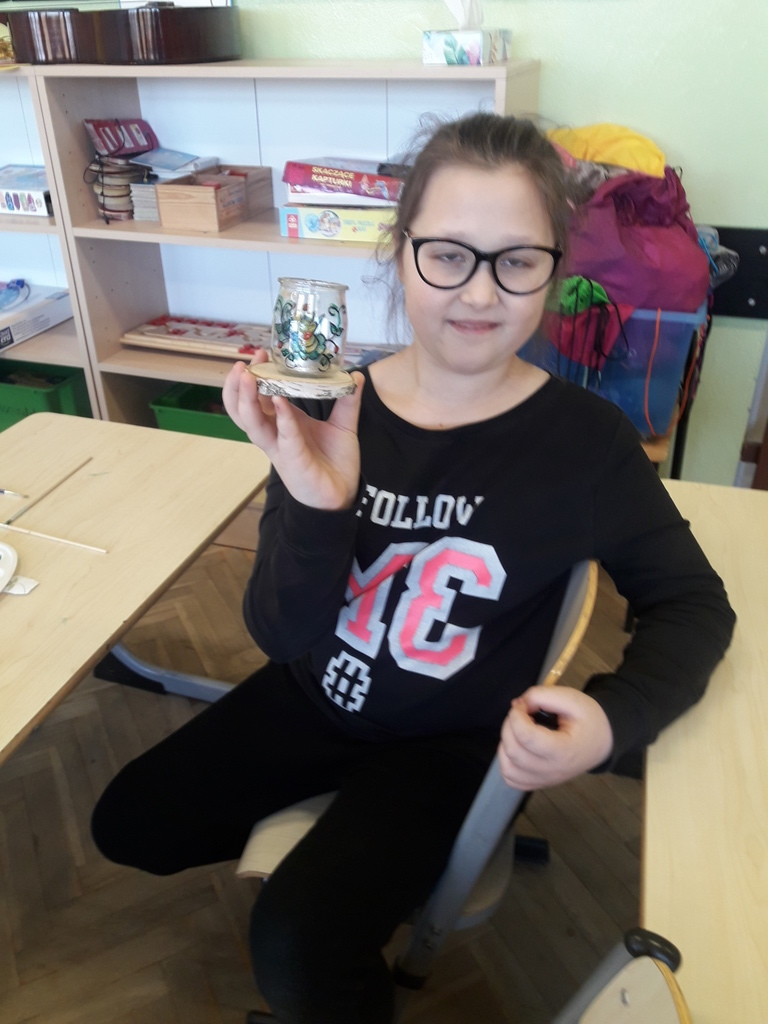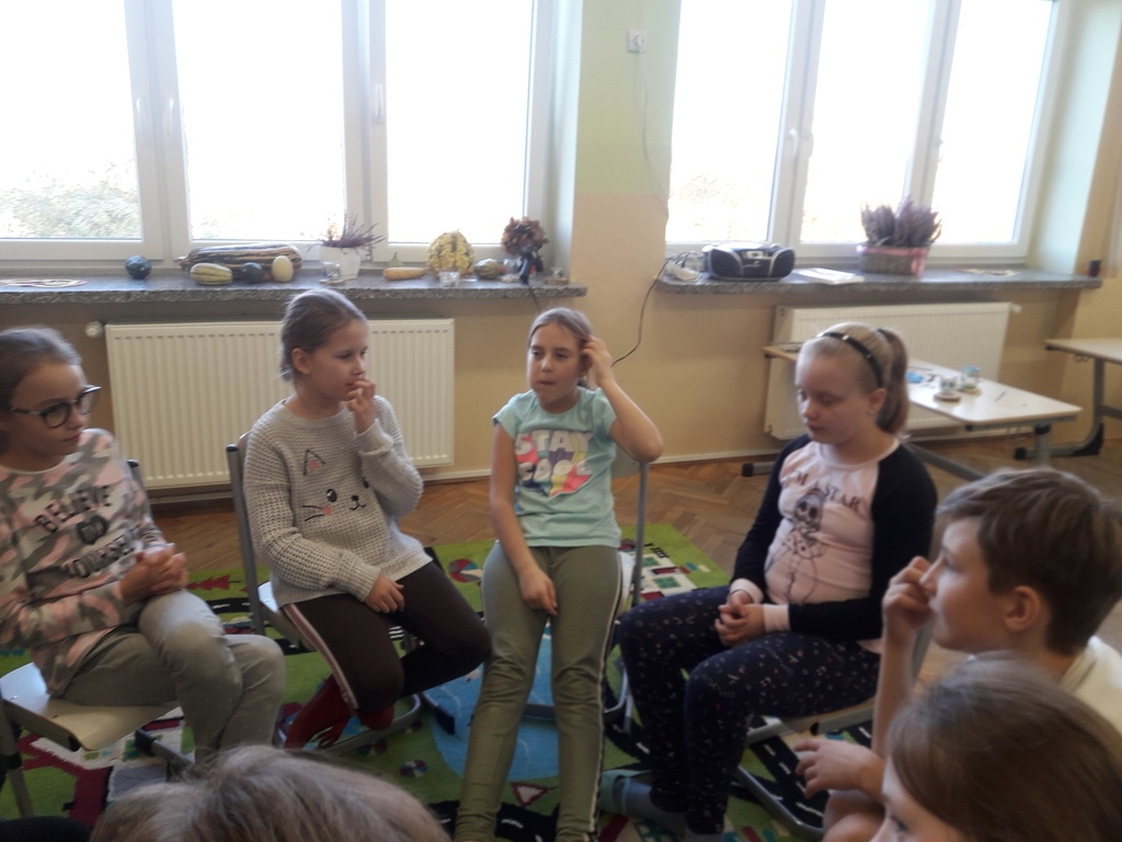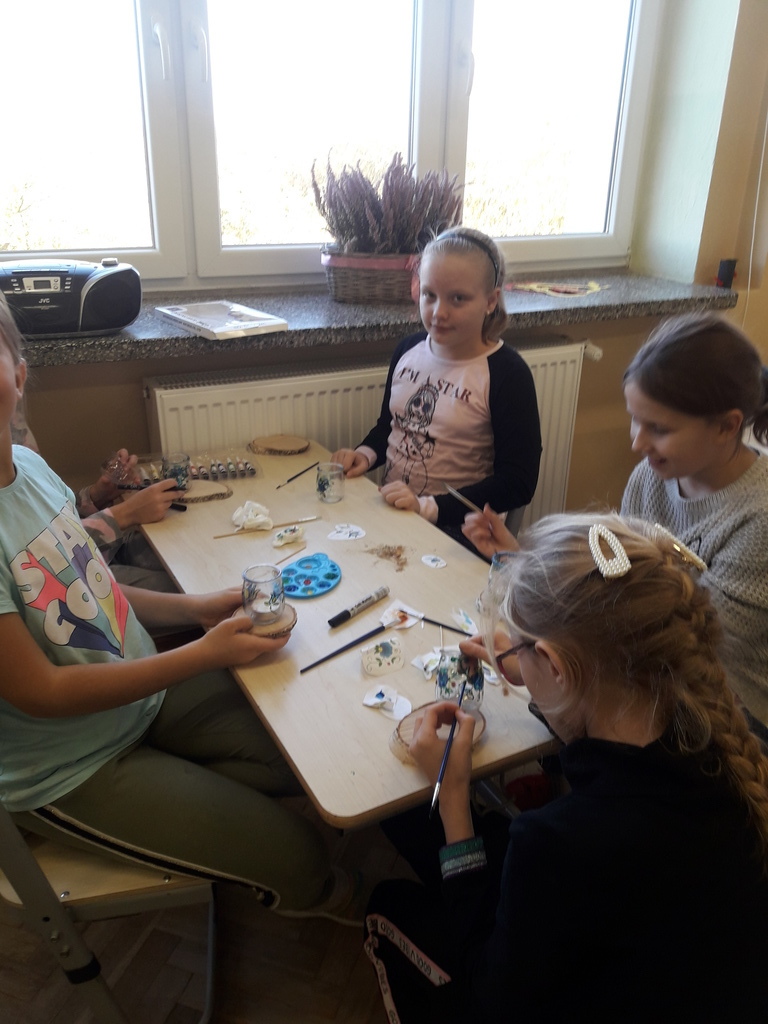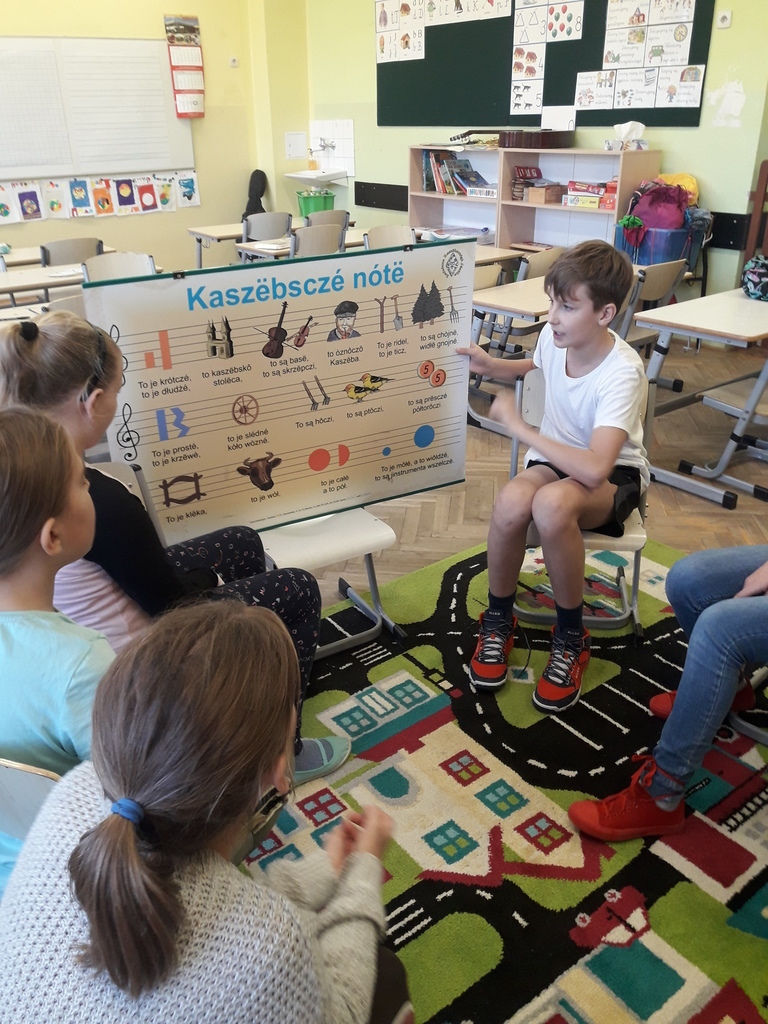 Na listopadowe spotkanie pt.”Moja mała ojczyzna- Kaszuby. Poznajemy swój region.” zaprosiliśmy prawdziwą Kaszubkę- Panią Bożenę. Nasz niezwykły gość opowiedział nam o dawnych zwyczajach i tradycjach kaszubskich. Pani Bożena nawiązała też do tradycji bożonarodzeniowych i wielkanocnych, które pielęgnowano w jej rodzinnym domu na Kaszubach. Uczniowie byli zachwyceni , kiedy Pani Bożena mówiła w języku kaszubskim. Całkiem nieźle radzili sobie z tłumaczeniem. Następnie wspólnie z gościem zaśpiewali „Kaszubskie nuty” i „Kaszubskie jeziora” . Podczas tego spotkania odbyły się również warsztaty „Malowanie na szkle”- dzieci wykonały piękne świeczniki z elementami wzoru kaszubskiego. Kolejnym punktem spotkania były smakowite gofry z dżemem. To było bardzo ciekawe i pouczające spotkanie.