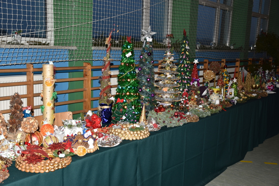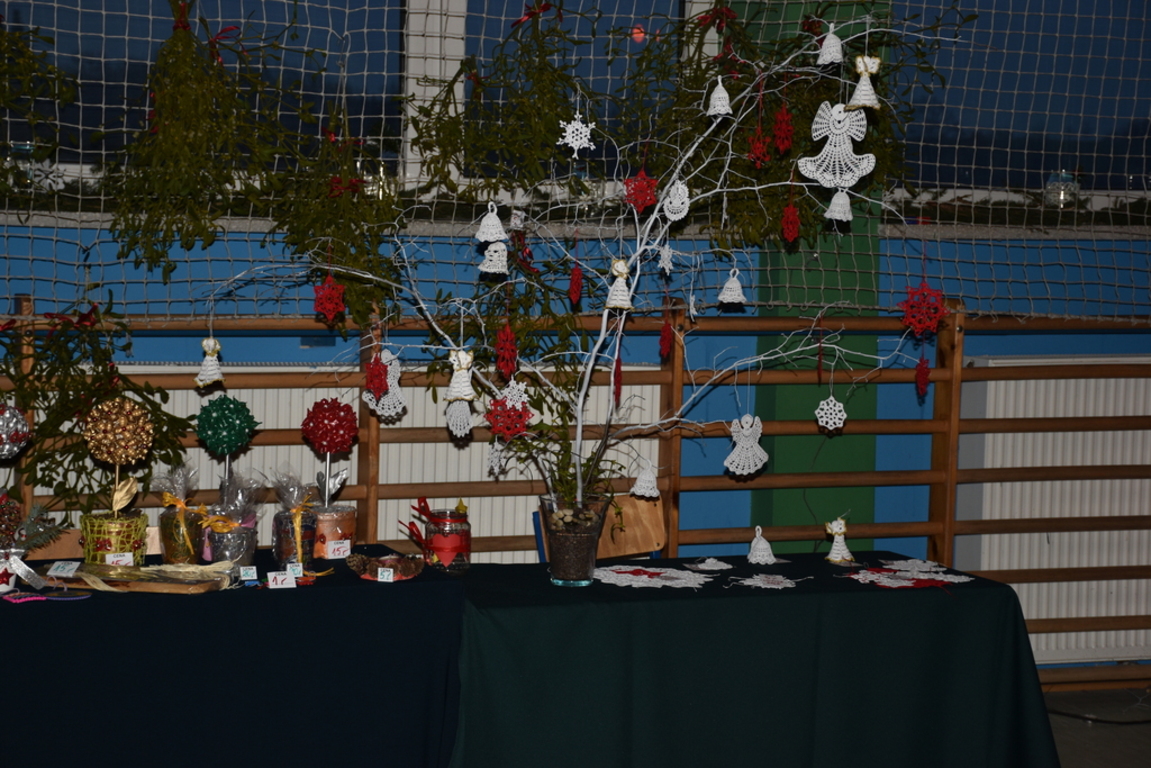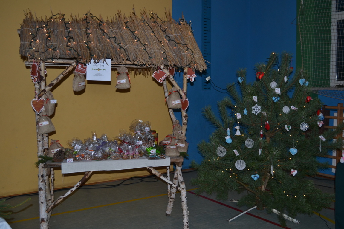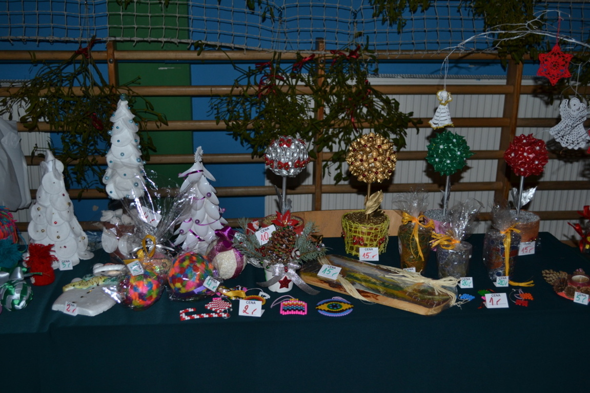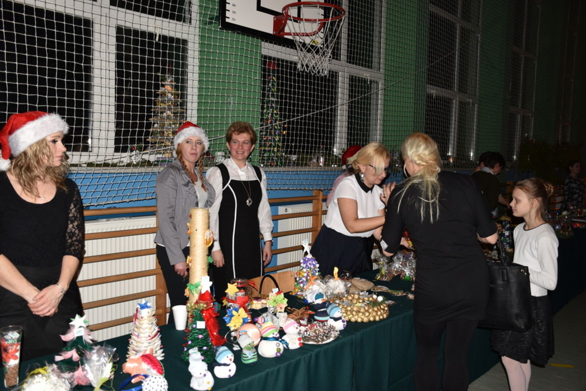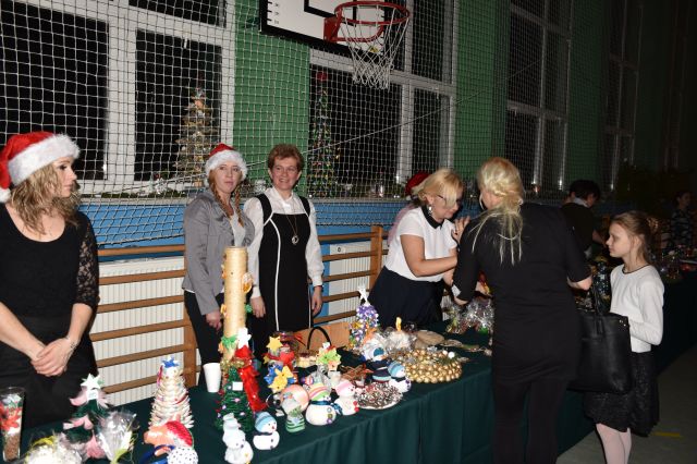 Na sali gimnastycznej udekorowanej według projektu p. Doroty Studzińskiej przygotowano stoiska świąteczne, a na nich barwne stroiki, choinki, kartki świąteczne, ozdoby z papieru, filcu, szyszek, makaronu, dekoracje wykonywane rozmaitymi technikami: szydełkowane, malowane, klejone. Wszystkie bardzo pomysłowe, świadczące o wielkiej wyobraźni wykonawców. Obok znajdowały się stoiska z przygotowanymi przez rodziców ciastami, które cieszyły się wielkim uznaniem kupujących. Wszystkie te stanowiska obsługiwali nauczyciele oraz rodzice. Nie mniejszym powodzeniem cieszyło się stoisko harcerzy. Przygotowali oni pieczone na grillu ziemniaki z różnorodnymi dodatkami oraz serwowali prawdziwy barszcz i przygotowane przez p. Labudę pierogi, a obok popcorn.