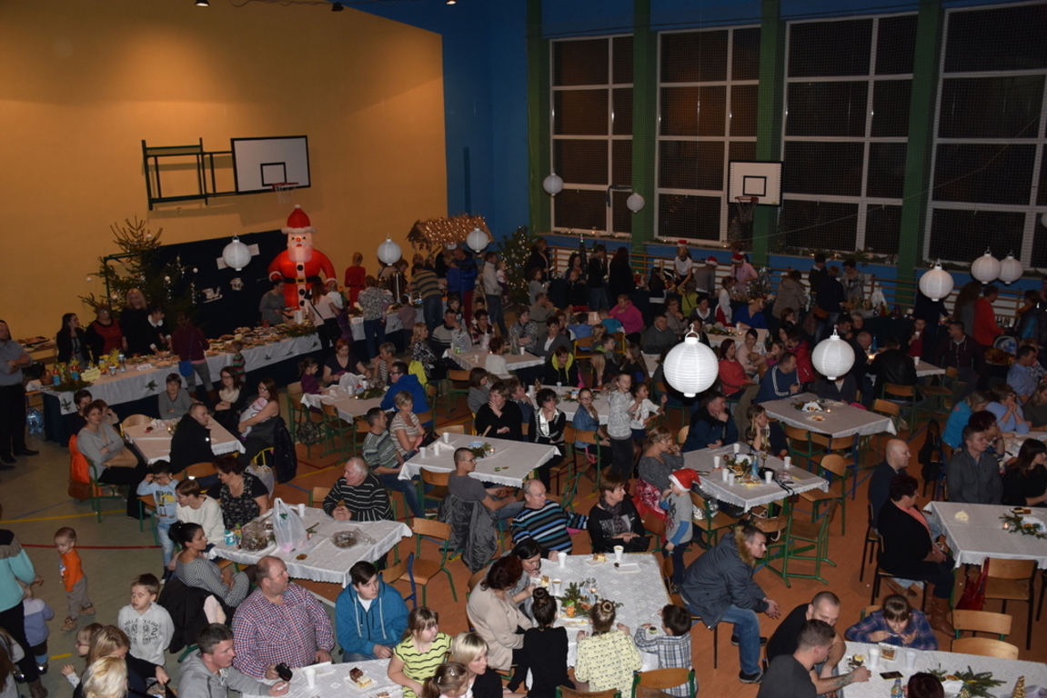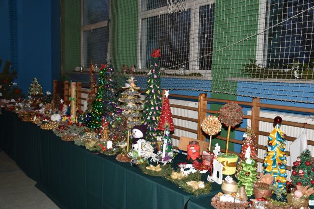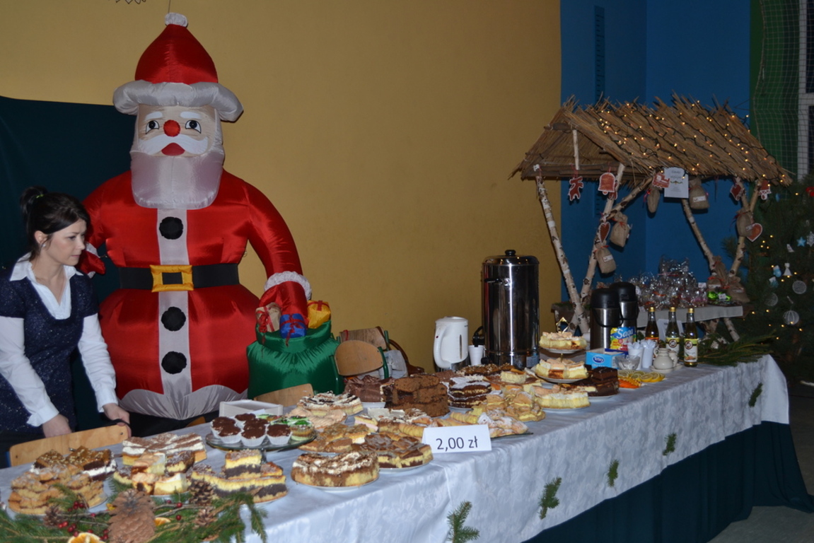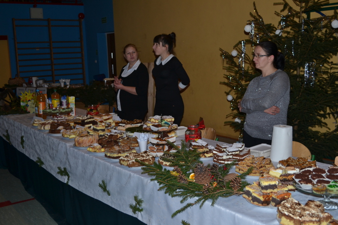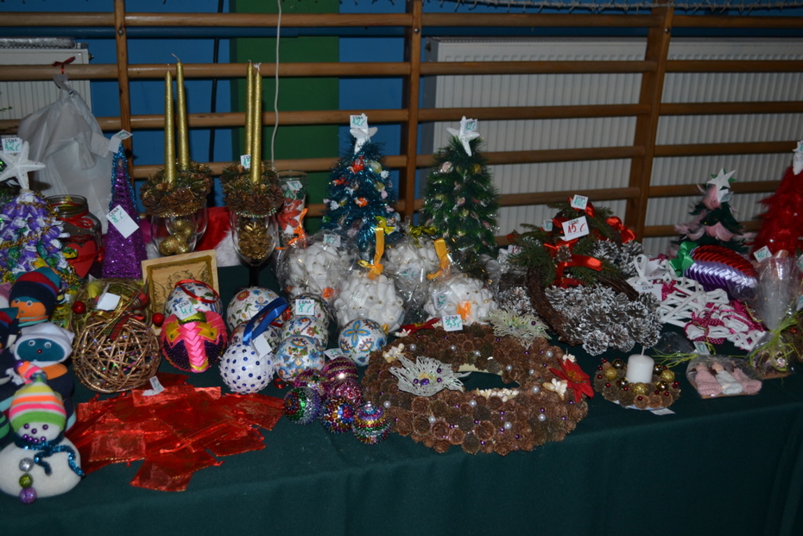 Na sali gimnastycznej udekorowanej według projektu p. Doroty Studzińskiej przygotowano stoiska świąteczne, a na nich barwne stroiki, choinki, kartki świąteczne, ozdoby z papieru, filcu, szyszek, makaronu, dekoracje wykonywane rozmaitymi technikami: szydełkowane, malowane, klejone. Wszystkie bardzo pomysłowe, świadczące o wielkiej wyobraźni wykonawców. Obok znajdowały się stoiska z przygotowanymi przez rodziców ciastami, które cieszyły się wielkim uznaniem kupujących. Wszystkie te stanowiska obsługiwali nauczyciele oraz rodzice. Nie mniejszym powodzeniem cieszyło się stoisko harcerzy. Przygotowali oni pieczone na grillu ziemniaki z różnorodnymi dodatkami oraz serwowali prawdziwy barszcz i przygotowane przez p. Labudę pierogi, a obok popcorn.