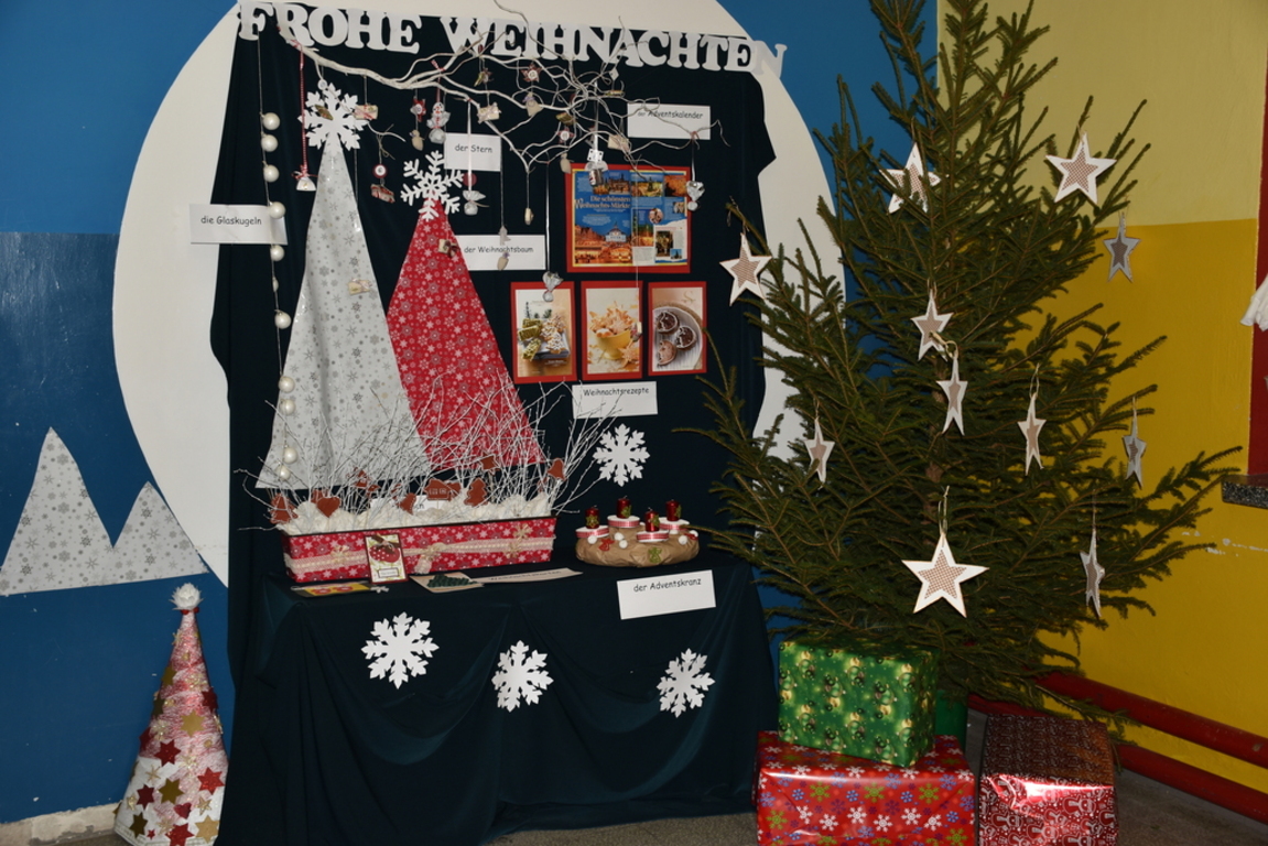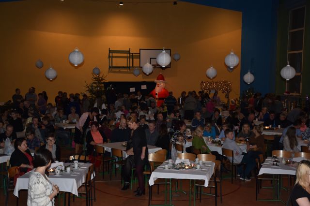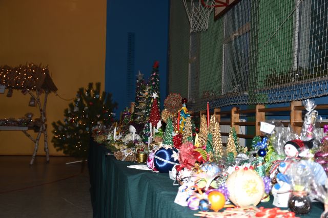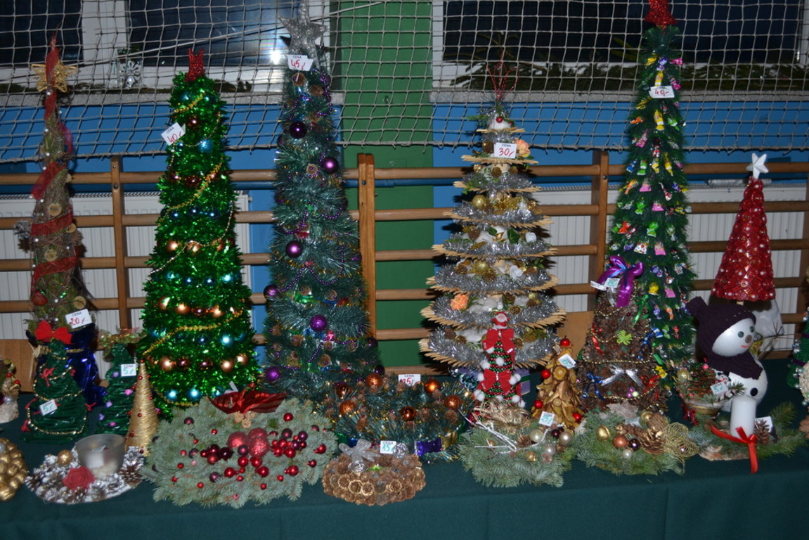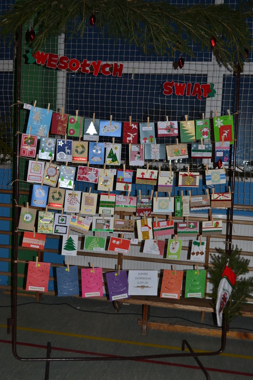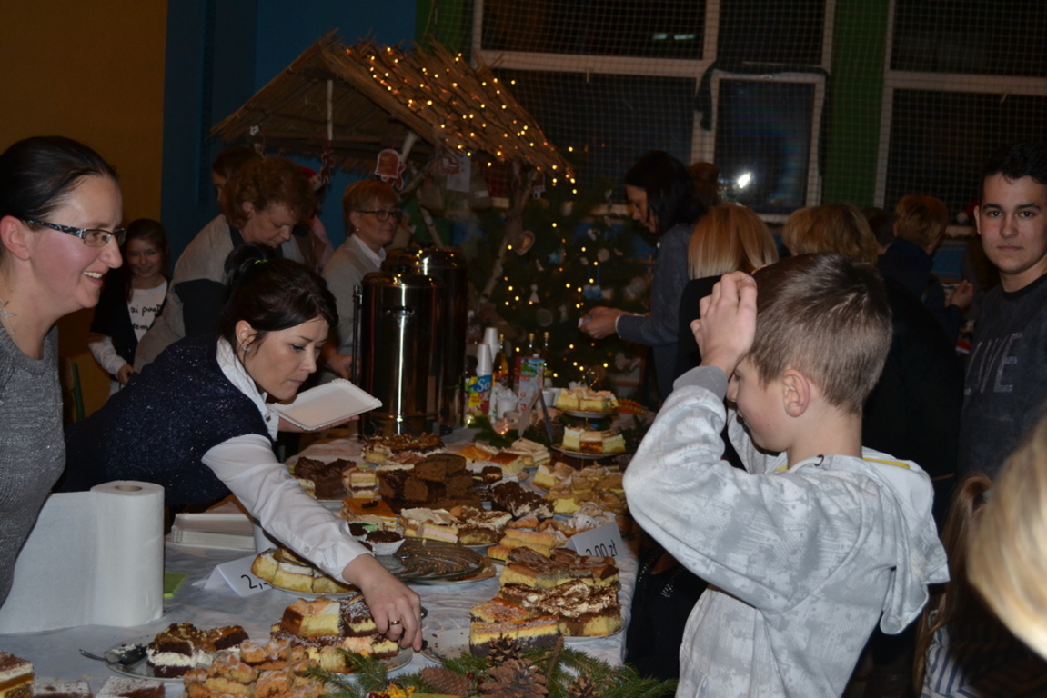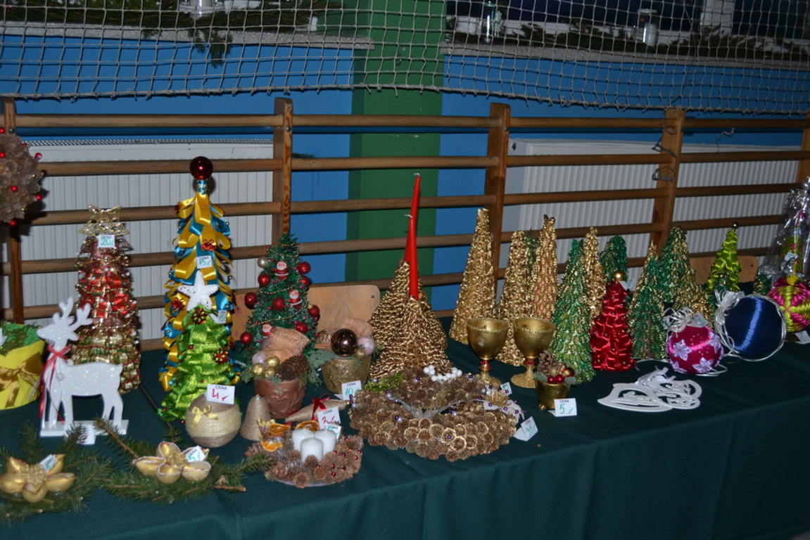 Na sali gimnastycznej udekorowanej według projektu p. Doroty Studzińskiej przygotowano stoiska świąteczne, a na nich barwne stroiki, choinki, kartki świąteczne, ozdoby z papieru, filcu, szyszek, makaronu, dekoracje wykonywane rozmaitymi technikami: szydełkowane, malowane, klejone. Wszystkie bardzo pomysłowe, świadczące o wielkiej wyobraźni wykonawców. Obok znajdowały się stoiska z przygotowanymi przez rodziców ciastami, które cieszyły się wielkim uznaniem kupujących. Wszystkie te stanowiska obsługiwali nauczyciele oraz rodzice. Nie mniejszym powodzeniem cieszyło się stoisko harcerzy. Przygotowali oni pieczone na grillu ziemniaki z różnorodnymi dodatkami oraz serwowali prawdziwy barszcz i przygotowane przez p. Labudę pierogi, a obok popcorn.