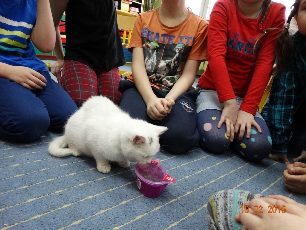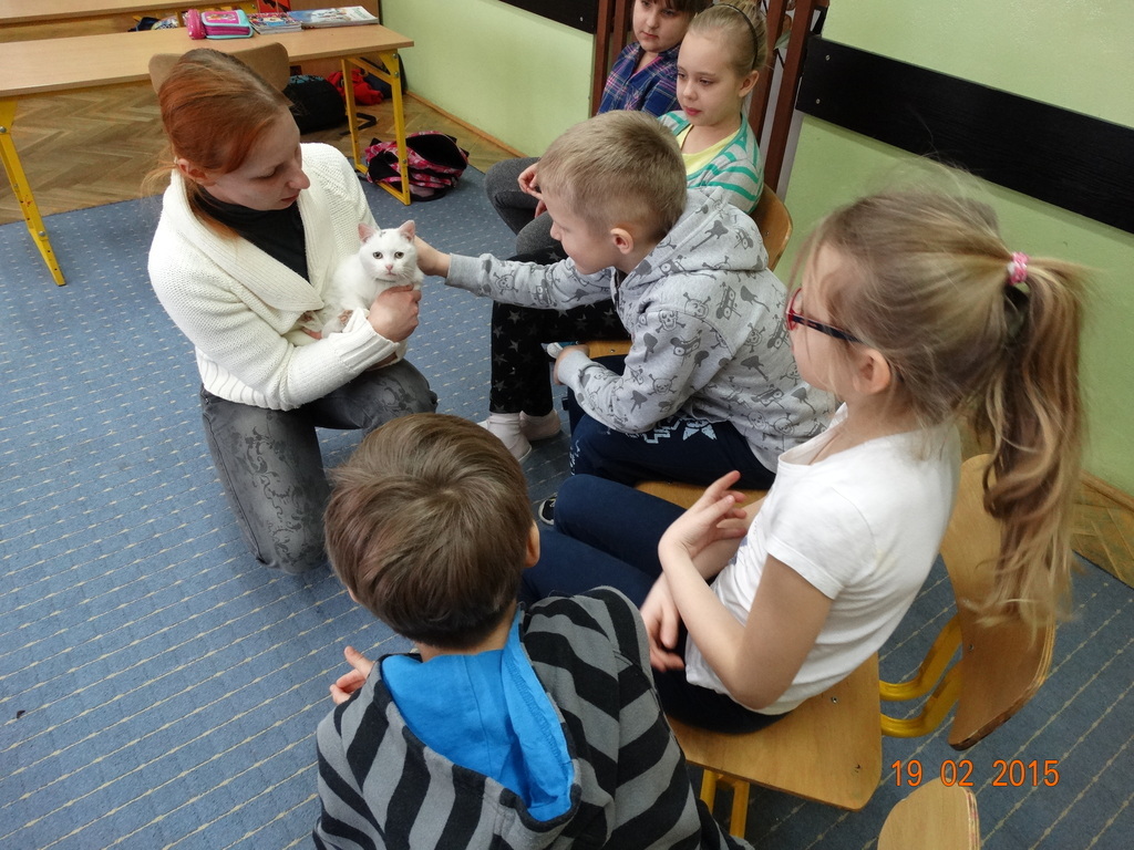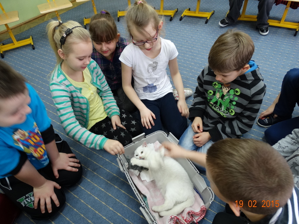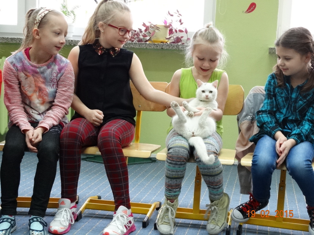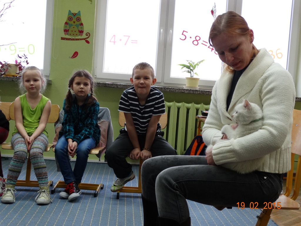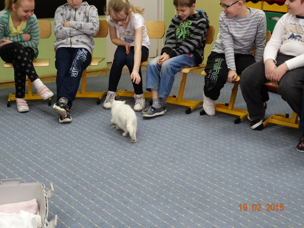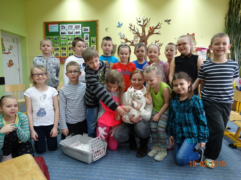 Dziś gościliśmy w klasie 2 panią Sylwię - mamę Lenki z ..... Zenobią :) Zenobia to śnieżnobiały, wesoły kotek. Pani Sylwia odwiedziła nas w ramach cyklu spotkań "Ciekawe zawody i hobby naszych rodziców" - opowiedziała nam o swojej pasji - hodowli kotów. Dzieci z zaciekawieniem słuchały o różnych zwyczajach kotów - tych szczególnych indywidualistów. Największą frajdę sprawiła dzieciom jednak zabawa z Zenobią.