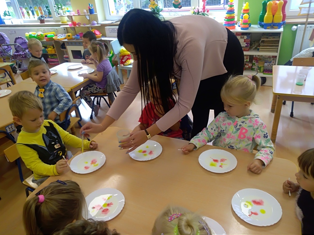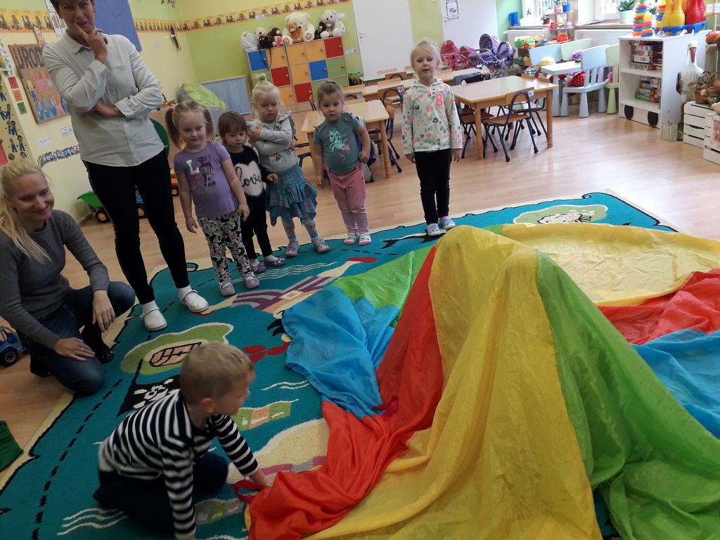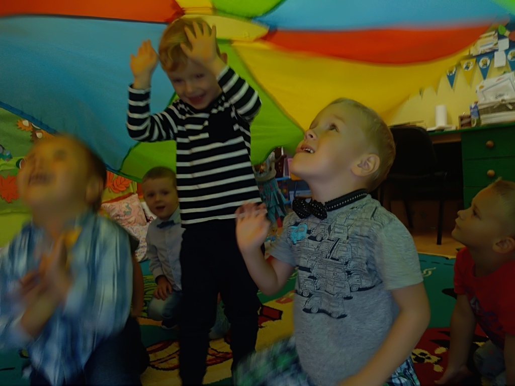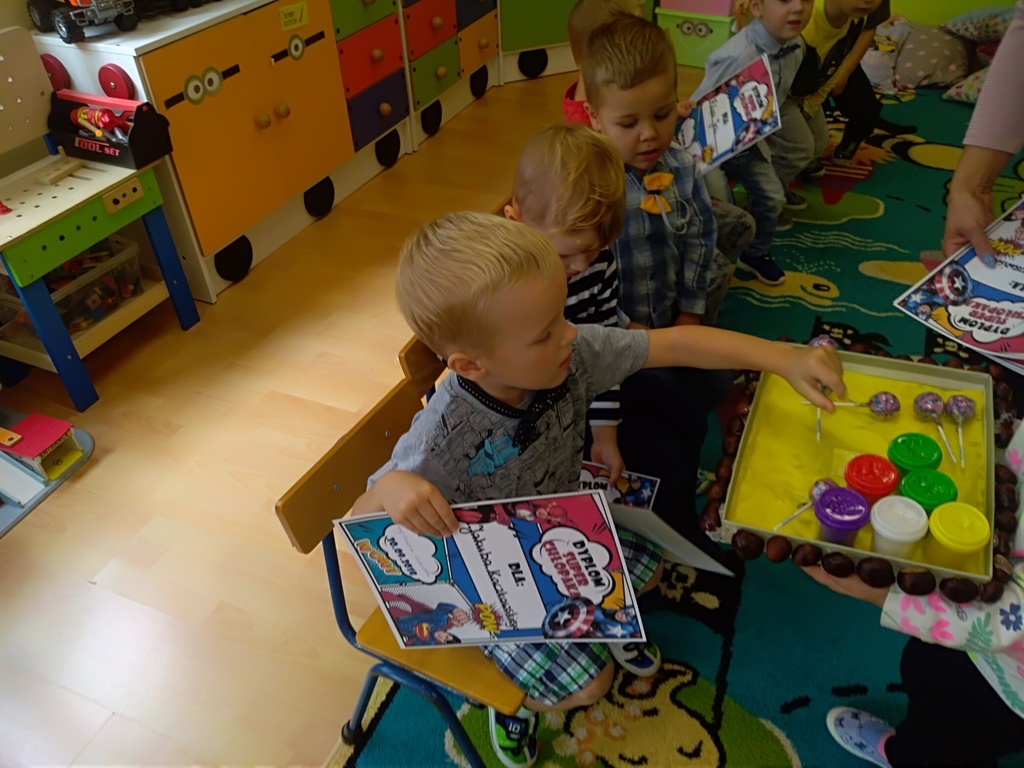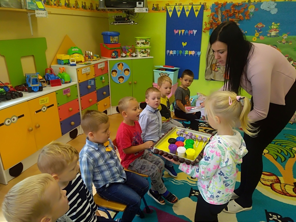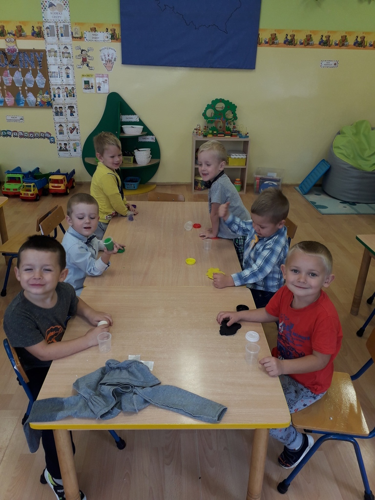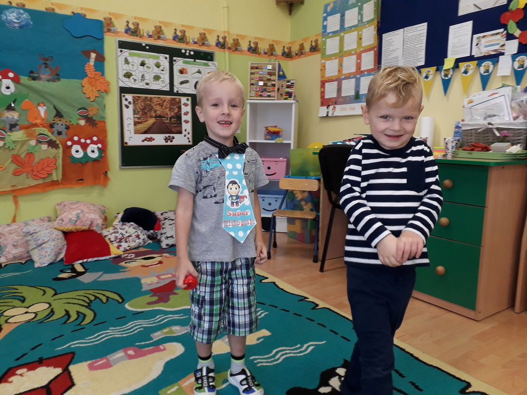 Pierwszy dzień października w najmłodszej grupie przedszkolnej rozpoczął się bardzo wesoło. Tego dnia odbyły się zabawy integracyjne przy użyciu chusty Klanzy, kolorowe eksperymenty, malowanie na mleku i tańce. Dziewczynki wykonały dla chłopców SUPER krawaty i nie mogło się obejść bez drobnych upominków, które sprawiły, że na twarzach naszych chłopaków pojawił się uśmiech od ucha do ucha.