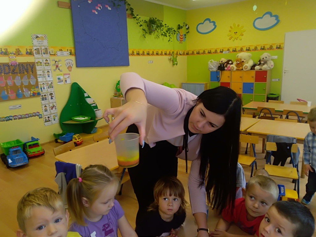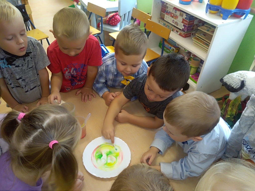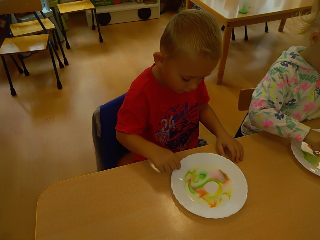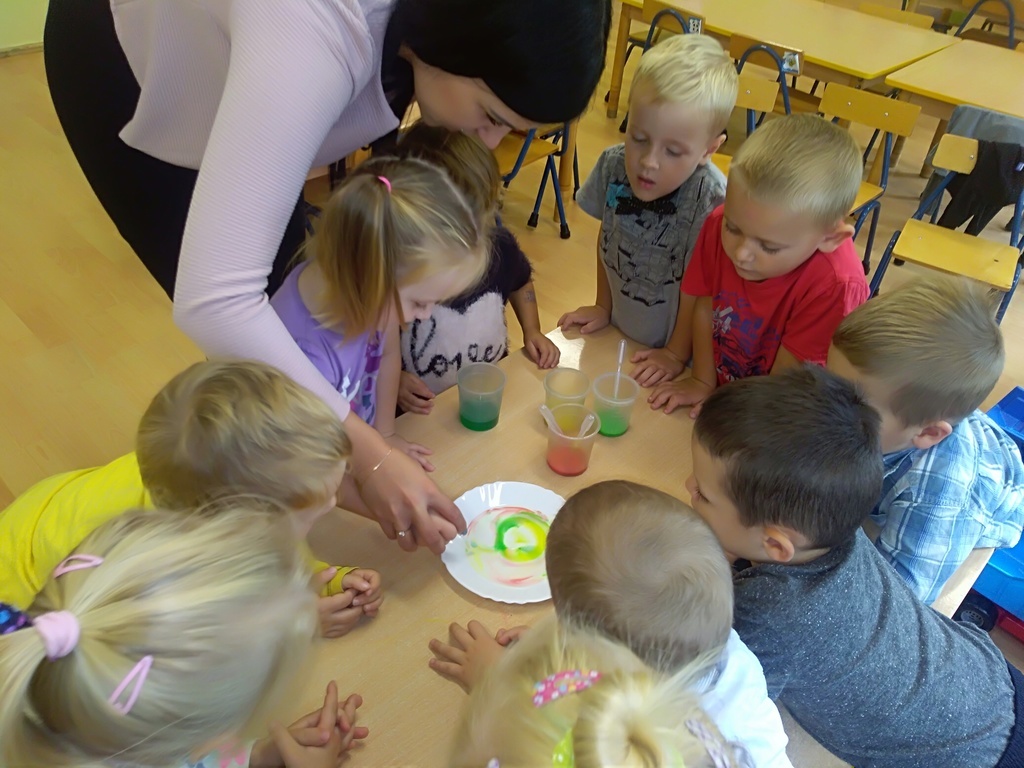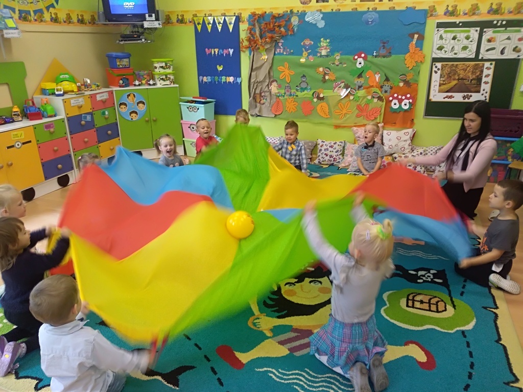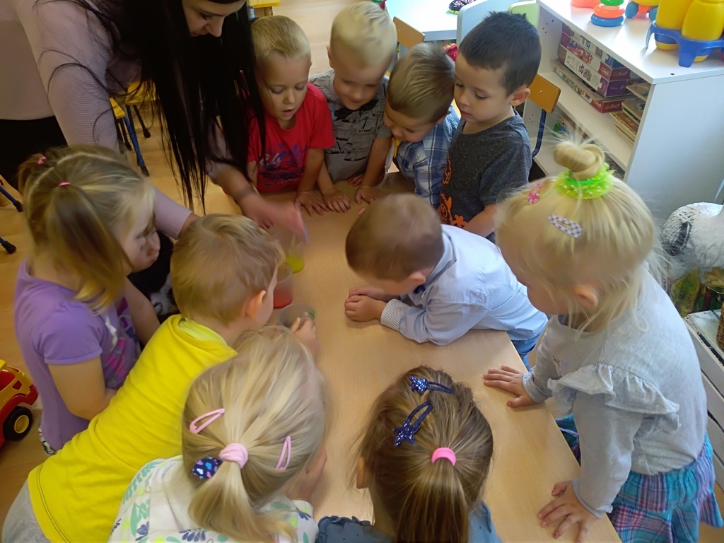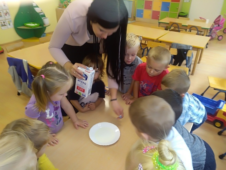 Pierwszy dzień października w najmłodszej grupie przedszkolnej rozpoczął się bardzo wesoło. Tego dnia odbyły się zabawy integracyjne przy użyciu chusty Klanzy, kolorowe eksperymenty, malowanie na mleku i tańce. Dziewczynki wykonały dla chłopców SUPER krawaty i nie mogło się obejść bez drobnych upominków, które sprawiły, że na twarzach naszych chłopaków pojawił się uśmiech od ucha do ucha.