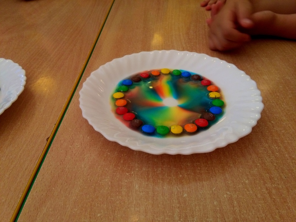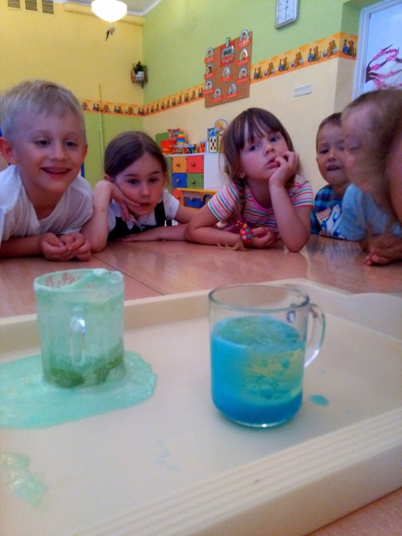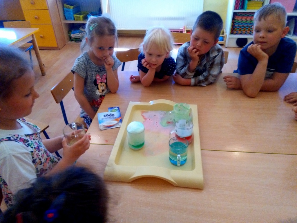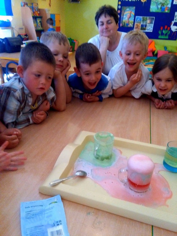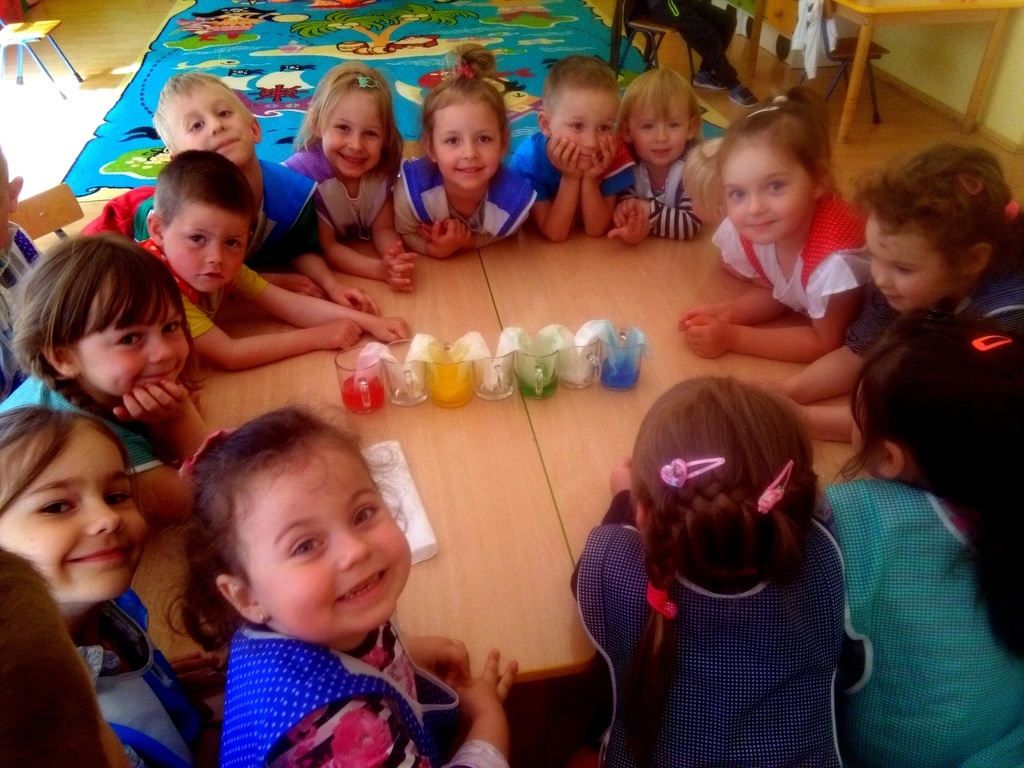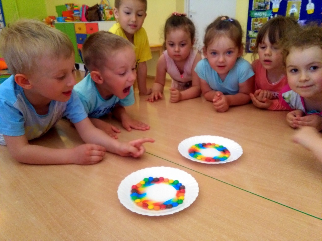 Przedszkolaki doskonale wiedzą kiedy na niebie możemy zobaczyć tęcze i jakie ma barwy. W przedszkolu dodatkowo mogły uzyskać odpowiedzi na często zadawane przez nich pytania: „Dlaczego?”, „Czemu?”, „Po co?”, „Jak?” itd. Pomocne tu były przeprowadzone zabawy badawcze. Dzieci z wielkim zaciekawieniem obserwowały mieszanie barwników, wędrówkę wody pomiędzy szklankami, która zmienia barwy oraz tęczę z kolorowych cukierków. Jednak największą euforię wywoływały te eksperymenty, które dawały szybki efekt tj. „magiczna piana”, „wulkan” czy „chemiczne jajo”.