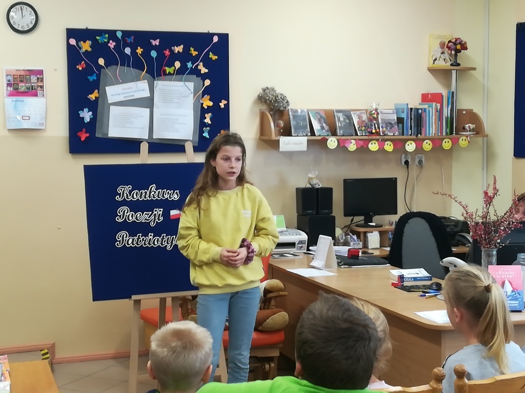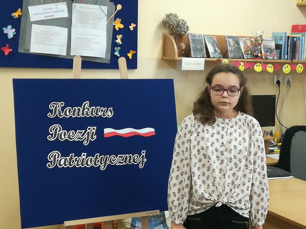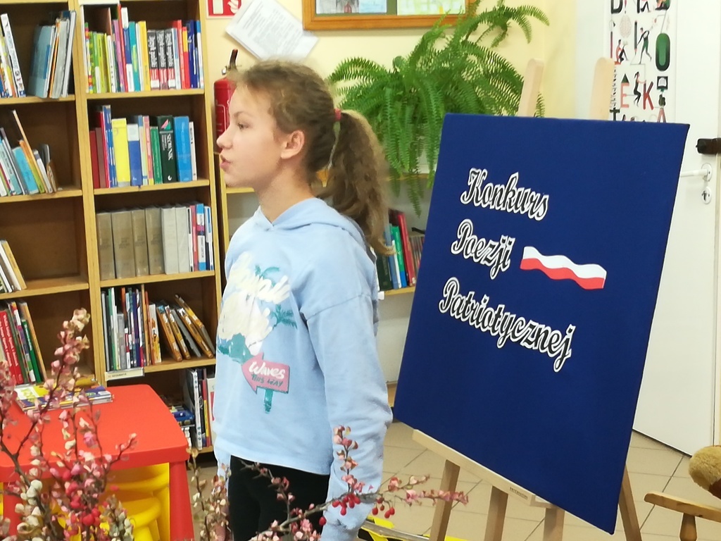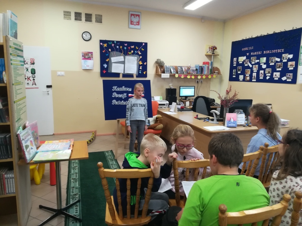 28 X w bibliotece odbyły się eliminacje do Powiatowego Konkursu Recytatorskiego Polskiej Poezji Patriotycznej organizowanego przez Szkole Podstawowej w Nowej Wsi Lęborskiej. Uczestnicy konkursu podzieleni byli na dwie kategorie wiekowe: uczniowie z klas IV-VI oraz z klas VII-VIII. Bardzo cieszył fakt, że mimo trudnej tematyki uczniowie bardzo poważnie podeszli do tego zadania i z przejęciem recytowali wiersze poetów polskich. Młodzi recytatorzy przygotowali do recytacji jeden utwór o tematyce patriotycznej wybierając poezję między innymi Tadeusza Różewicza, Antoniego Słonimskiego, Krzysztofa Kamila Baczyńskiego. Członkowie komisji stojąc przed trudnym zadaniem ocenienia recytacji wzięli pod uwagę dobór repertuaru, opanowanie pamięciowe tekstu, zaangażowanie emocjonalne i pomysłowość interpretacji.