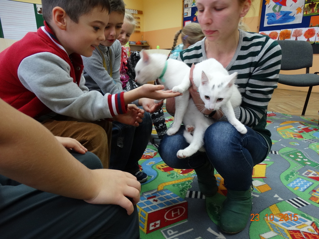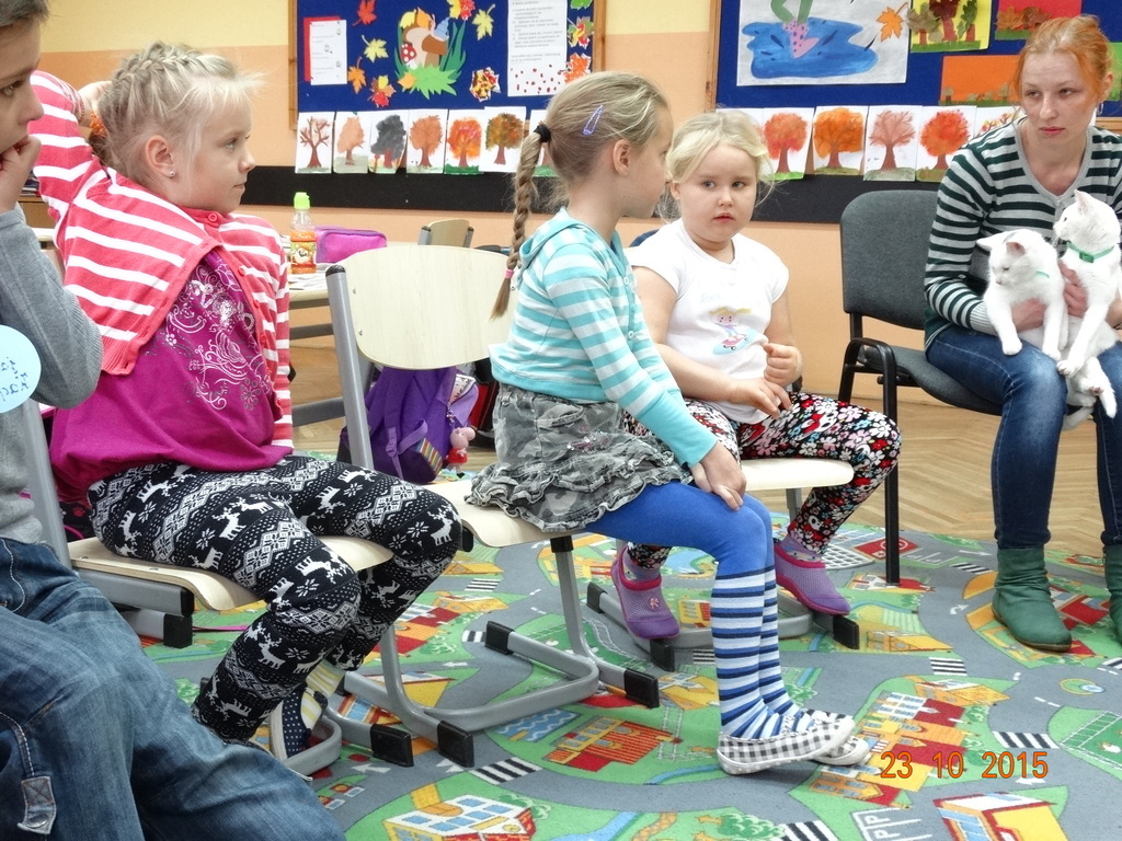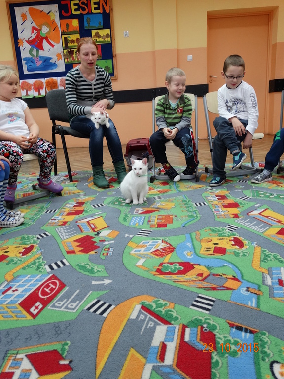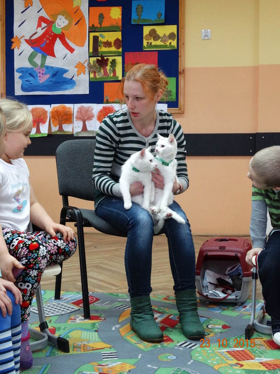 Dziś u pierwszaków byli niezwykli goście - pani Sylwia Miler - Piankowska z Tereską i Henią. Tereska i Henia to dwa piękne śnieżnobiałe koty. Pierwszaki poznały literkę K jak kot i miały okazję porozmawiać z hodowcą kotów o opiece i zwyczajach kotów. Kotki dzielnie zniosły wizytę w obu klasach, a dzieci wysłuchały panią Sylwię z zainteresowaniem. Bardzo dziękujemy za ciekawą lekcję.