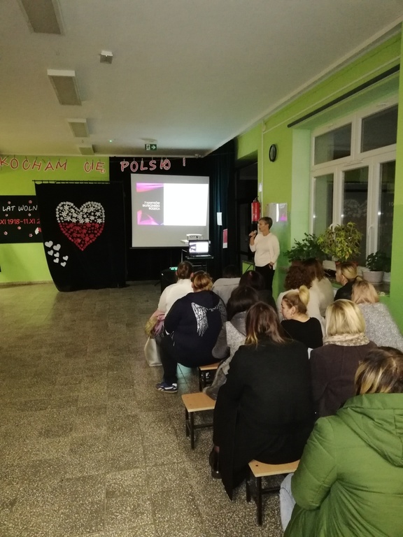 Prowadząca p. Katarzyna Płoska, pedagog, trener warsztatów profilaktycznych z Dialog Centrum Edukacji i Profilaktyki w Krakowie, uświadomiła słuchaczom jak ważna jest komunikacja z dzieckiem. Dzięki niej możemy ustrzec dziecko przed zachowaniami ryzykownymi. Podczas spotkania zostały również przedstawione rodzicom wyniki badań, które przeprowadził wśród uczniów zespół nauczycieli. Diagnoza dotyczyła określenia czynników ryzyka i czynników chroniących, które wpływają na poczucie bezpieczeństwa w środowisku szkolnym, dobre samopoczucie w szkole i relacje z rówieśnikami.