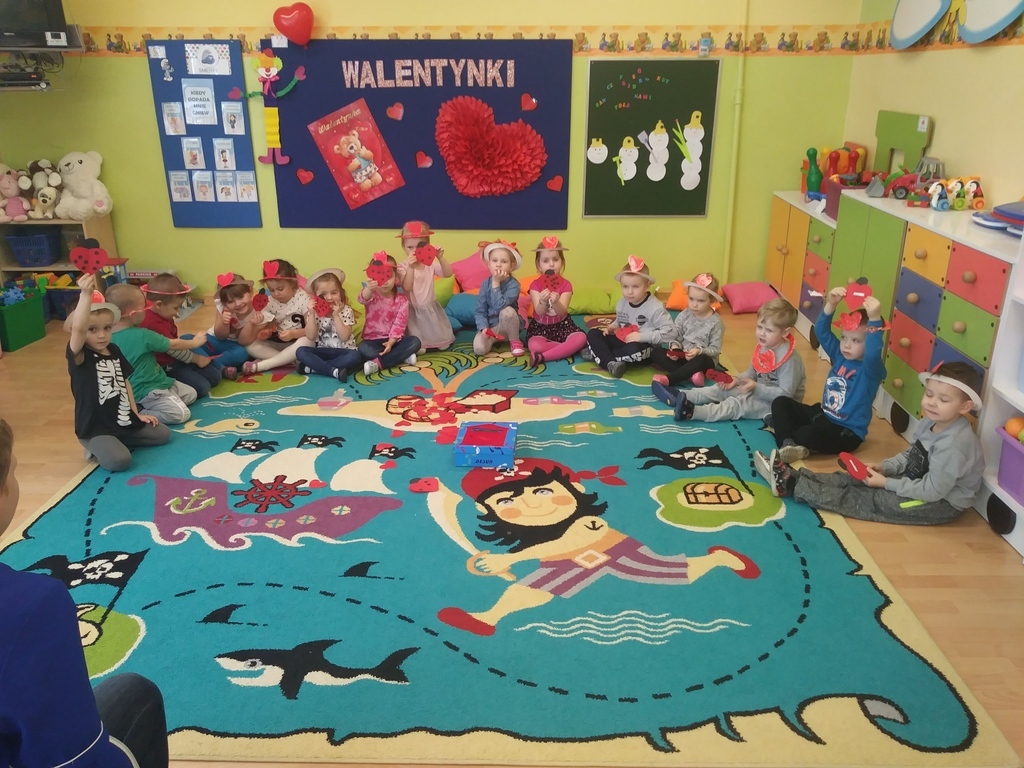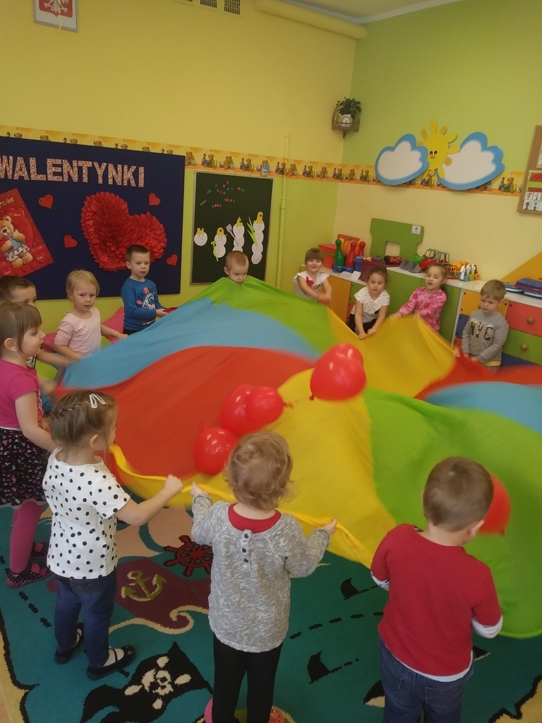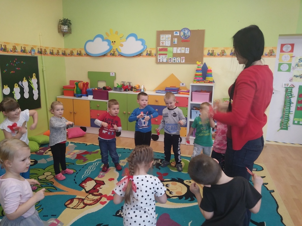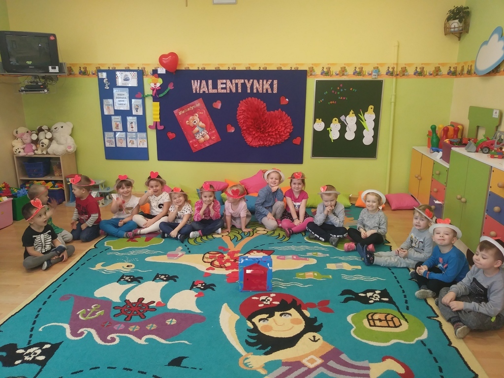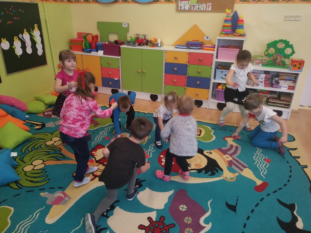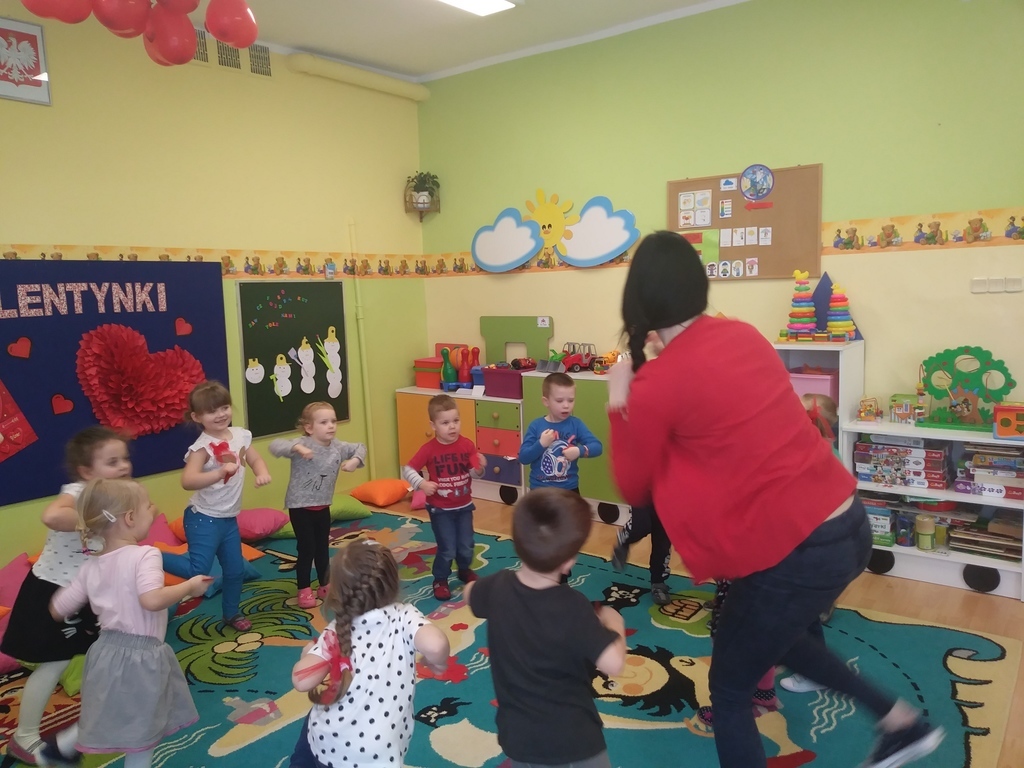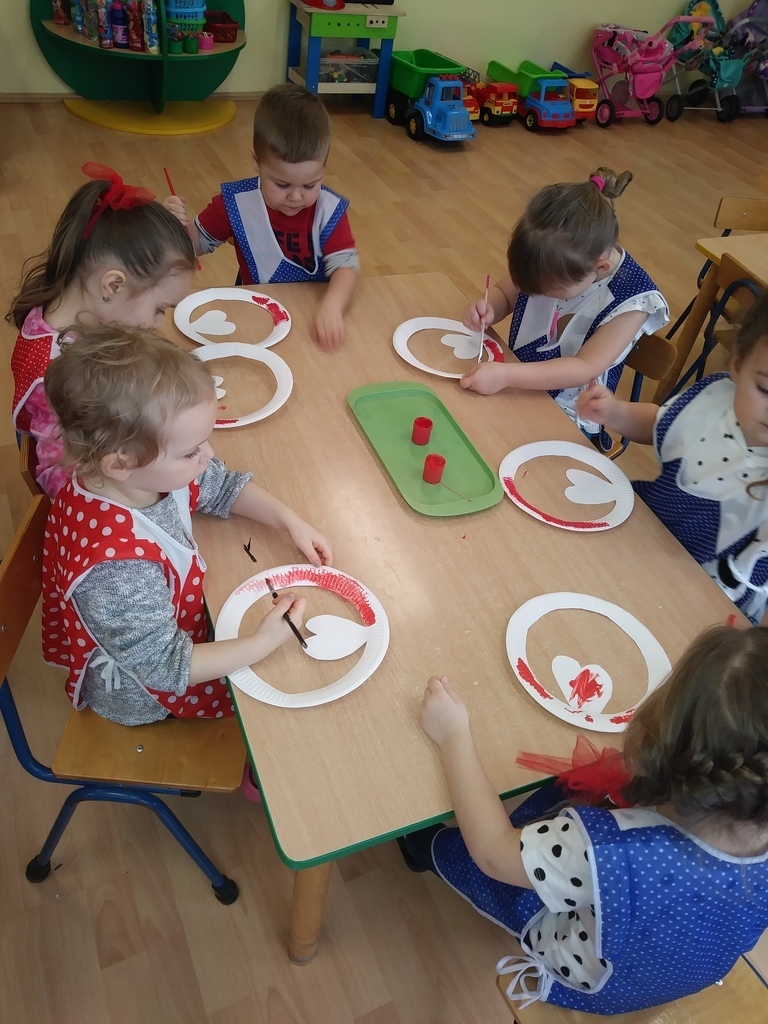 Walentynki dla maluszków były czerwonym dniem miłości i przyjaźni. Dzieci wzięły udział w różnych zabawach związanych z walentynkami m.in. walentynkowe memory, wykonanie walentynek dla kolegi, wrzucenie ich do skrzynki pocztowej, szalone tańce z serduszkami i balonami, mówienie swoim kolegom i koleżankom miłych słów. Nie zabrakło oczywiście sercowych kolorowanek, spontanicznych emocji oraz pozytywnych uczuć. Dzieci wykonały także piękne opaski z motywem przewodnim tego dnia- sercem.