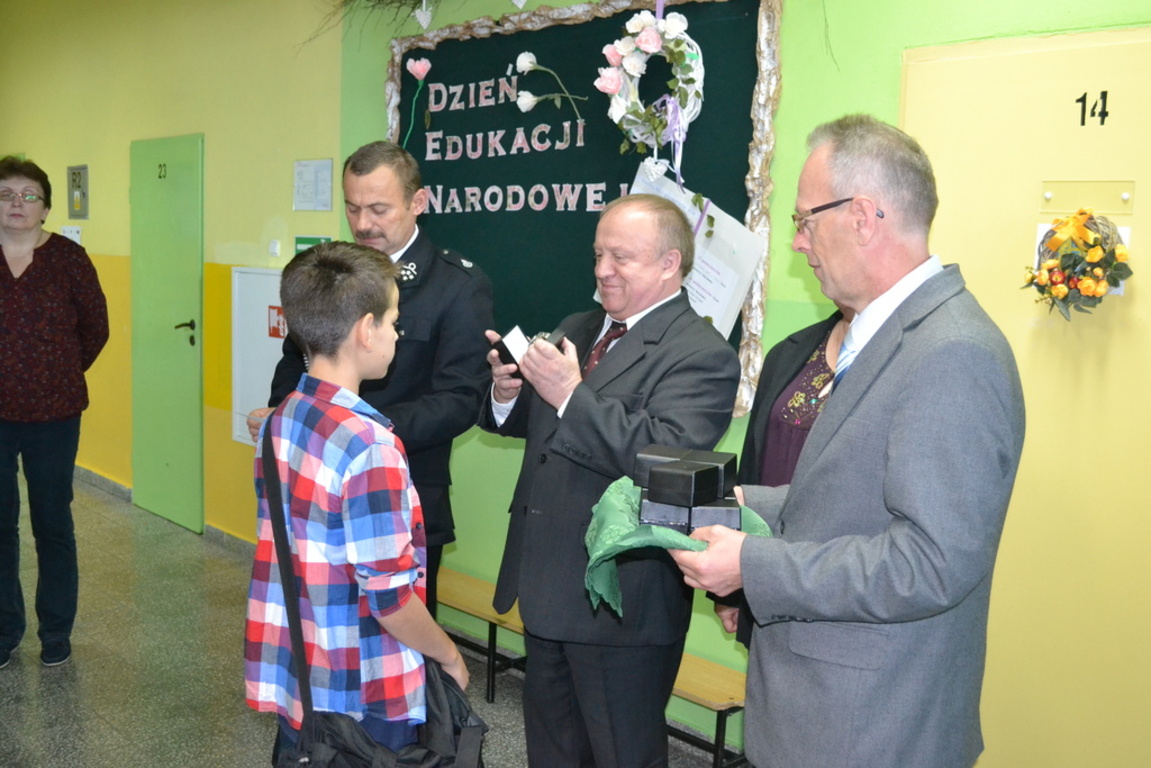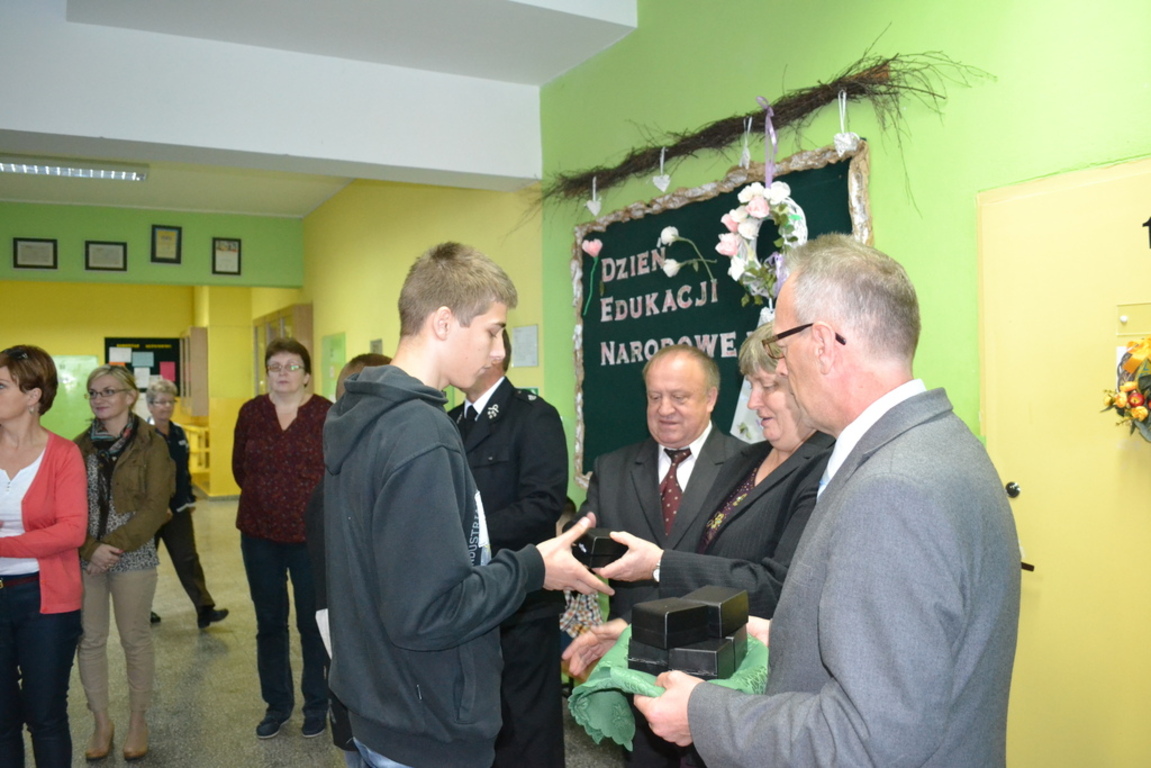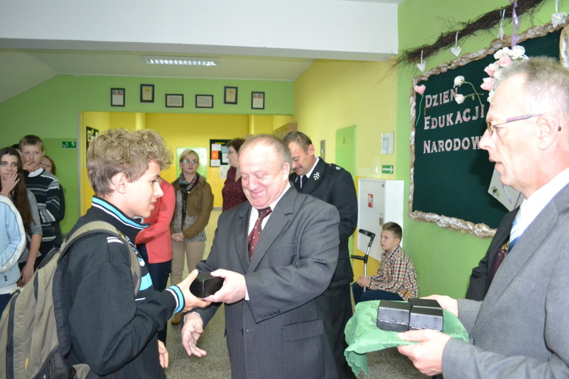 Z tej okazji gościliśmy w szkole Pana Ryszarda Wittke - wójta gminy, Pana Andrzeja Zająca - prezesa OSP Łebień oraz sołtys Łebienia - Panią Elżbietę Religa. Goście wręczyli młodym strażakom upominki.