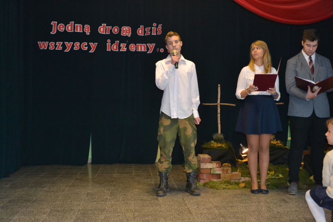 Uroczystość rozpoczęła się wprowadzeniem sztandaru szkoły oraz wspólnym odśpiewaniem hymnu państwowego. Mottem uroczystości były słowa Jana Pawła II: ,,Jedną drogą dziś wszyscy idziemy''. Scenariusz obejmował treści historyczne, pieśni oraz wiersze. Uczniowie za pomocą symboli i krótkiej inscenizacji przedstawili losy naszej Ojczyzny, począwszy od zaborów, a skończywszy na roku 1918.