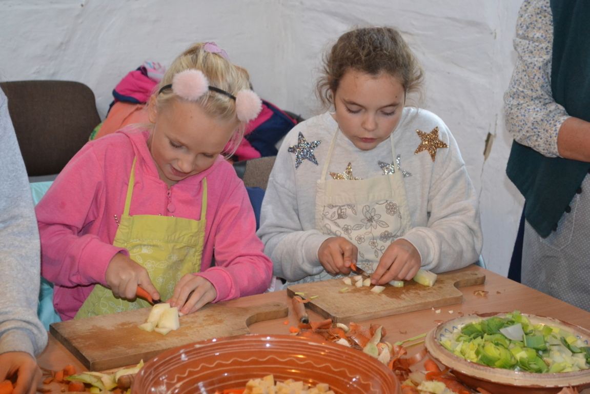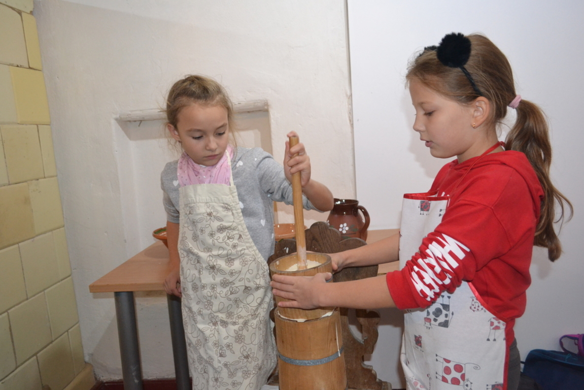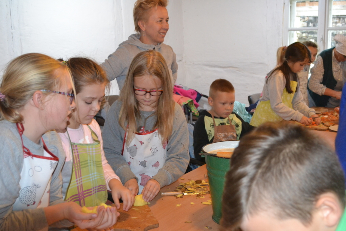 w przygotowaniu posiłku obierając warzywa na zupę jarzynową, ubijały masło. Uczniowie pracowali pod czujnym okiem pracowników skansenu. Potem obie grupy miały okazję zwiedzić urządzenie chat i poznać historię ich mieszkańców. Tymczasem bardzo życzliwe panie gotowały i piekły,