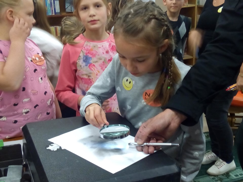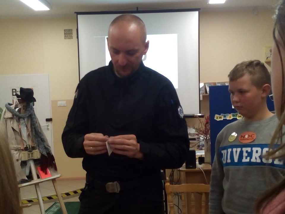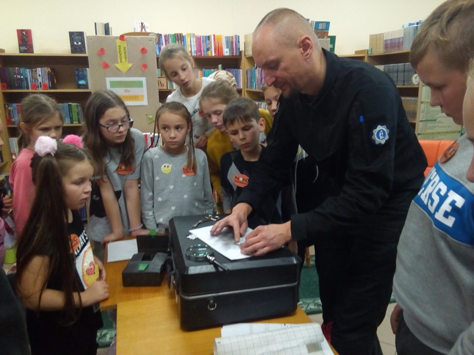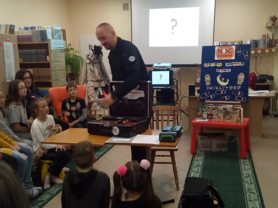 To pierwsza taka niezwykła noc w naszej bibliotece - "NOC BIBLIOTEK". Zainspirowani książkami Pana Martina Widmarka przenieśliśmy się w świat detektywów i zagadek kryminalnych. Organizatorem akcji była Pani Kasia z Biblioteki Publicznej w Łebieniu. Gościem specjalnym był Pan Marcin Majchrzak - technik kryminalistyki i jednocześnie pasjonat swojego zawodu. Dziękujemy bardzo Panu Marcinowi za niezwykle interesujący wykład. Dziękujemy również Panu Krzysztofowi Wojtysiakowi Dyrektorowi Zespołu Szkół im. Jana Pawła II w Łebieniu oraz Pani Renacie Stolickiej nauczycielowi bibliotekarzowi biblioteki szkolnej za to, że byli z nami do samego końca czyli do rana i razem z Panią Katarzyną Oleksiuk sprawowali opiekę nad nami. Brawa należą się również Pani Kamilli Knap - Wrześniewskiej dyrektor Biblioteki Publicznej Gminy Nowa Wieś Lęborska oraz mamie uczestników Pani Magdalenie Flisikowskiej za aktywny udział w spotkaniu oraz za przygotowanie przepysznej kolacji. Największe podziękowania należą się jednak naszym młodym detektywom - za chęć uczestnictwa w spotkaniu i za to, że WYTRWALIŚCIE DO RANA