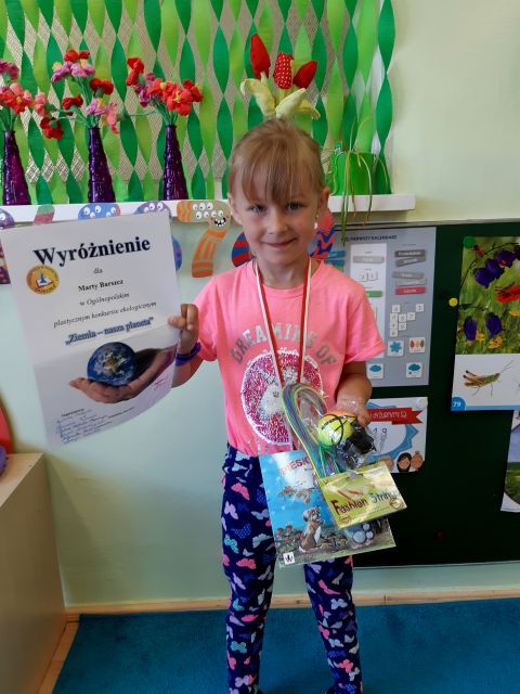 Praca plastyczna Marty Barszcz została wyróżniona w Ogólnopolskim konkursie ekologicznym pt. "Ziemia - nasza planeta" organizowanym przez Przedszkole "Bajeczka" w Rokietnicy. Pracę można było wykonać dowolną techniką - Marta malowała na cukrze. Gratulujemy!