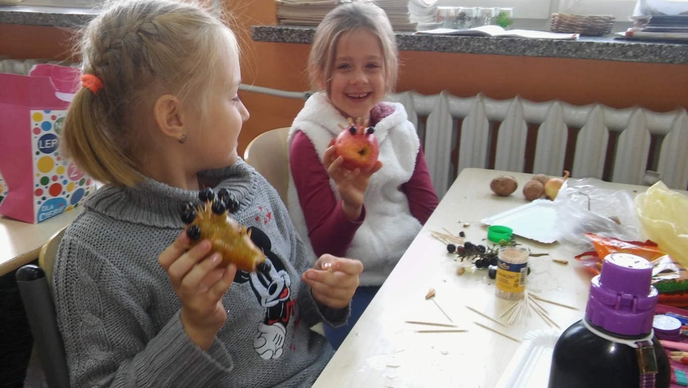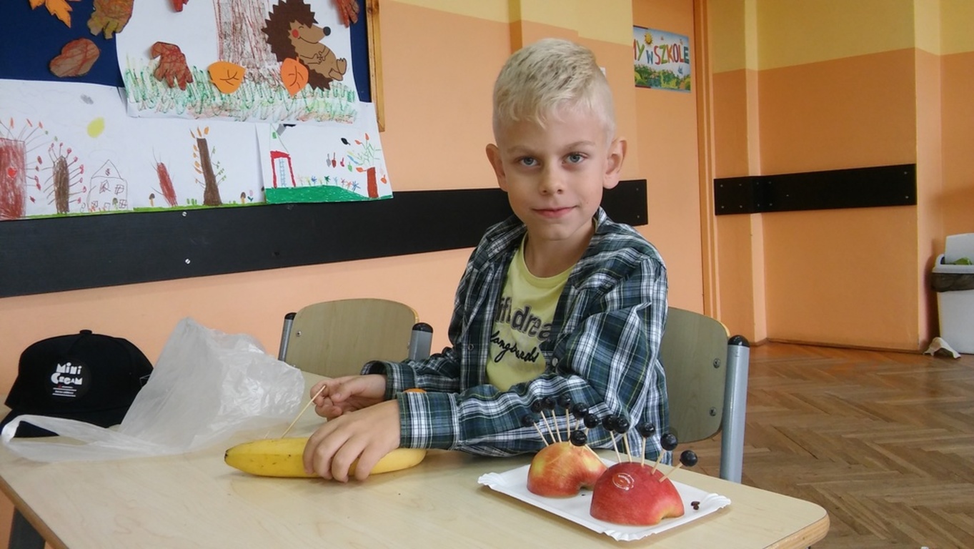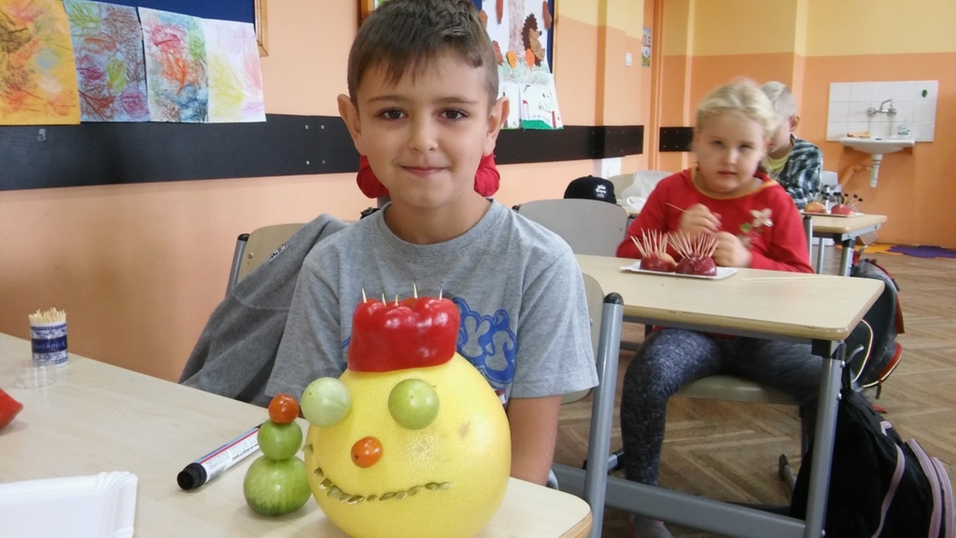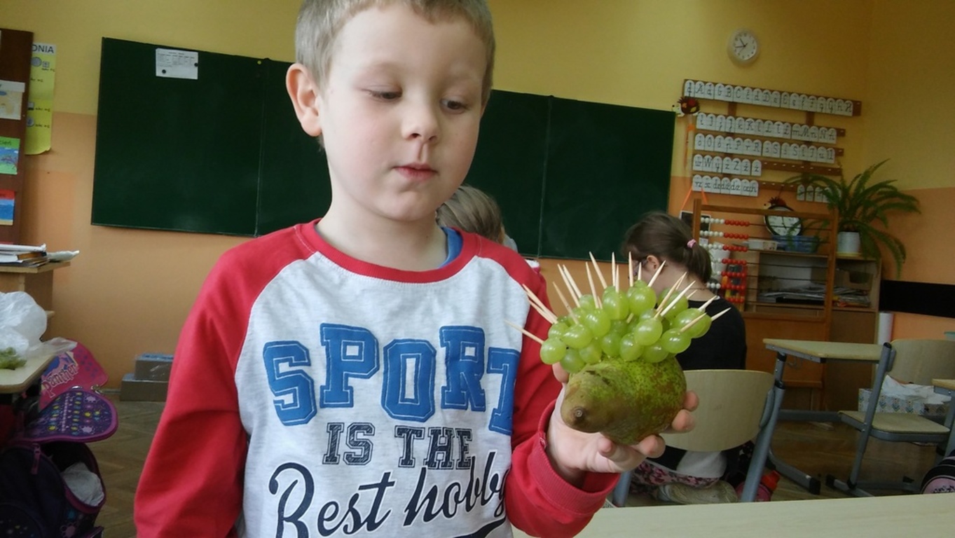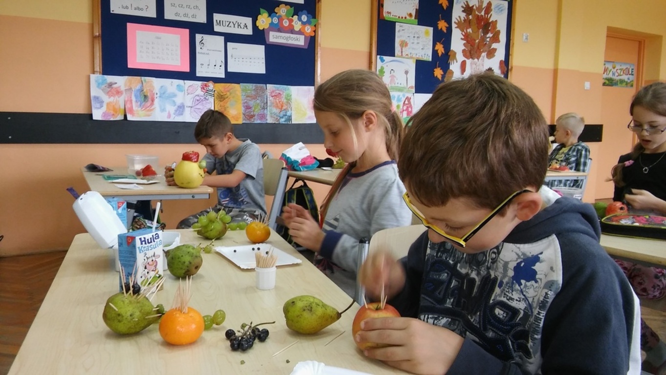 Jesień, to nie tylko piękne kolorowe liście, grzyby, kasztany i żołędzie; jesień to również moc owoców i warzyw. Na ostatnich zajęciach technicznych, uczniowie z klasy II a zrobiły z owoców i warzyw śmieszne i kolorowe "zwierzaki - cudaki". Przypomnieliśmy sobie przy okazji jak wiele jest witamin w owocach i warzywach oraz jak ważne jest spożywanie ich właśnie w okresie jesiennym.