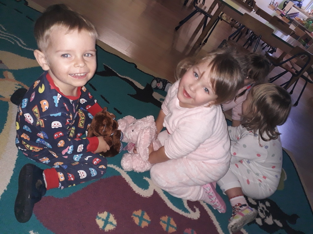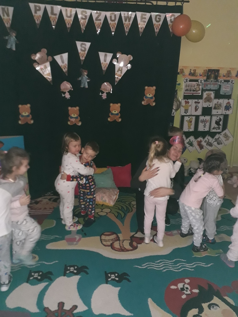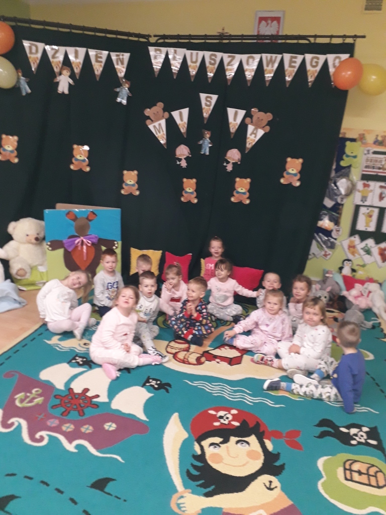 25 listopada z okazji Międzynarodowego Dnia Pluszowego Misia najmłodsza grupa przedszkolna do przedszkola zawitała w piżamkach, jednakże tego dnia spać nikomu się nie chciało. Maluszki na początku wysłuchały historii o powstaniu pierwszego misia, dowiedziały się jak wyglądały misie dawniej, a jak teraz. W wielu zabawach wykorzystywaliśmy swoje, przyniesione z domu pluszowe misie, wskazywaliśmy ich części ciała, które były wymienione w wierszu, tańczyliśmy z nimi, usypialiśmy, przytulaliśmy, a na sam koniec budziliśmy. Towarzyszyły nam one przez cały dzień. Nie zabrakło ,,misiowej muzyki”, która dzieciom bardzo się podobała. Dzieci także wysłuchały historii misia Psotnisia, który rozpalił w lesie ognisko. Na szczęście z pomocą wyruszyły Misie Ratownisie. Każdy maluch stał się strażakiem i pędził na pomoc .