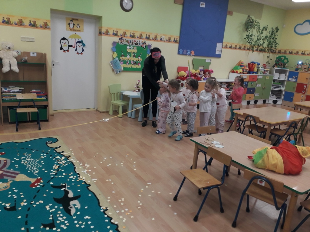 Zabawy z chustą animacyjną , tańce przy kolorowych światełkach , zdjęcia w ,,misiowej” fotobudce, a nawet malowanie szablonu misia sprawiło naszym pingwinkom wiele radości. Była zabawa na całego. Wszystkie dzieci zasłużyły na medale i dyplomy.