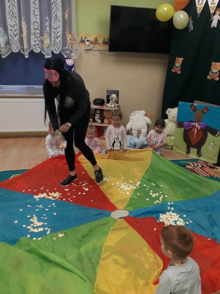 Zabawy z chustą animacyjną , tańce przy kolorowych światełkach , zdjęcia w ,,misiowej” fotobudce, a nawet malowanie szablonu misia sprawiło naszym pingwinkom wiele radości. Była zabawa na całego. Wszystkie dzieci zasłużyły na medale i dyplomy.