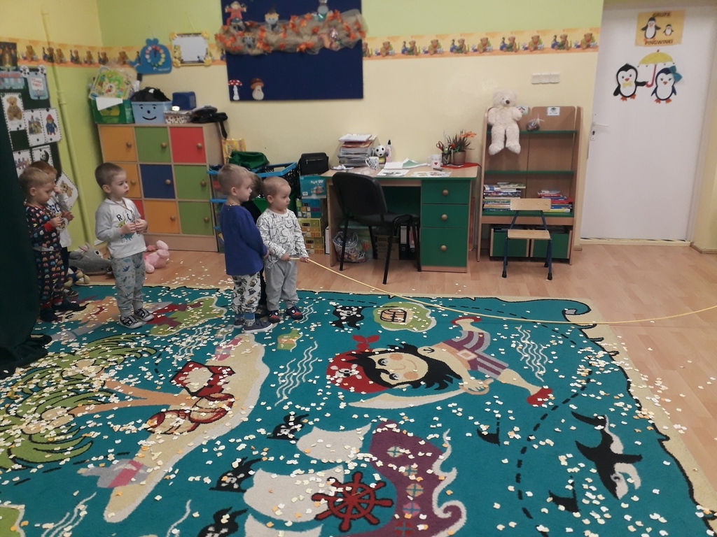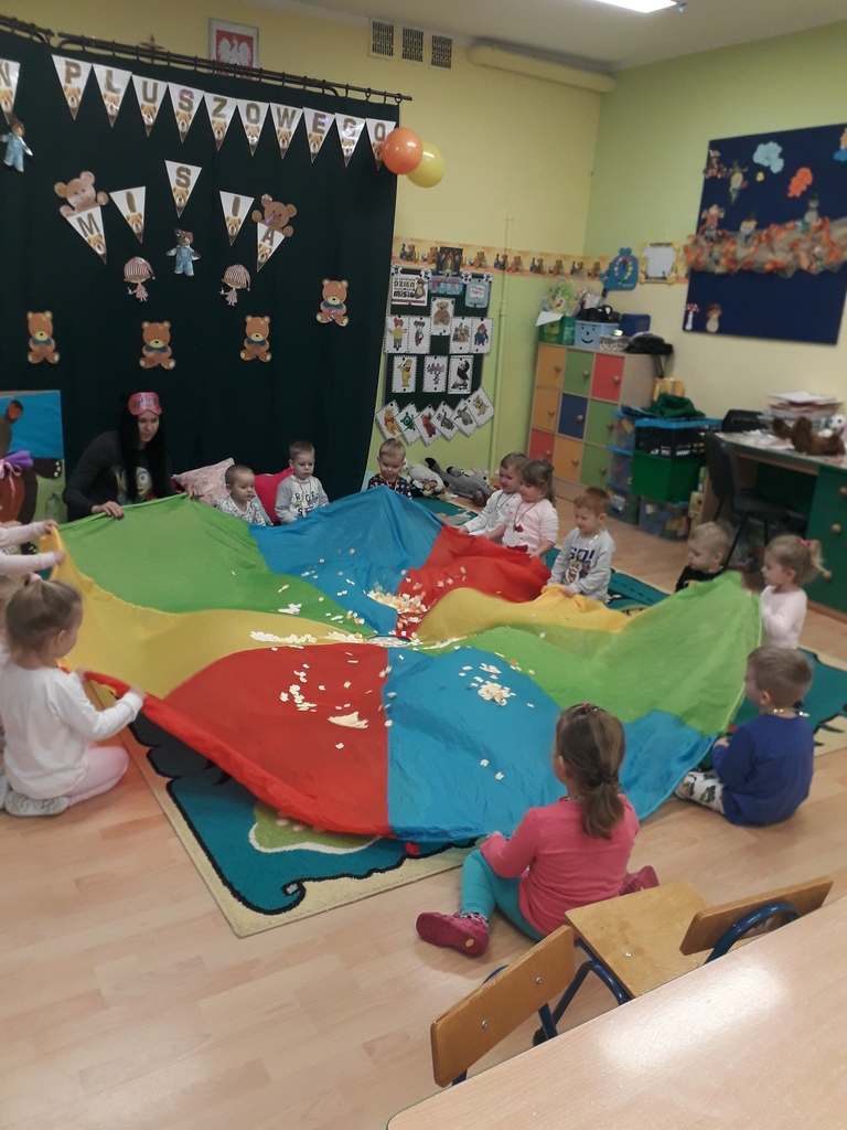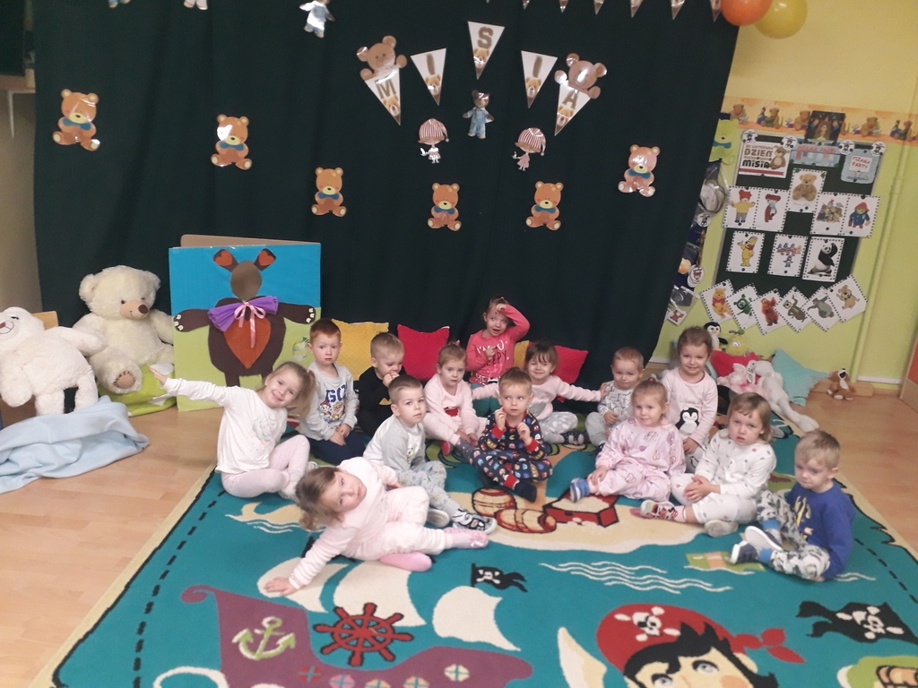 25 listopada z okazji Międzynarodowego Dnia Pluszowego Misia najmłodsza grupa przedszkolna do przedszkola zawitała w piżamkach, jednakże tego dnia spać nikomu się nie chciało. Maluszki na początku wysłuchały historii o powstaniu pierwszego misia, dowiedziały się jak wyglądały misie dawniej, a jak teraz. W wielu zabawach wykorzystywaliśmy swoje, przyniesione z domu pluszowe misie, wskazywaliśmy ich części ciała, które były wymienione w wierszu, tańczyliśmy z nimi, usypialiśmy, przytulaliśmy, a na sam koniec budziliśmy. Towarzyszyły nam one przez cały dzień. Nie zabrakło ,,misiowej muzyki”, która dzieciom bardzo się podobała. Dzieci także wysłuchały historii misia Psotnisia, który rozpalił w lesie ognisko. Na szczęście z pomocą wyruszyły Misie Ratownisie. Każdy maluch stał się strażakiem i pędził na pomoc .
