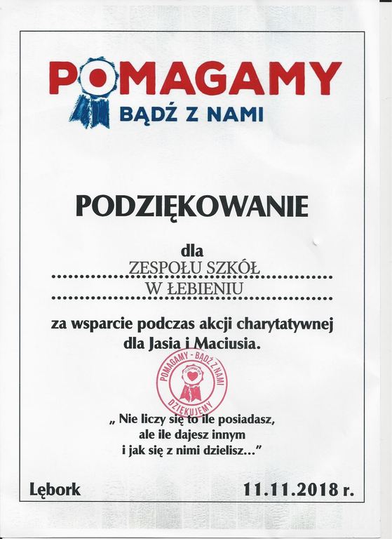 Z całego serca DZIĘKUJEMY naszym uczniom i rodzicom za wsparcie akcji charytatywnej "Pomagamy bądź z nami", która odbyła się w Lęborku 11 listopada 2018r., na rzecz rodziny poszkodowanej w pożarze.