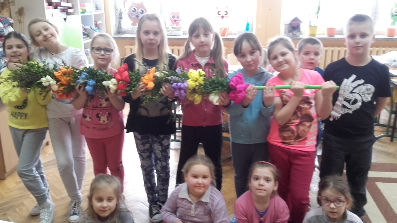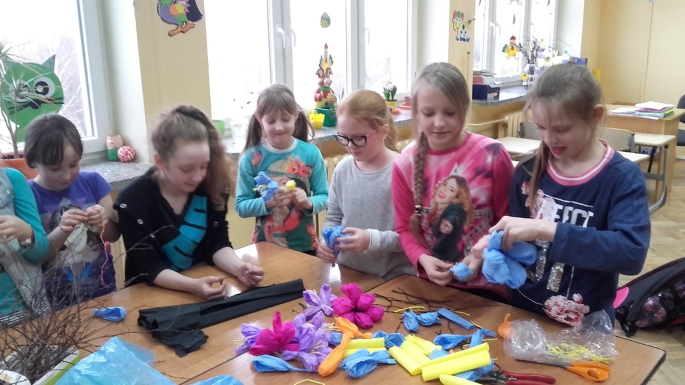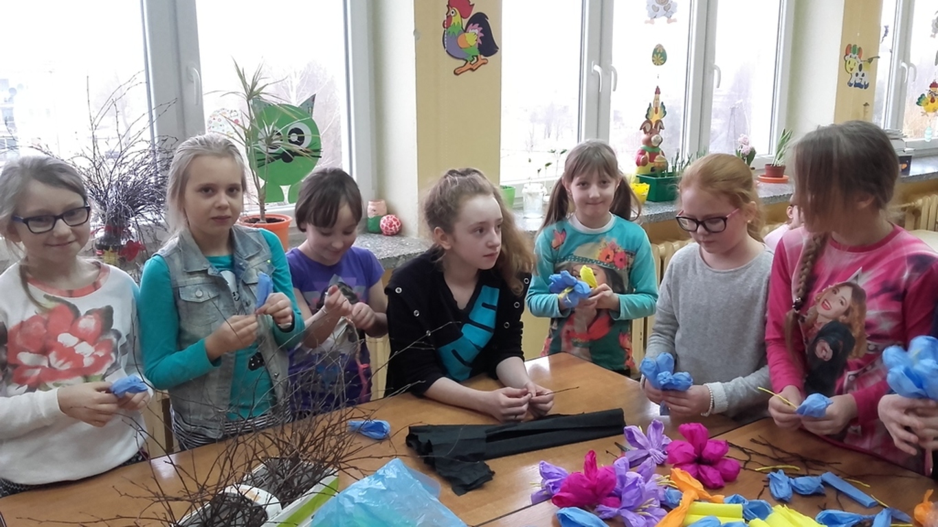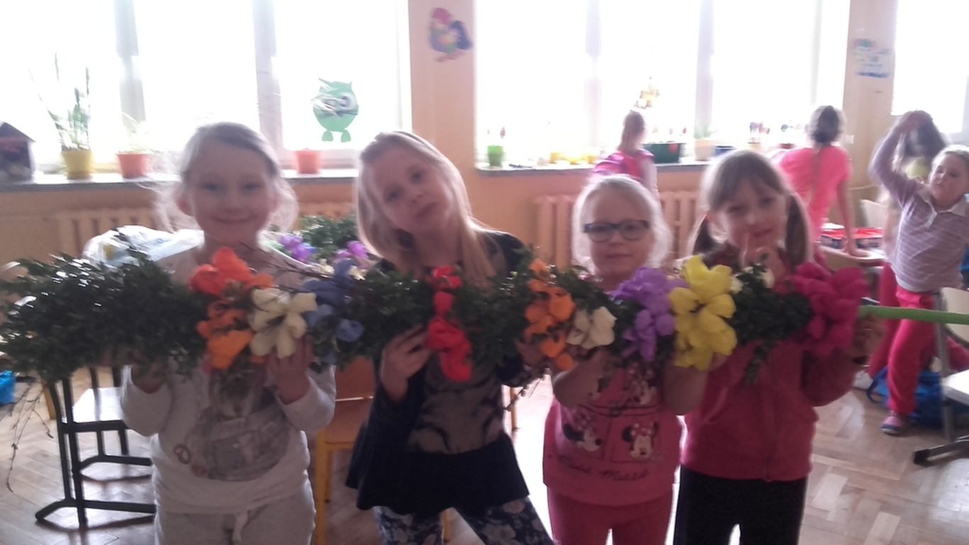 Ostatnie dni przed Niedzielą Palmową były bardzo pracowite. Dzieci przy pomocy wychowawców świetlicy z dużym zaangażowaniem robiły wspólnie palmę wielkanocną, wykonaną z ręcznie robionych kwiatów z bibuły, gałązek bukszpanu i bazi.