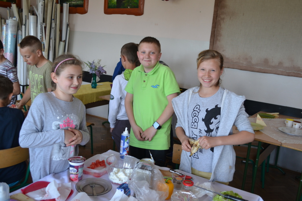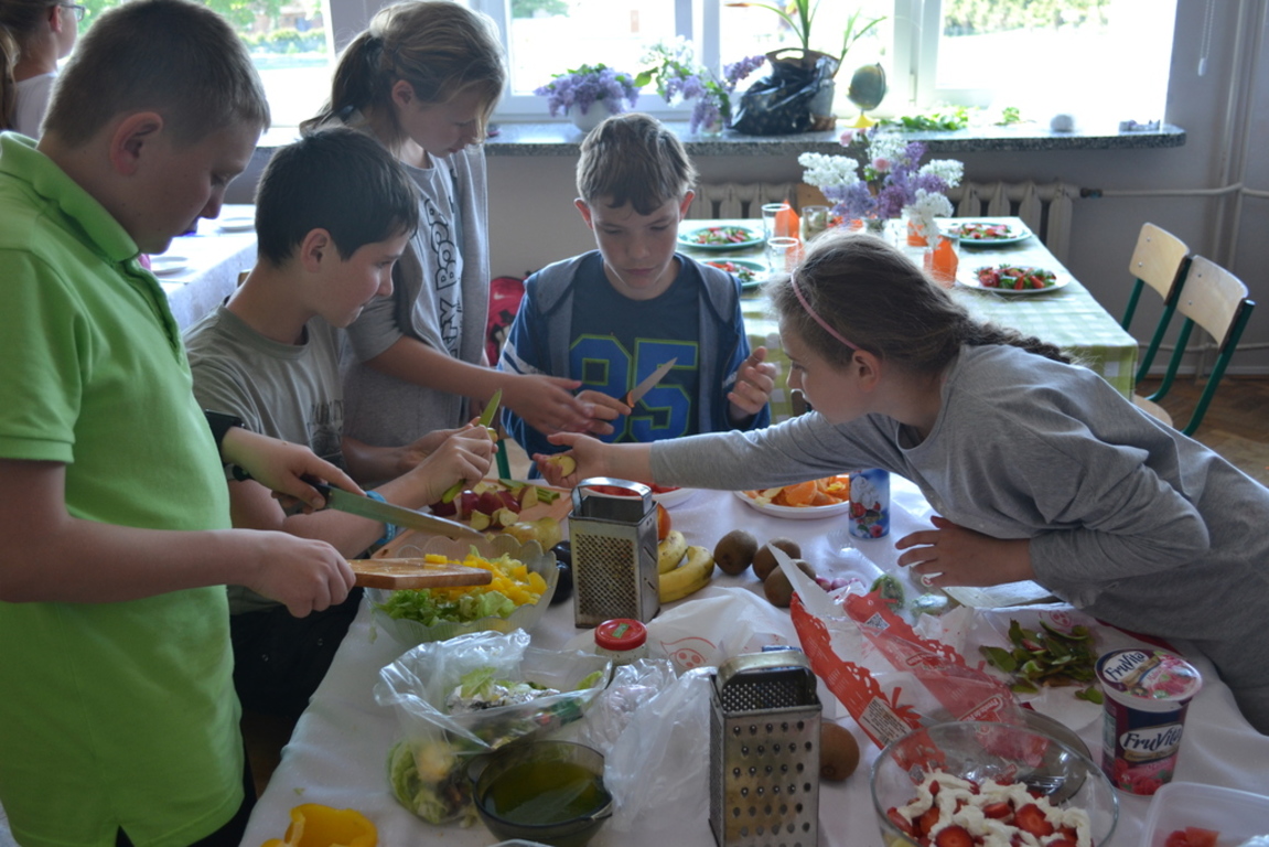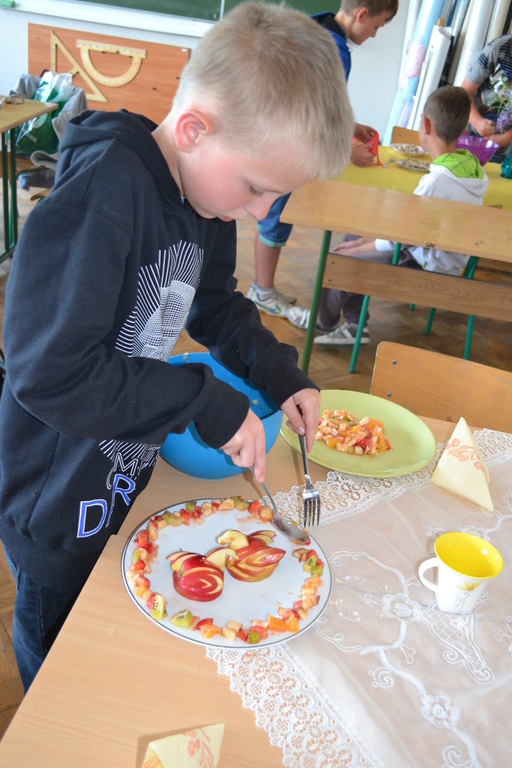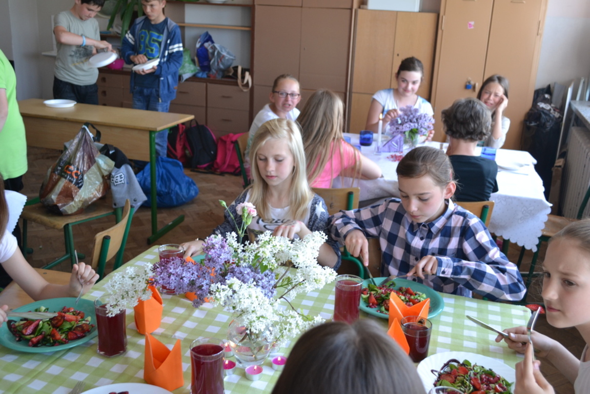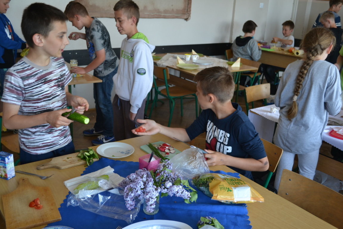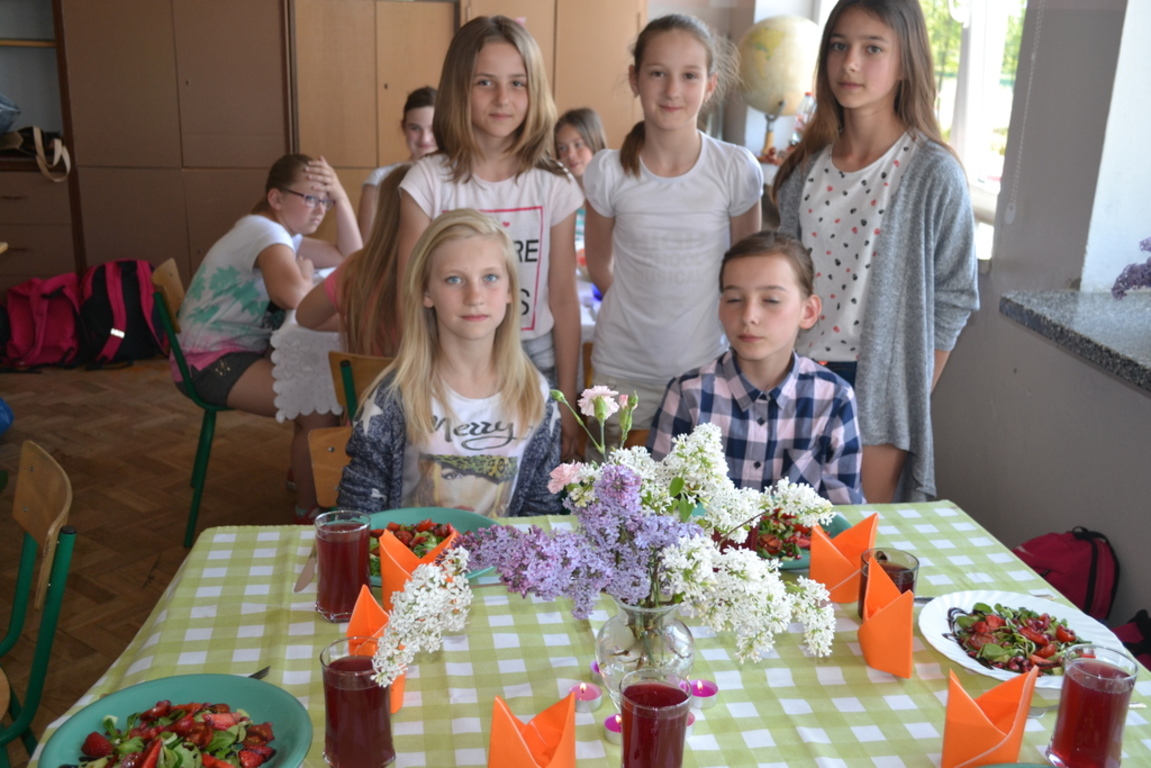 Uczniowie klasy V po skończonym dziale z „Odżywiania” omawianym na lekcji techniki, zakończonym sprawdzianem, pochwalili się swoimi zdolnościami kulinarnymi na miarę Masterchefa juniora. Przygotowali w grupach wybrane przez siebie sałatki. Można było spróbować sałatki owocowej, jarzynowej, sałatki z feta, z rucollą i truskawkami, z groszkiem i grzankami. Na ocenę wpływał nie tylko smak sałatki ale także, porządek podczas jej wykonywania, przestrzeganie zasad bhp i sposób jej podania. Dodatkowym akcentem były dekoracje stołów. Zajęcia odbywały się pod opieką p. D. Studzińskiej, która była pod wrażeniem talentu uczniów.