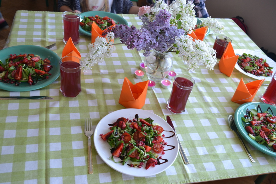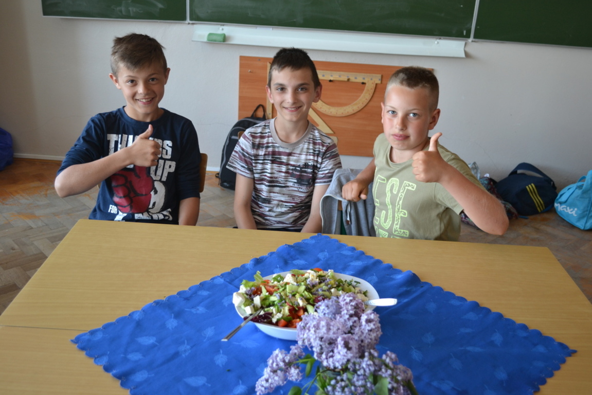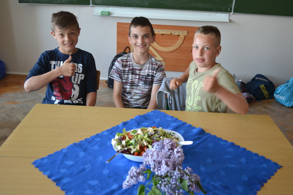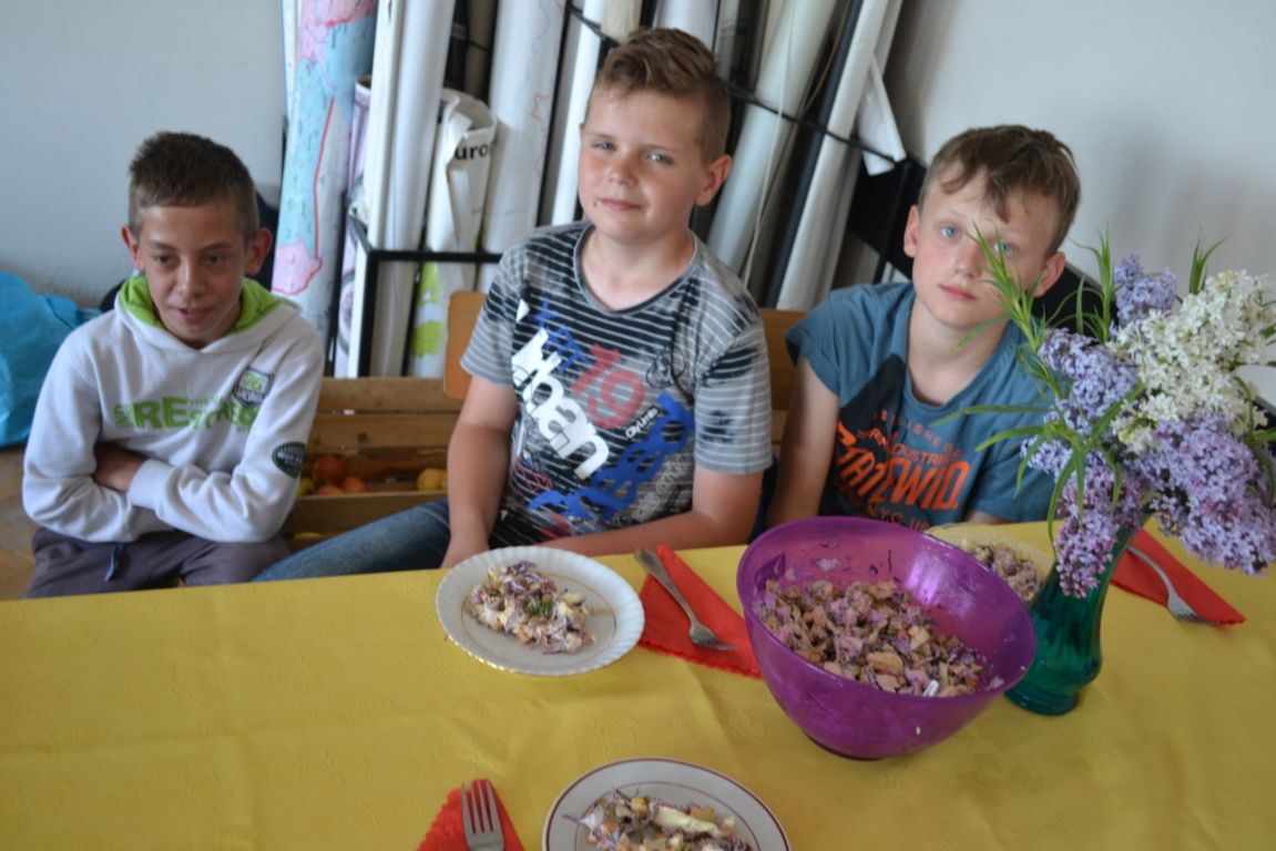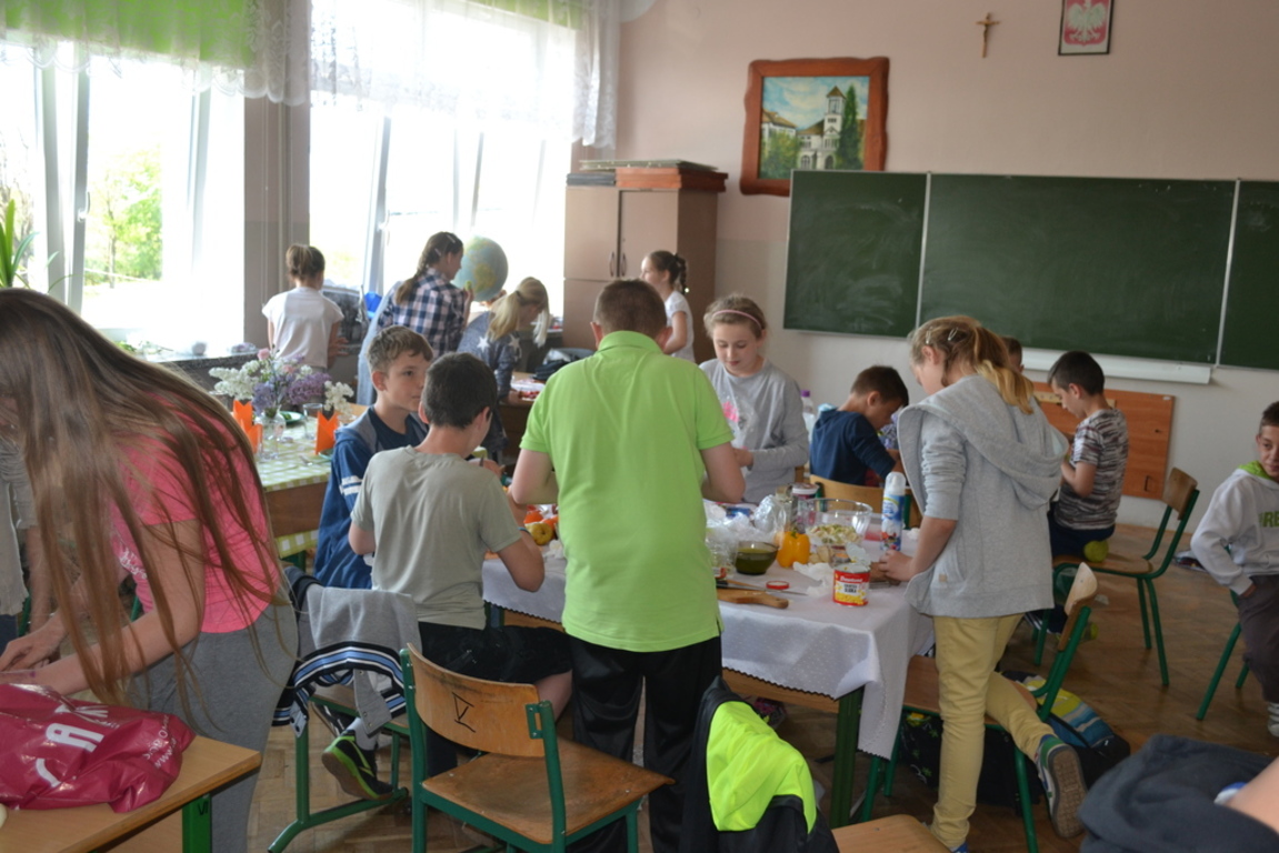 Uczniowie klasy V po skończonym dziale z „Odżywiania” omawianym na lekcji techniki, zakończonym sprawdzianem, pochwalili się swoimi zdolnościami kulinarnymi na miarę Masterchefa juniora. Przygotowali w grupach wybrane przez siebie sałatki. Można było spróbować sałatki owocowej, jarzynowej, sałatki z feta, z rucollą i truskawkami, z groszkiem i grzankami. Na ocenę wpływał nie tylko smak sałatki ale także, porządek podczas jej wykonywania, przestrzeganie zasad bhp i sposób jej podania. Dodatkowym akcentem były dekoracje stołów. Zajęcia odbywały się pod opieką p. D. Studzińskiej, która była pod wrażeniem talentu uczniów.