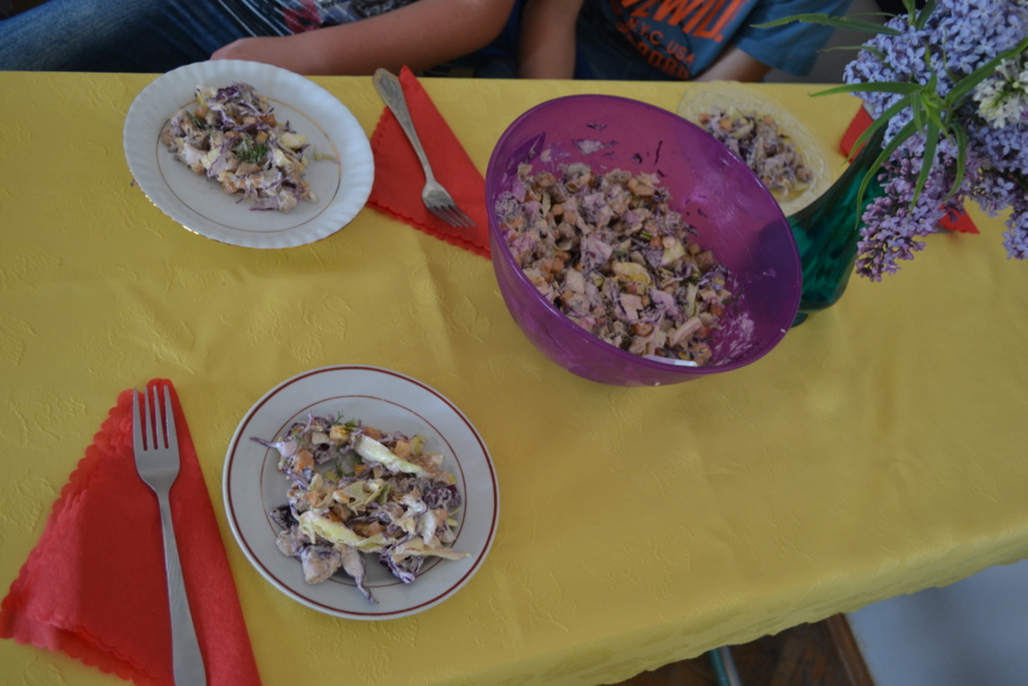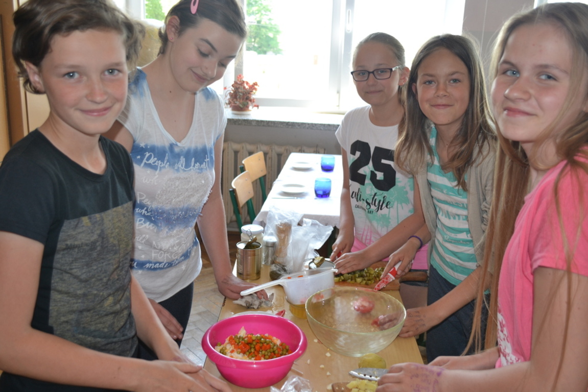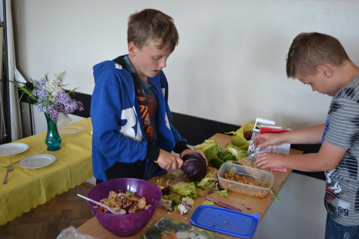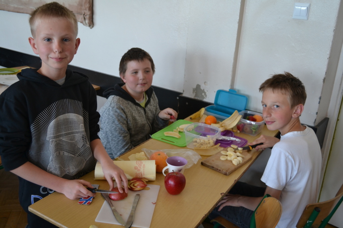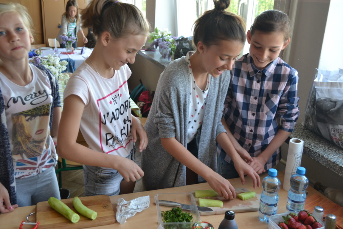 Uczniowie klasy V po skończonym dziale z „Odżywiania” omawianym na lekcji techniki, zakończonym sprawdzianem, pochwalili się swoimi zdolnościami kulinarnymi na miarę Masterchefa juniora. Przygotowali w grupach wybrane przez siebie sałatki. Można było spróbować sałatki owocowej, jarzynowej, sałatki z feta, z rucollą i truskawkami, z groszkiem i grzankami. Na ocenę wpływał nie tylko smak sałatki ale także, porządek podczas jej wykonywania, przestrzeganie zasad bhp i sposób jej podania. Dodatkowym akcentem były dekoracje stołów. Zajęcia odbywały się pod opieką p. D. Studzińskiej, która była pod wrażeniem talentu uczniów.