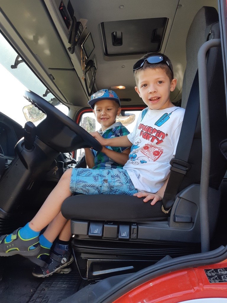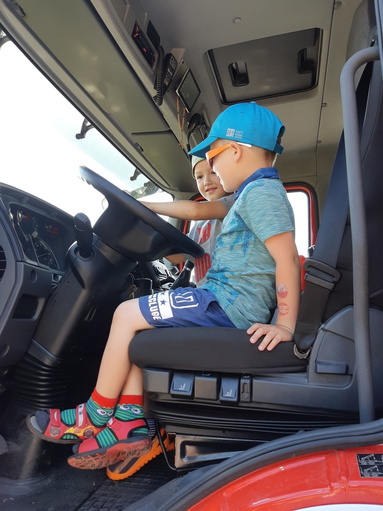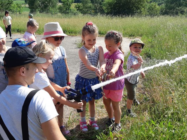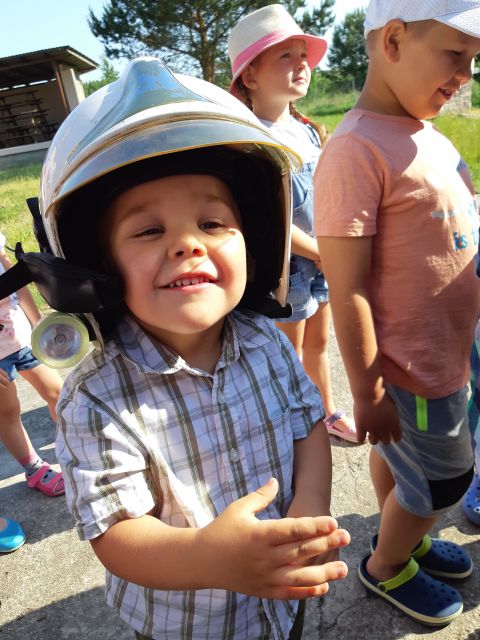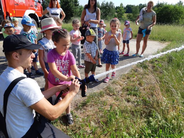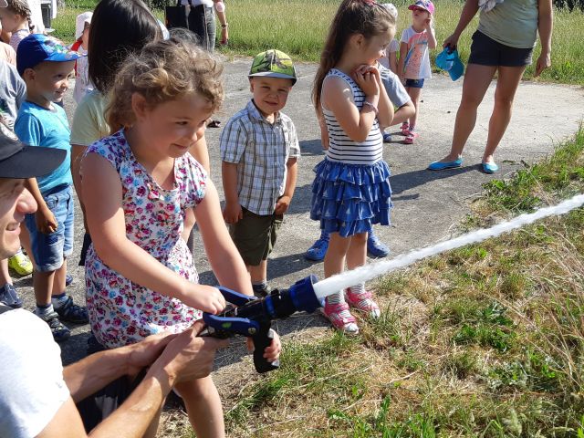1 czerwca to dla przedszkolaków długo wyczekiwany dzień. Dzieci z grupy ,,Smerfy” i ,,Pszczółki” obchodziły w przedszkolu Dzień Dziecka. Ten radosny dzień spędziliśmy na świeżym powietrzu. Dużą radość sprawiło przedszkolakom spotkanie z panami strażakami z OSP Łebień. Nasi goście opowiadali o swojej ciężkiej, ale jakże ważnej i odpowiedzialnej pracy, zaznajomili nas ze sprzętem ratowniczym, a także umożliwili nam obejrzenie pokazu zastosowania działka wodnego. Dzieci miały możliwość poczuć się choć przez chwilę jak to jest być strażakiem - mogły przy pomocy strażaków podawać prąd wody na murawę, przymierzyć hełmy i wejść do wozu strażackiego. Bardzo dziękujemy naszym gościom: druhowi Błażejowi Makuratowi i druhowi Marcinowi Bonik za poświęcony czas, cenne rady i wartościową lekcję.