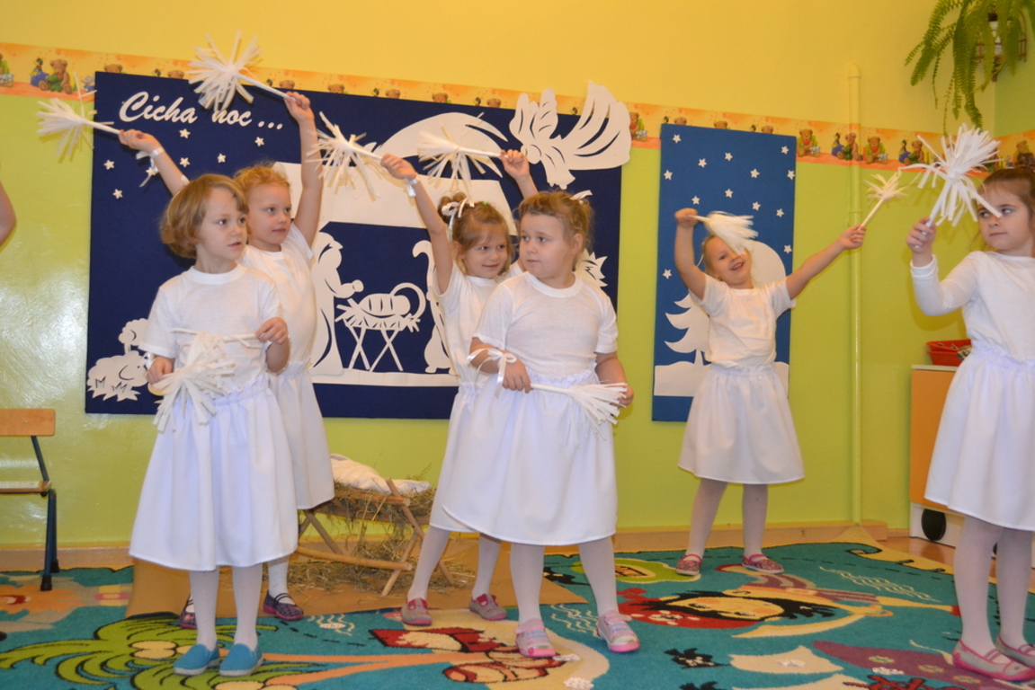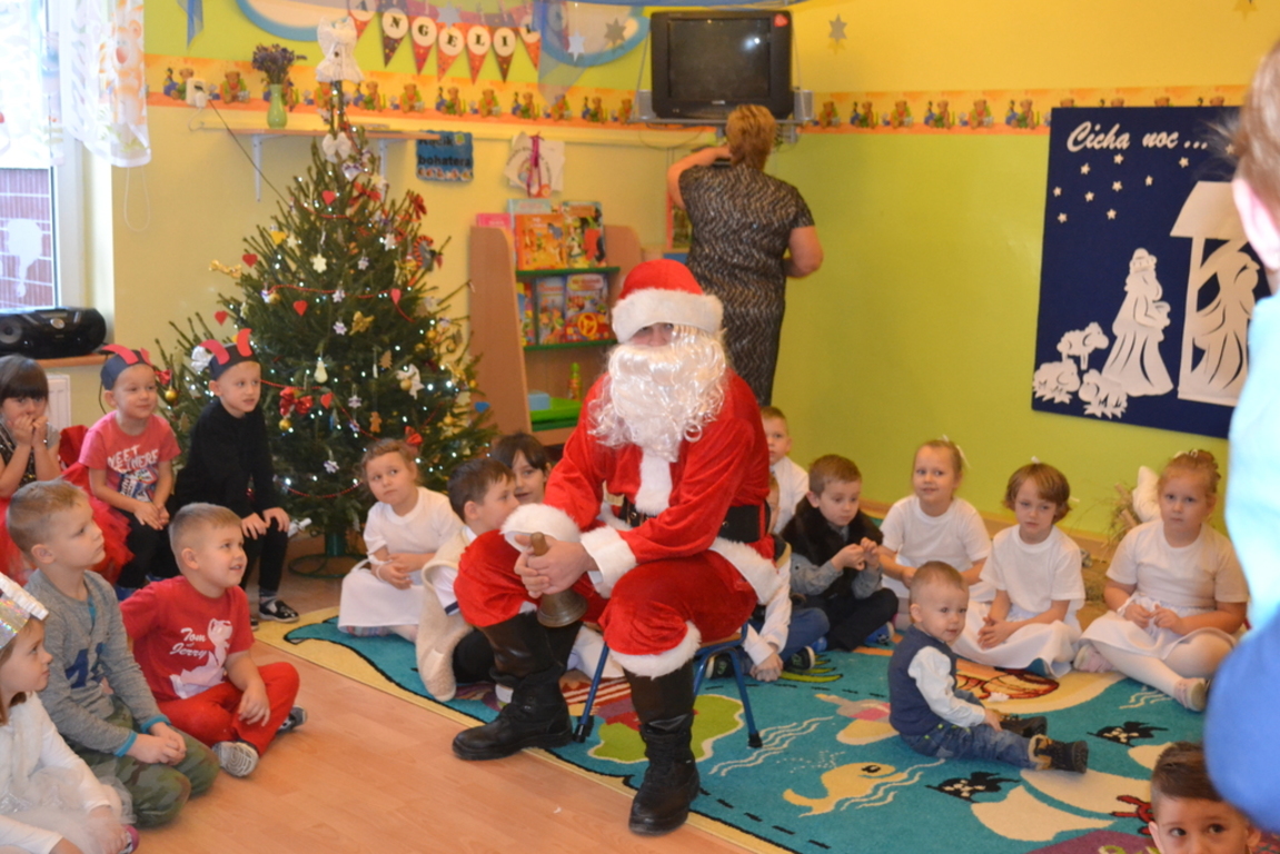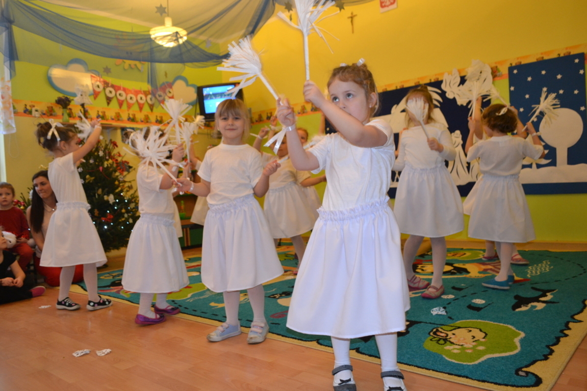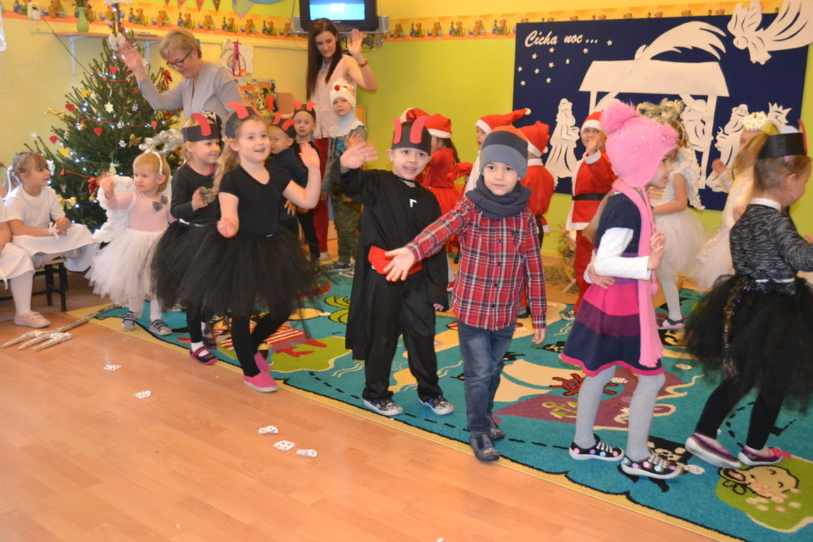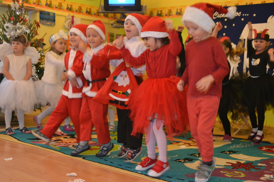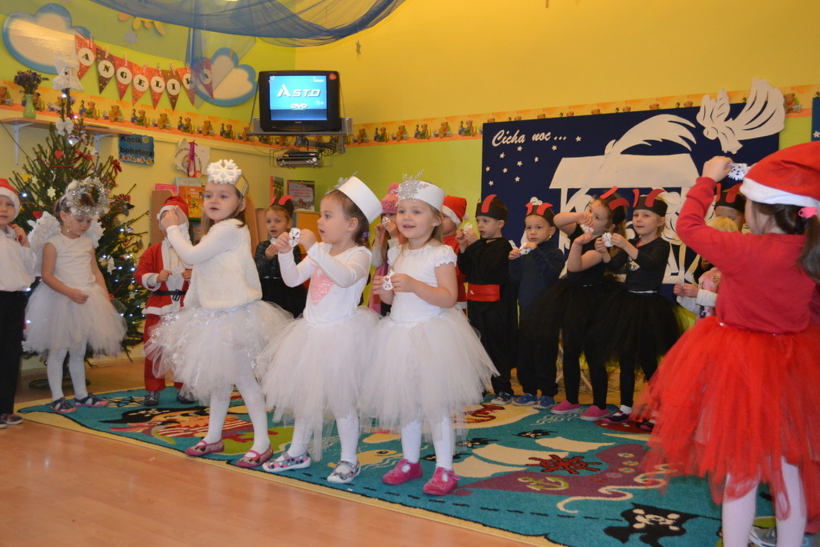 22 grudnia odbyło się w naszym przedszkolu „Spotkanie gwiazdkowe”. Dzieci przedstawiły jasełka, pięknie śpiewały kolędy i pastorałki oraz zaprezentowały ciekawy układ taneczny. Najmłodsze przedszkolaczki zaśpiewały zimową piosenkę w języku angielskim. Po części artystycznej przybył do dzieci długo oczekiwany Święty Mikołaj. Wszystkie przedszkolaczki otrzymały prezenty. Pamiętano również o rodzicach – oni też otrzymali świąteczne upominki. Spotkanie zakończyło się poczęstunkiem przygotowanym przez rodziców.