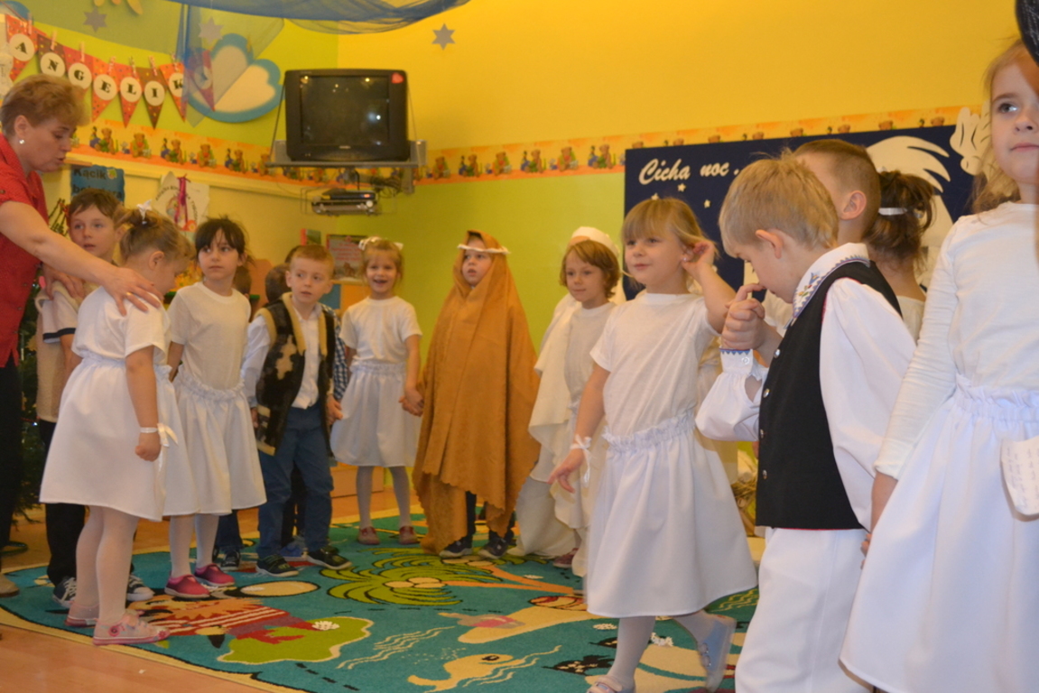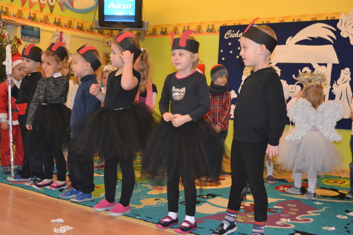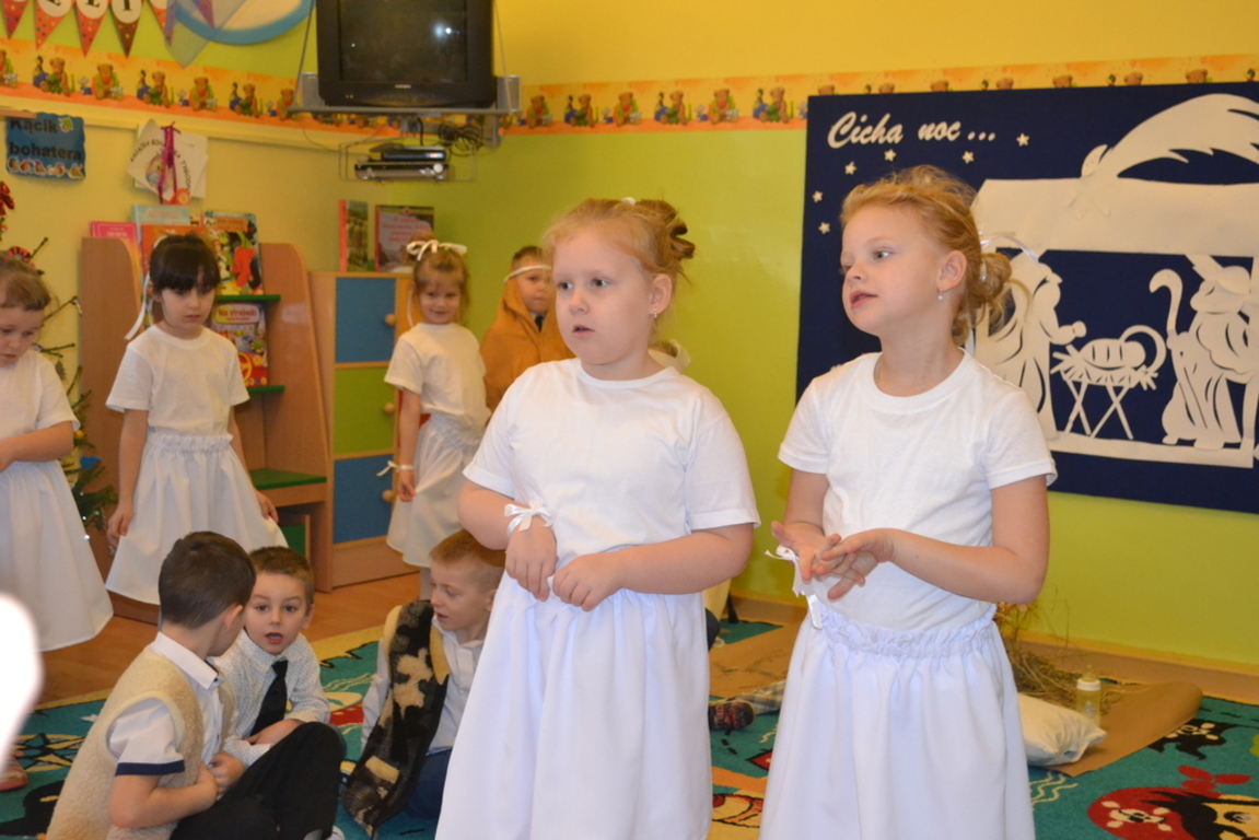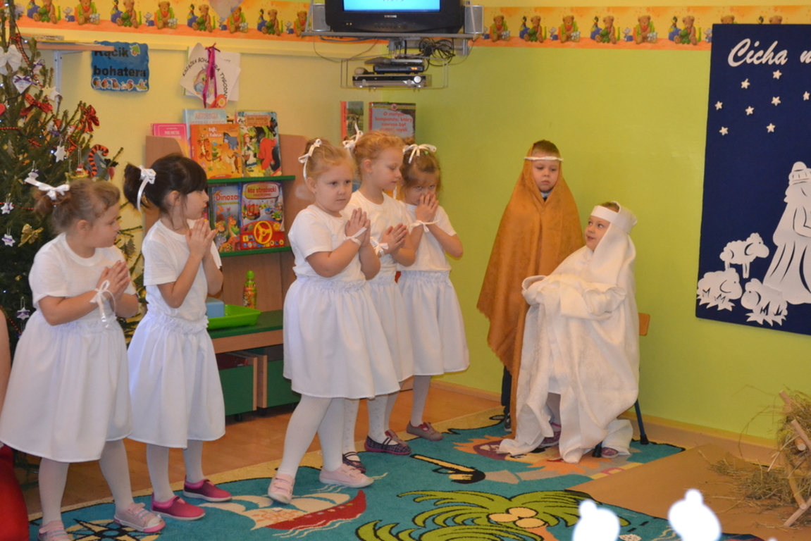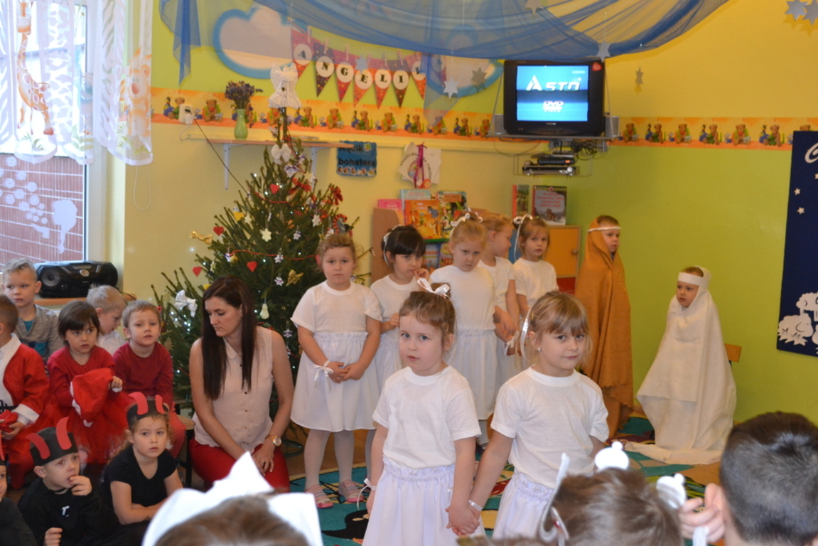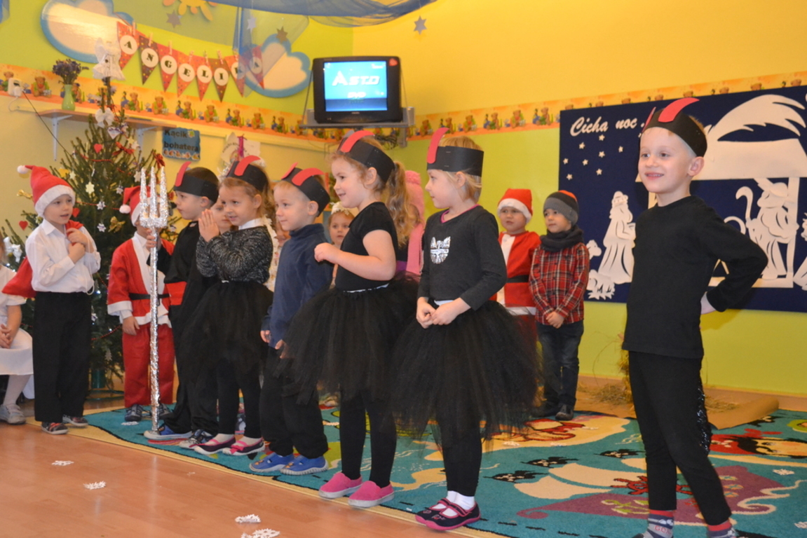 22 grudnia odbyło się w naszym przedszkolu „Spotkanie gwiazdkowe”. Dzieci przedstawiły jasełka, pięknie śpiewały kolędy i pastorałki oraz zaprezentowały ciekawy układ taneczny. Najmłodsze przedszkolaczki zaśpiewały zimową piosenkę w języku angielskim. Po części artystycznej przybył do dzieci długo oczekiwany Święty Mikołaj. Wszystkie przedszkolaczki otrzymały prezenty. Pamiętano również o rodzicach – oni też otrzymali świąteczne upominki. Spotkanie zakończyło się poczęstunkiem przygotowanym przez rodziców.