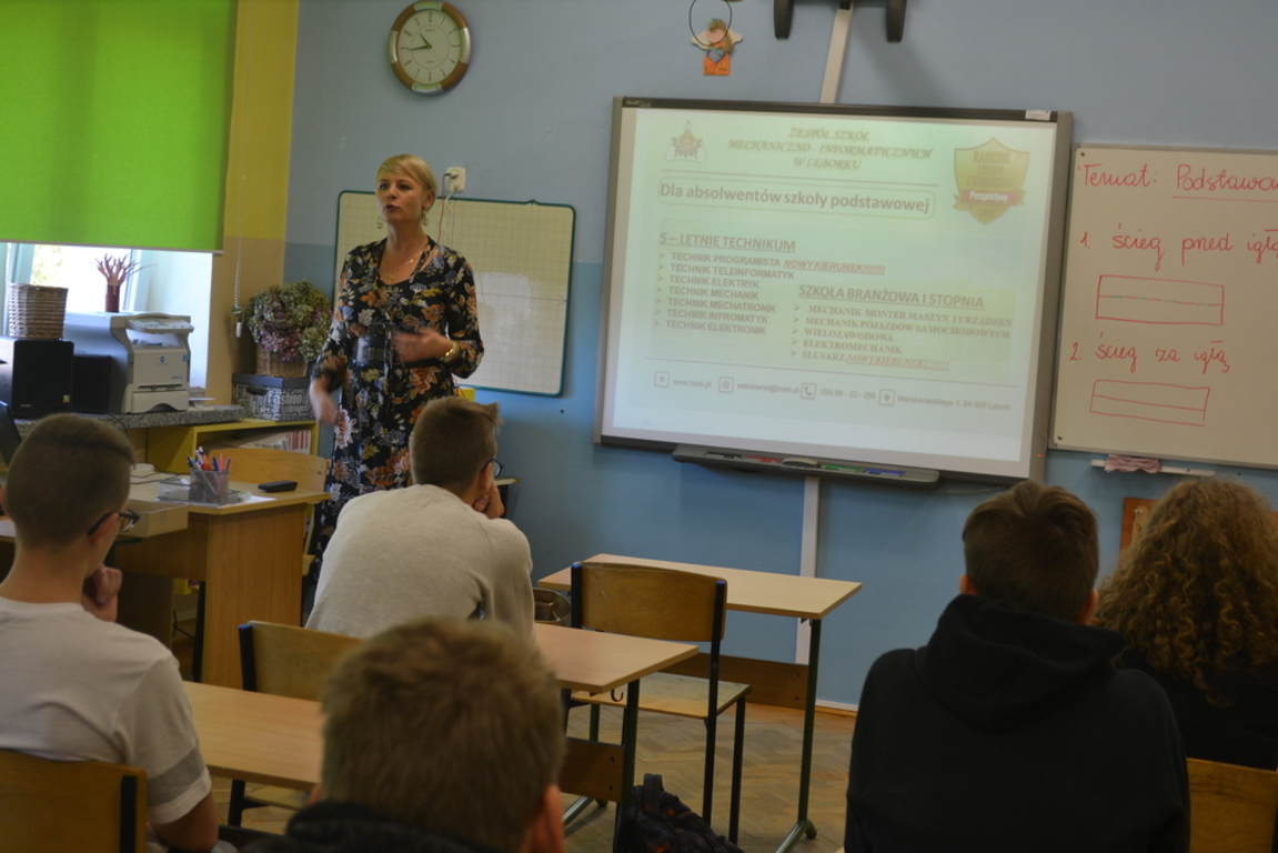 W dniu 15 października 2019r. w naszej szkole odbyło się spotkanie uczniów klasy ósmej z przedstawicielem Zespołu Szkół Mechaniczno – Informatycznych w Lęborku.Podczas spotkania przedstawiono uczniom ofertę edukacyjną szkoły, warunki nauki i specyfikę poszczególnych zawodów.