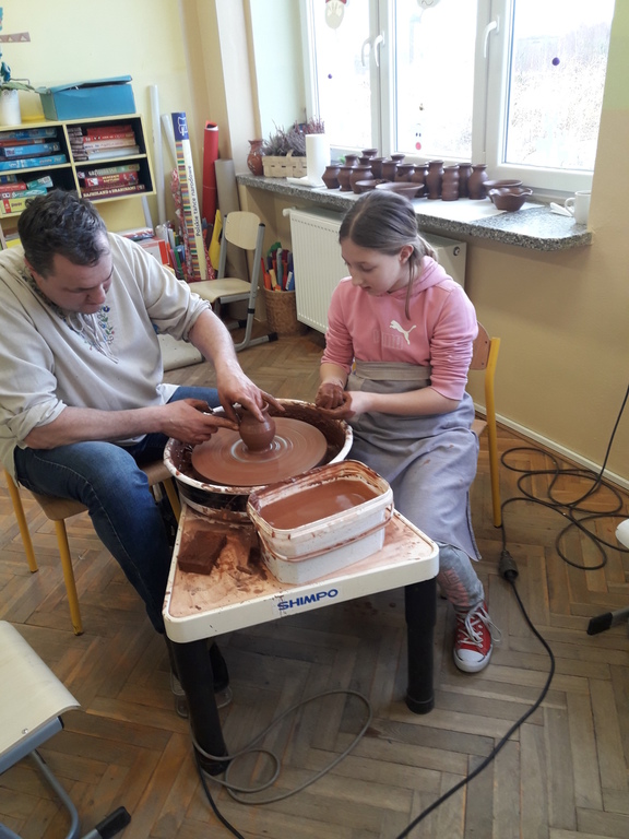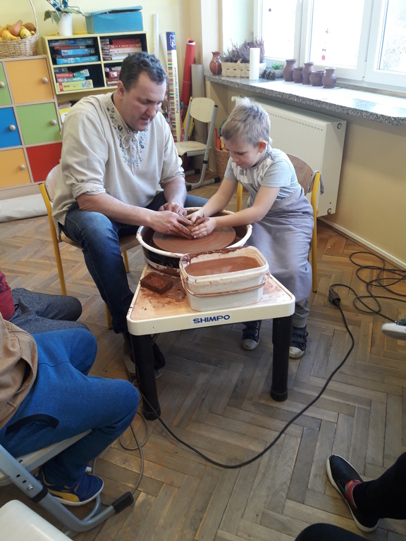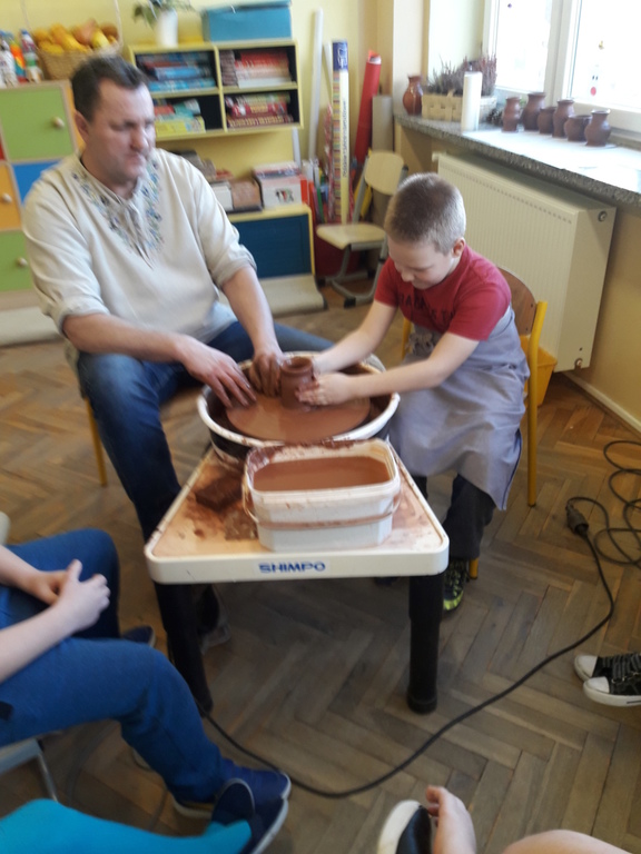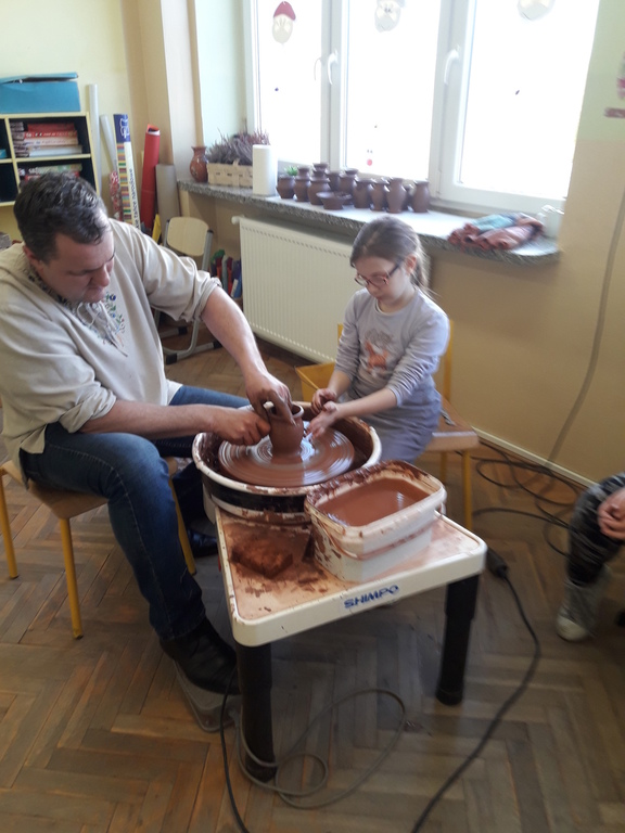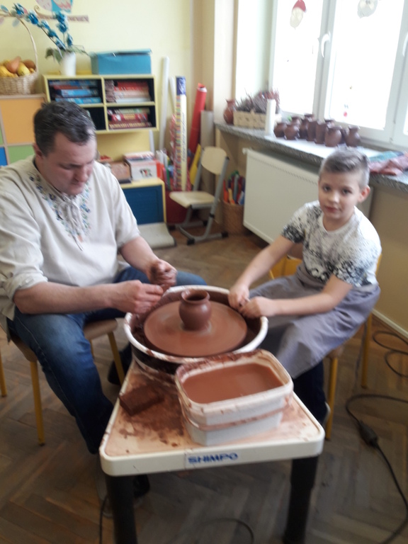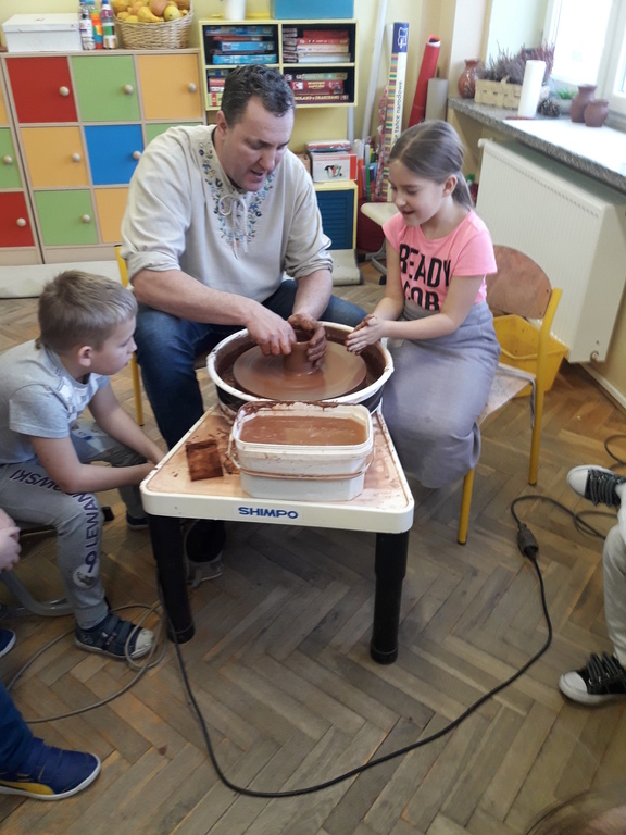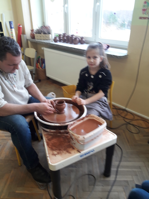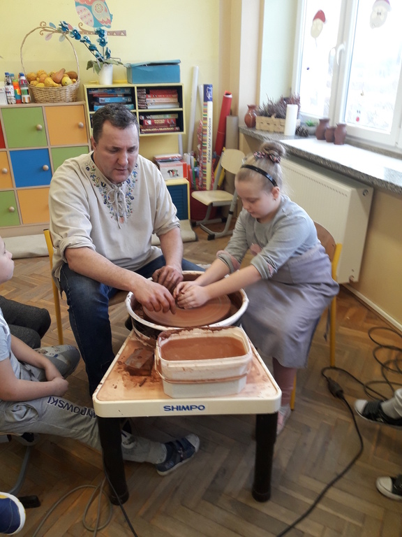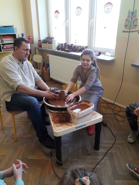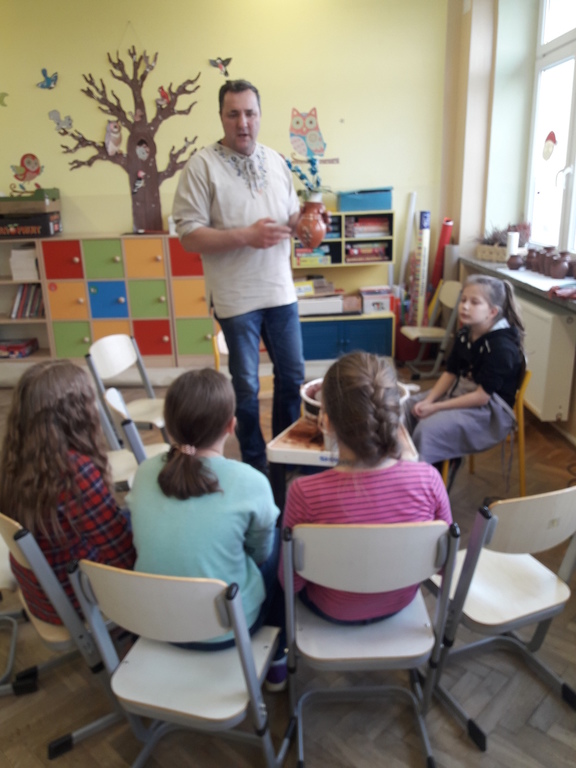 Garncarz przybliżył dzieciom ginący zawód. Opowiedział o tradycji i technologii wyrobu glinianych naczyń. Pokazał w jaki sposób wytwarza się gliniane naczynia na kole garncarskim.