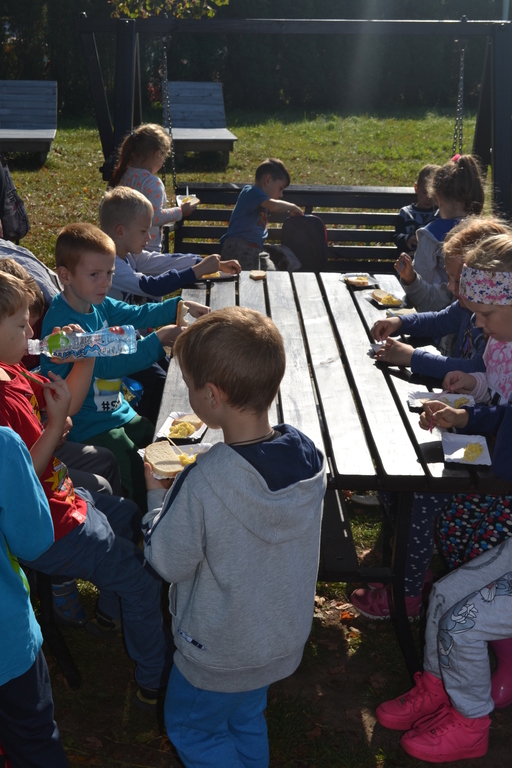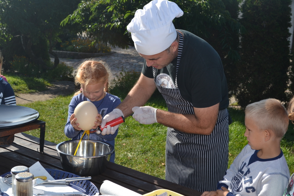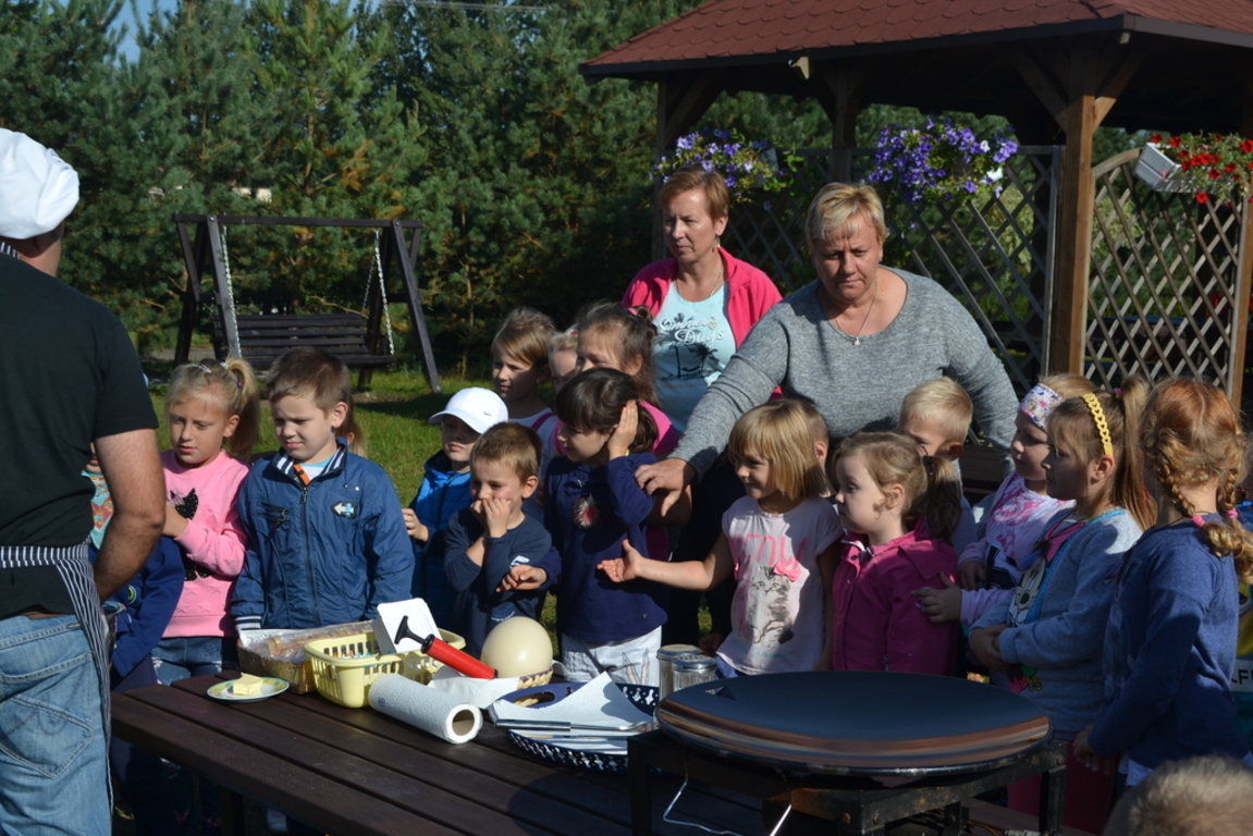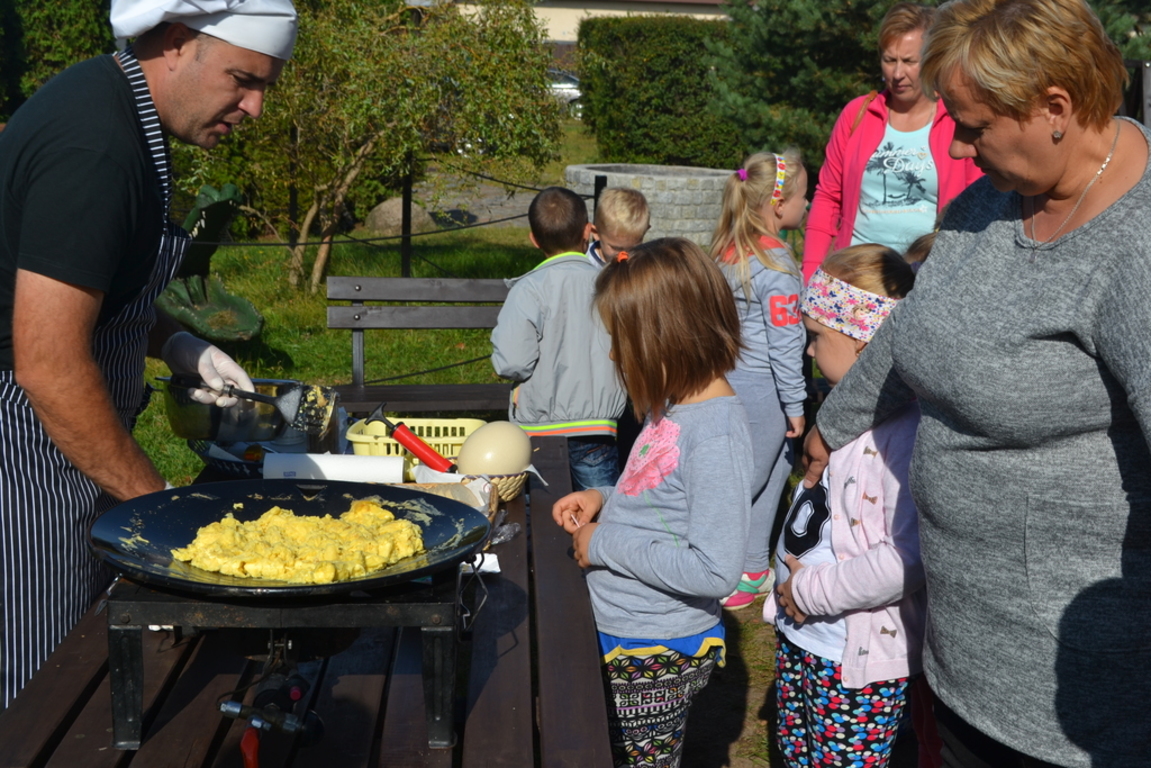 Jajecznicę ze strusiego jaja przygotowaną, na świeżym powietrzu, dzieci zjadły ze smakiem. Słoneczna pogoda pozwoliła przedszkolakom i pierwszakom na zabawę na placu zabaw. Na zakończenie wszystkie dzieci wzięły udział w przejażdżce bryczką wokół farmy. Uśmiechnięte i radosne wróciły do przedszkola i do szkoły.