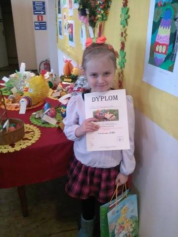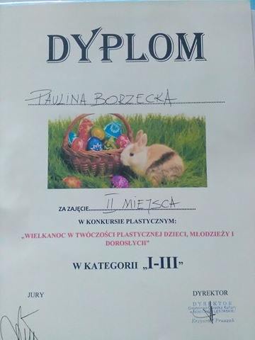 Paulinka Borzęcka kl. Ia - II miejsce w konkursie gminnym "Wielkanoc w twórczości dzieci, młodzież i dorosłych" organizowanym przez GOK w Nowej Wsi Lęb. na najładniejszą pisankę.