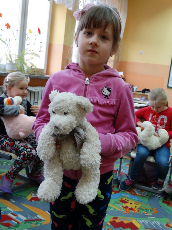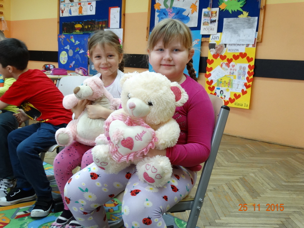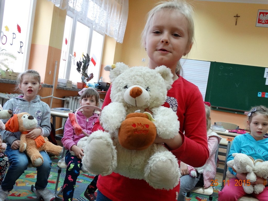25 listopada obchodzimy Światowy Dzień Pluszowego Misia. Tego dnia, dzieci z klasy Ia przyszły do szkoły ze swoimi najukochańszymi pluszakami. Dzieci opowiadały o wyglądzie swojego misia, o tym jak zagościł w ich domku, dlaczego kochają swoja maskotkę. Odbyły się też zabawy i tańce z misiami. Następnie w grupach wykonały plakaty z głównym bohaterem dnia. To był radosny dzień.