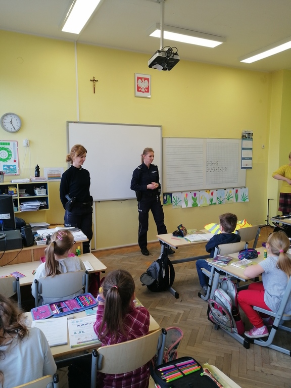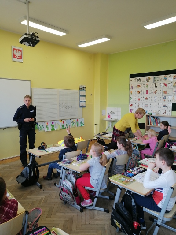 Chętni pierwszoklasiści po przeprowadzonych przez policjantów spotkaniach edukacyjno-profilaktycznych wykonają prace plastyczne z omawianymi zagadnieniami.