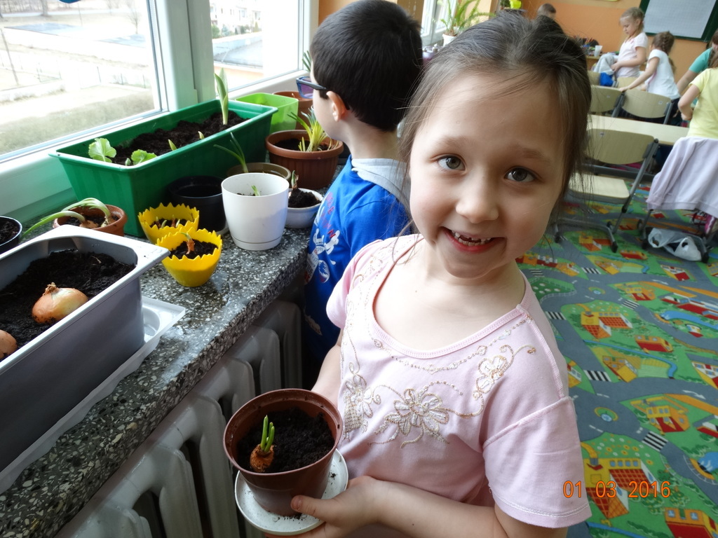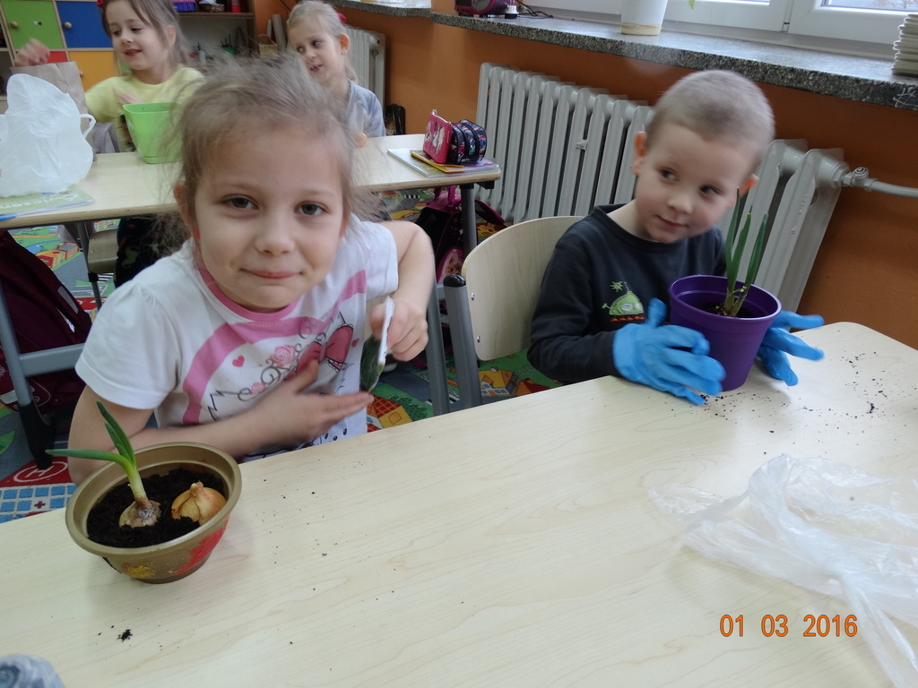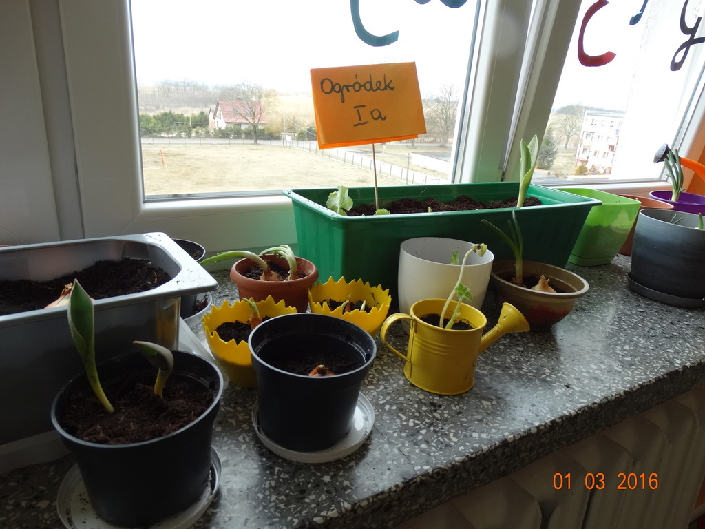 Na dzisiejszych zajęciach z edukacji przyrodniczej, pierwszaki dowiedziały się czego potrzebują rośliny do wegetacji. Sadziły nowe rośliny z cebul, sadzonek, siały zboże, a nawet założyły "hodowlę" fasoli. W klasie I a zrobiło się już bardzo wiosennie.