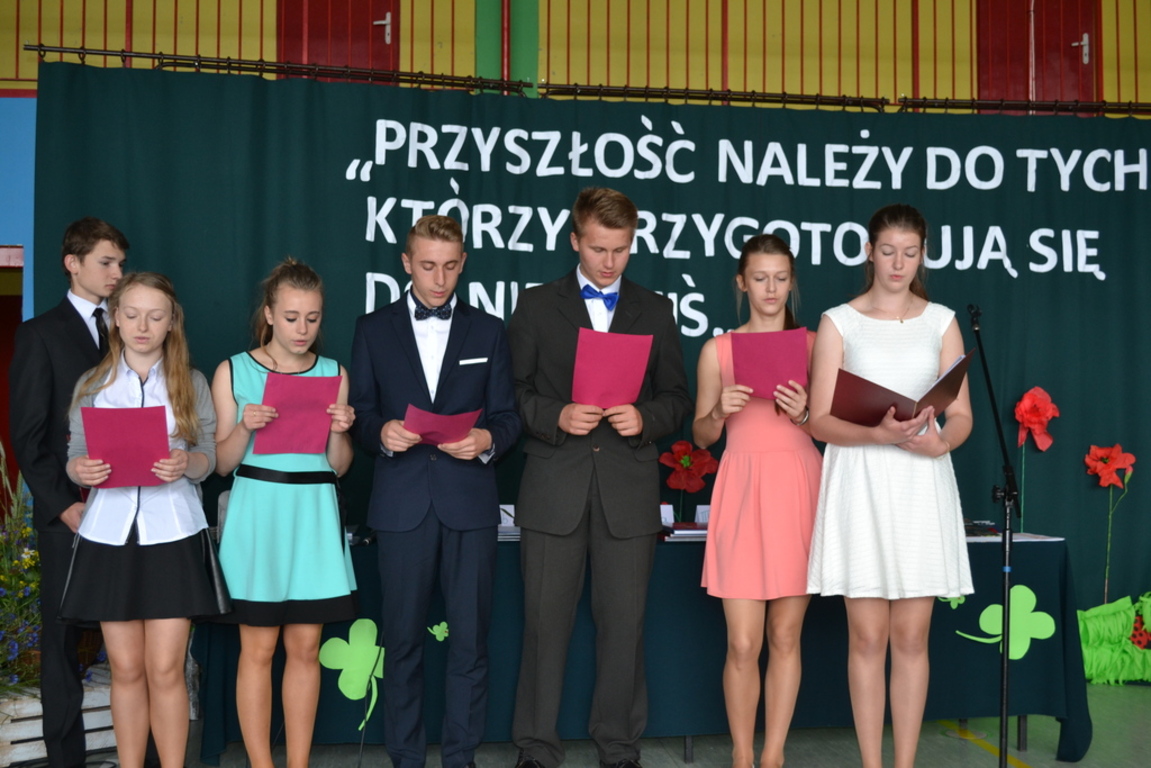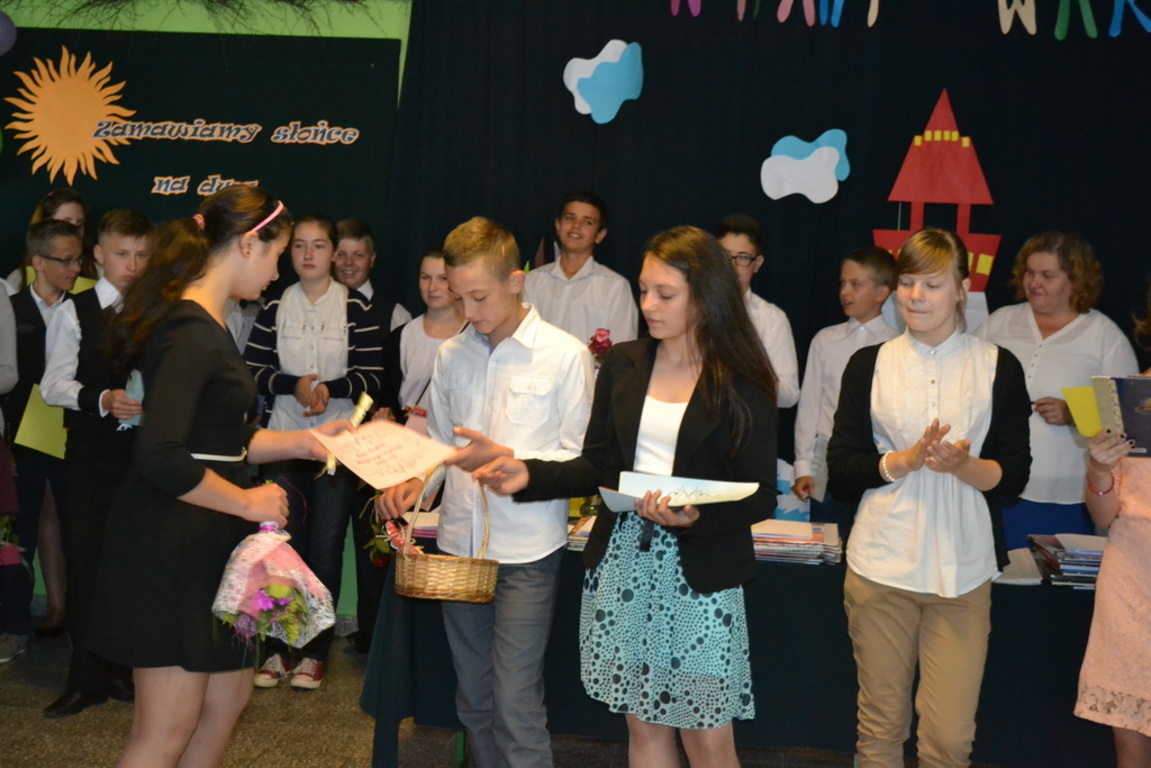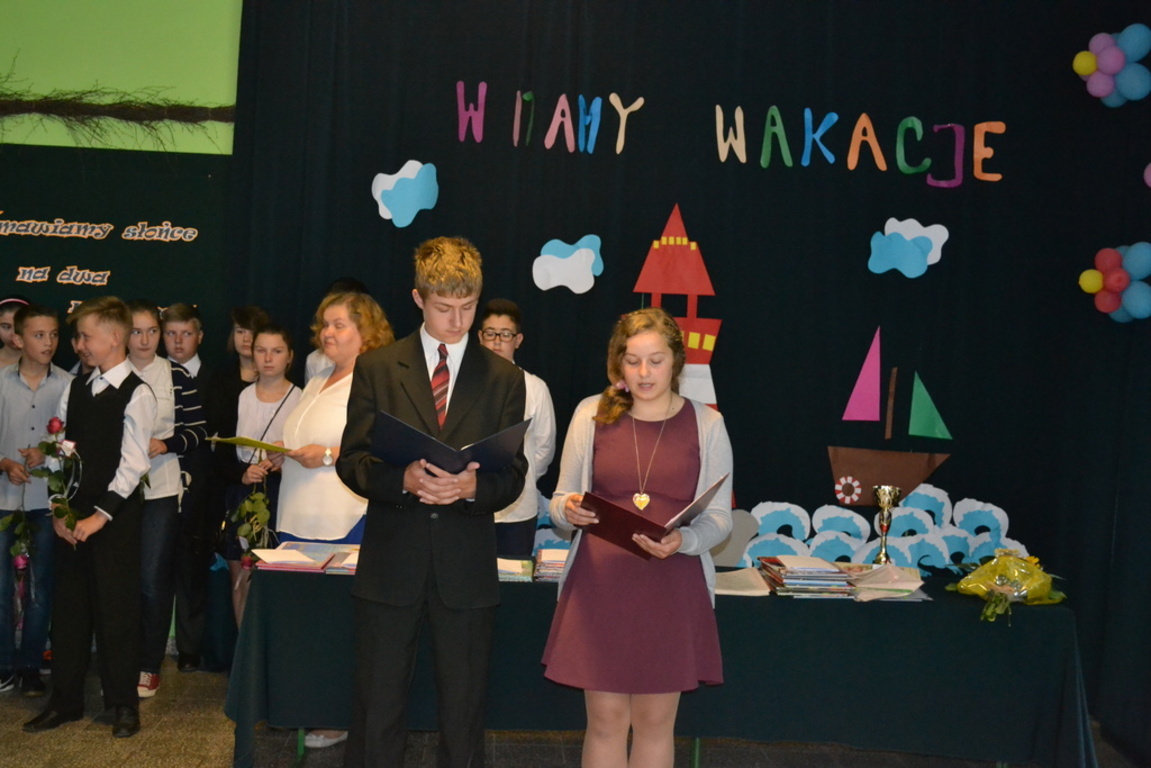 W dniu 26 czerwca odbyło się uroczyste zakończenie roku szkolnego 2014/2015.Przy bardzo licznym udziale rodziców uroczyście pożegnano absolwentów Gimnazjum i Szkoły Podstawowej w Łebieniu. Absolwentom Gimnazjum życzymy sukcesów w dalszej edukacji w nowych szkołach, a uczniom klasy szóstej sukcesów w Gimnazjum. Uczniowie wyróżniający się w nauce, sporcie i pracy społecznej otrzymali szereg nagród ufundowanych przez Radę Rodziców Zespołu Szkół im. Jana Pawła II w Łebieniu. Podsumowano również projekt realizowany przez cały rok szkolny pod nazwą „ Nauka z przyjemnością”. Pani Anetta Kolańczyk, kierownik referatu rozwoju gminy i promocji z Urzędu Gminy Nowa Wieś Lęborska, Pani Justyna Wożniak główny koordynator projektu oraz Pani Elżbieta Laskiewicz koordynator z ramienia szkoły, wręczyły wyróżniającym się uczniom w ramach zajęć projektowych nagrody rzeczowe, a pozostałym uczestnikom drobne upominki. Dyrektor szkoły Krzysztof Wojtysiak podziękował Paniom za wkład w realizację projektu, rodzicom za współpracę, nauczycielom i pracownikom za ogrom pracy w kształtowaniu postaw uczniów, a uczniom za godne reprezentowanie szkoły. Na czas wakacji życzymy wszystkim uczniom dużo słońca oraz miłego i bezpiecznego wypoczynku.