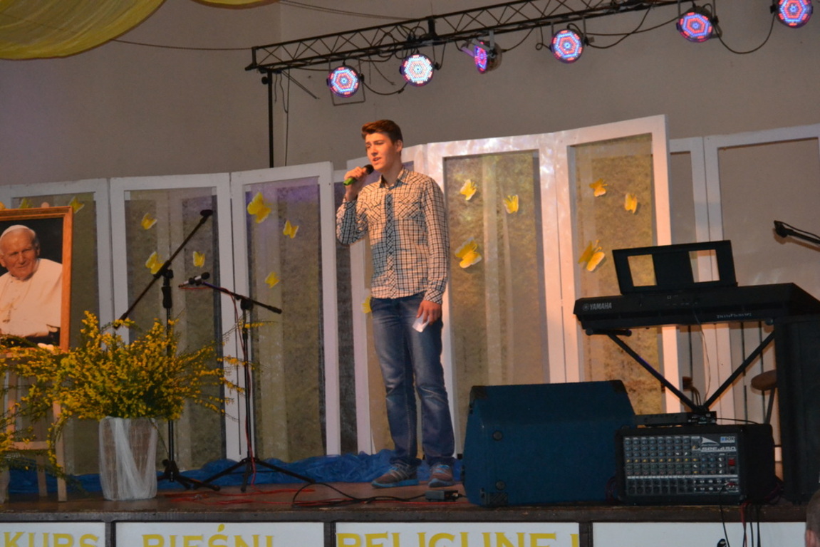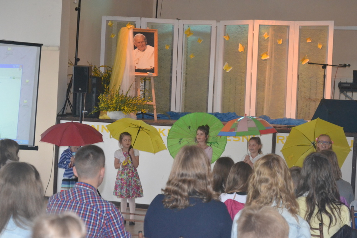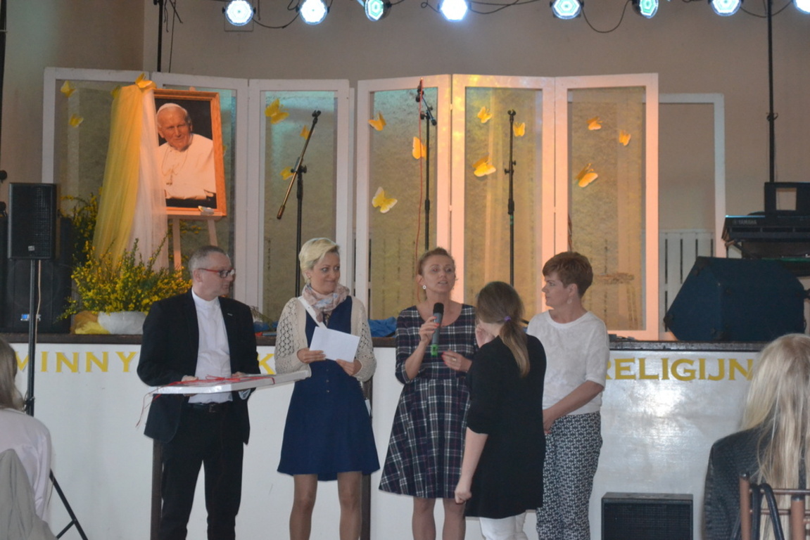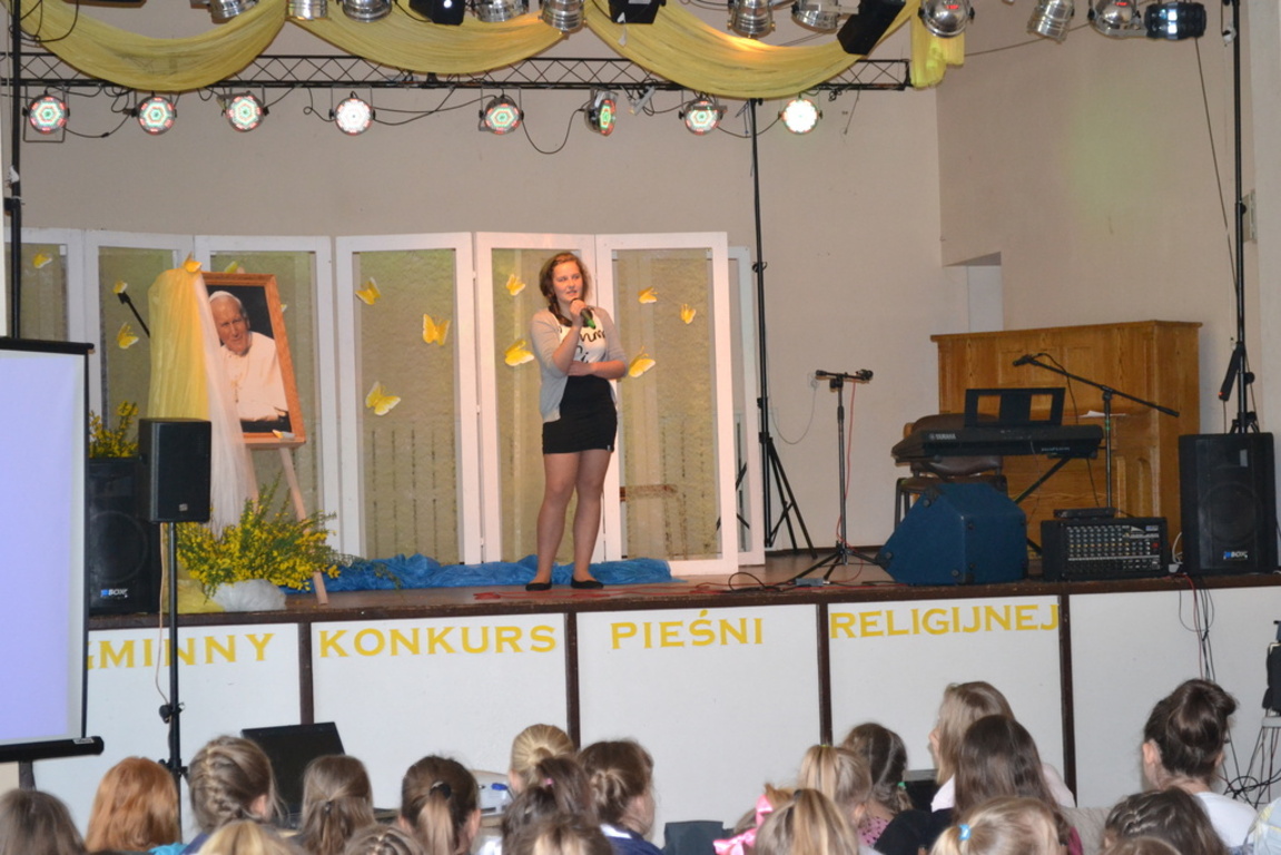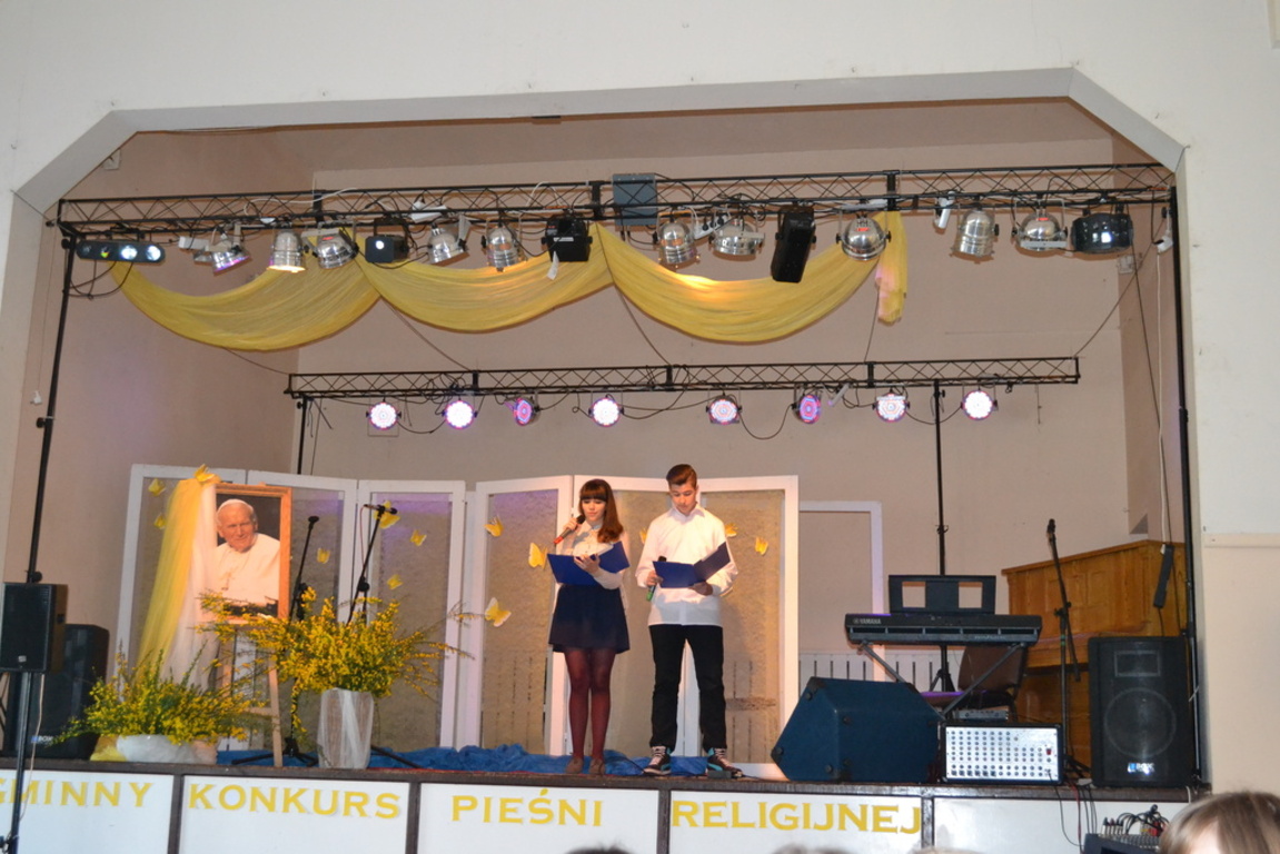21 maja 2015r. odbył się VIII Gminny Konkurs Pieśni Religijnej. Tym razem przesłuchania miały miejsce w Gminnym Ośrodku Kultury w Nowej Wsi Lęborskiej, w której przygotowano scenę, dekorację, poczęstunek oraz 120 miejsc siedzących dla publiczności i występujących. W chwili rozpoczęcia przesłuchań wszystkie miejsca były zajęte. Na twarzach wykonawców gościł ogrom przeżyć, gdyż całość pieśni poświęcona była Patronowi naszej szkoły Świętemu Janowi Pawłowi II.