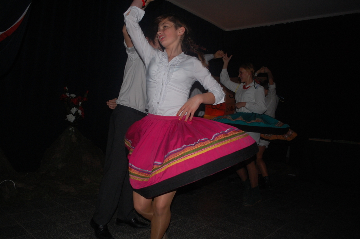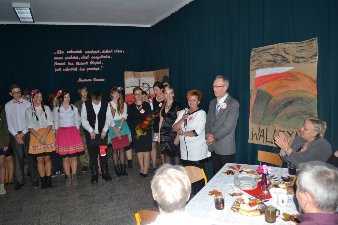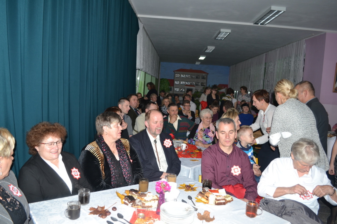 Po oficjalnej części , goście zaproszeni zostali do szkoły , gdzie odbyła się dalsza część uroczystości. Piękny polonez inaugurujący wprawił gości w zachwyt. Cały scenariusz słowno- muzyczno-taneczny okazał się niezwykle interesujący i wzruszający. Przepiękne wiersze, pieśni patriotyczne, wywołały w nas wszystkich zadumę nad przeszłością , jak również i przyszłością naszego narodu. Największe brawa otrzymał taniec oberek oraz piosenka "Dziewczyna w zielonej sukience"( w tej roli Julia Prokopowicz) . Czas umilił gościom słodki poczęstunek. Po uroczystości dyrektor szkoły - Pan Krzysztof Wojtysiak podziękował wszystkim za udział w obchodach tak ważnego święta. Gospodarz naszej gminy- Wójt Ryszard Wittke również wyraził radość z powodu, że możemy spotykać się w tak szerokim gronie i wspólnie cieszyć z niepodległej Polski.