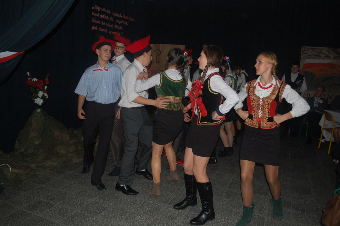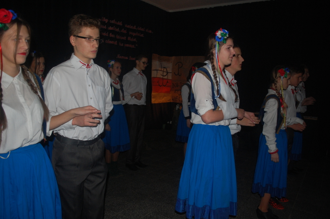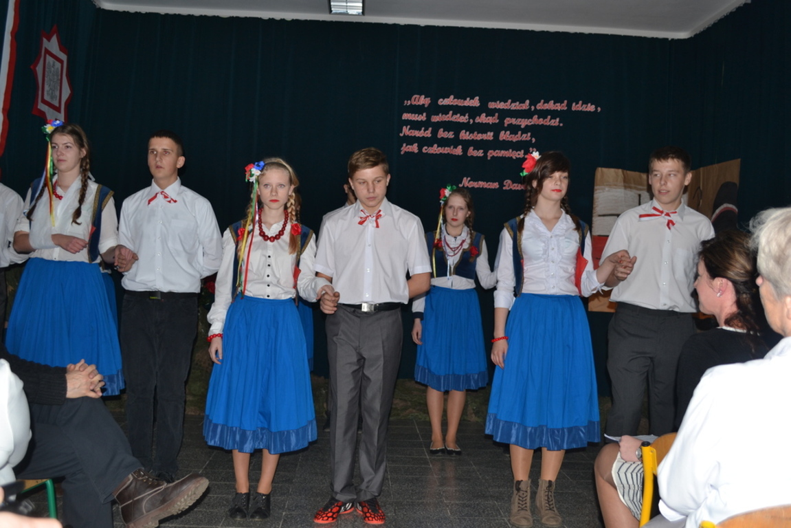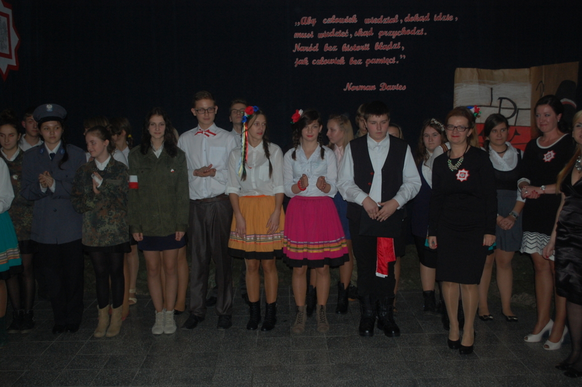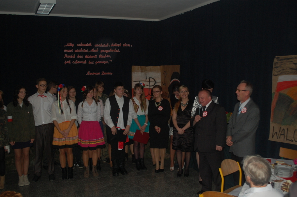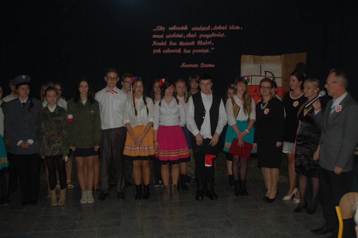 Goście byli oczarowani występem w wykonaniu uczniów. Głównymi prowadzącymi byli: Monika Domaros oraz Szymon Popiela. Wiersze recytowali: Patrycja Kowalik, Paulina Górczyńska, Karolina Czaja, Michalina Czajkowska, Zuzanna Bobrucka, Adrian Klejsa oraz Kinga Wyrwał. Tańce narodowe - polonez, krakowiak i oberek: Patrycja Kowalik, Olaf Jaskulski, Malwina Makurat, Szymon Stojek, Dominika Sadło, Błażej Marciniak, Patrycja Filcek, Bartłomiej Hinca, Marcelina Kucharska, Jakub Wyrwał, Joanna Gołębiowska, Paweł Czajkowski, Angelika Stenka i Cezary Pleśniak. Soliści i chór: Joanna Gołębiowska, Monika Domaros, Angelika Zakrzewska, Monika Mydlach, Weronika Daleka, Agata Smykowska, Katarzyna Skuza, Diana Brzeska, Angelika Ćwikła, Mateusz Rybarczyk, Olaf Jaskulski, Julia Prokopowicz, Milena Heland, Beata Ropela. Cymbałki: Ewa Wieczorkiewicz, Kacper Stojek i Maciej Sadło. Gitara - Milena Heland. Żołnierze trzymający wartę: Mateusz Rybarczyk, Błażej Banit, Olaf Jaskulski, Szymon Stojek, Jakub Wyrwał oraz Cezary Pleśniak.