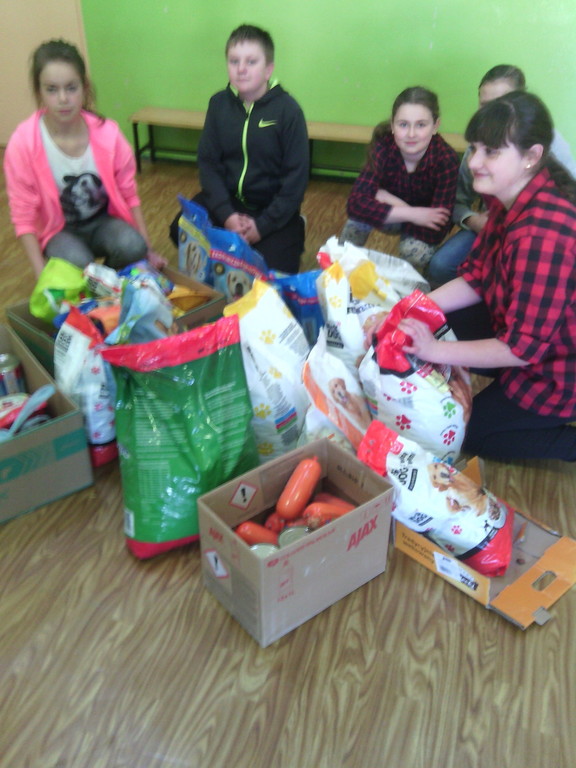 W dniu 29 kwietnia 2017r. zebrana w szkole karma, została dostarczonado schroniska w Dąbrówce. Akcję zorganizowali wolontariusze ze Szkoły Podstawowej. Przygotowali punkty składowania karmy, motywowali do włączenia się w zbiórkę. Wszystkie klasy SP wzięły udział w akcji, ale najbardziej zaangażowały się klasa IIa i klasa VI, bowiem te klasy zebrałyjej najwięcej. Na zakończenie zbiórki odbył się apel, podczas którego uczniowie otrzymali ogromne podziękowania, obejrzeli prezentację na temat funkcjonowania schroniska w Dąbrowce, zasad opieki nad zwierzętami. Otrzymaliśmy gorące podziękowanie za przywiezione dary, a w nagrodę obejrzeliśmy schronisko i mogliśmy pospacerować z dwoma psiakami. Ogromne podziękowania należą się wolontariuszom, uczniom, rodzicom i wychowawcom, dzięki którym udało się zebrać tak dużo karmy. Podziękowanie również dla wolontariusza Kuby Klejsy i jego rodziców za pomoc w zorganizowaniu dowozu karmy do schroniska.
