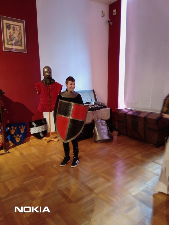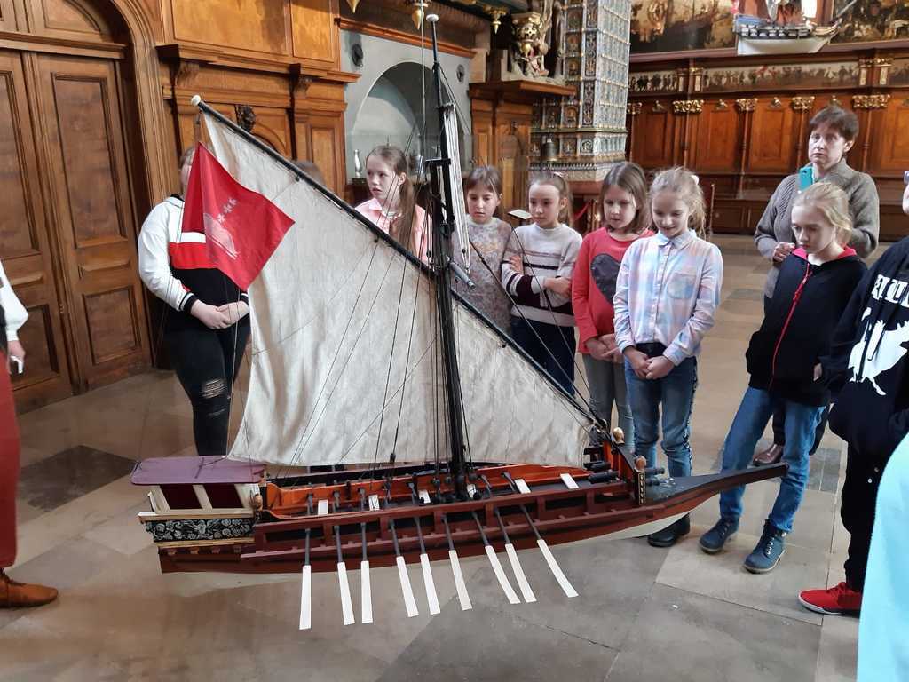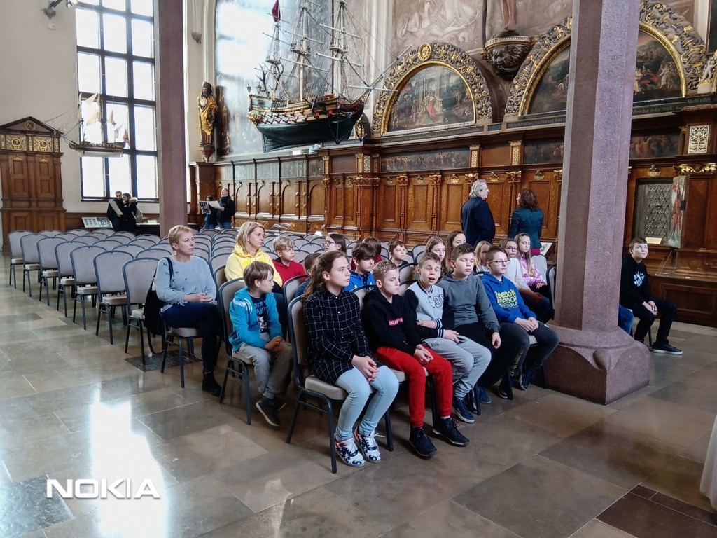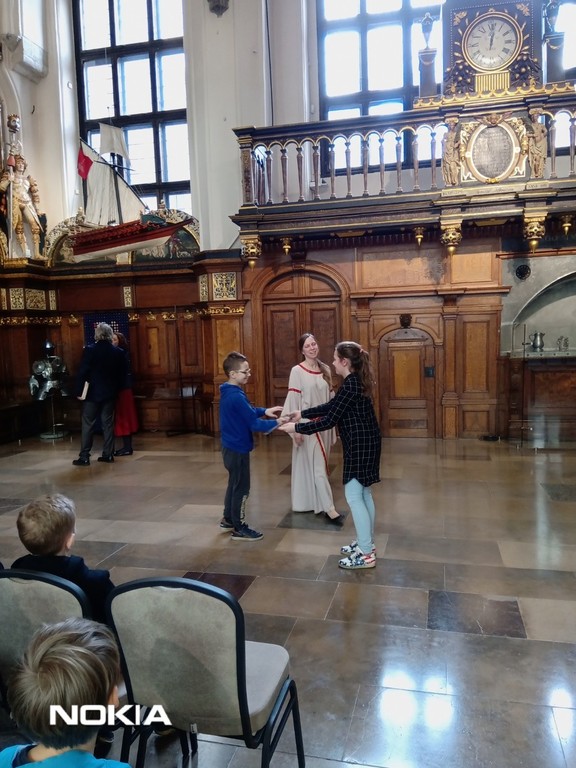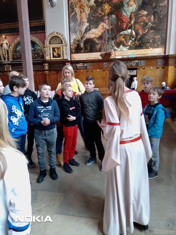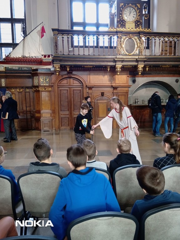 Następnie udano się na warsztaty do Dworu Artusa, by dowiedzieć się skąd taka nazwa i jaka jest historia tej budowli. Uczniowie dowiedzieli się , że historia pochodzenia nazwy Dworu Artusa związana jest z rycerzem Arturem i pierwotna funkcja tego miejsca powiązana była właśnie z rycerstwem. Potwierdza to fakt, że dwór ten został wzniesiony przez Bractwo Św. Jerzego w połowie XIV wieku. Największe wrażenie, które wzbudziły zachwyt uczniów to elementy wyposażenia sali, które dają pewne wyobrażenie o tym, jak piękne i oryginalne musiały być to wnętrza za czasów ich świetności. W samej sali, oprócz zwisających z sufitu, niczym na pajęczynach, modeli okrętów, uwagę przykuwa wielki 11-metrowy piec kaflowy, bogato zdobiony popiersiami władców europejskich. Pani przebrana za rycerkę pięknie opowiadała, jak za dawnych czasów wyglądało życie na tym dworze i w dawnym Gdańsku. Potem uczniowie przenieśli się do sali rycerskiej, gdzie czekała na nich wystawa dotycząca czasów współczesnych Królowi Arturowi. Można było tam m.in. zasiąść, tak jak niegdyś rycerze Króla Artura, przy okrągłym stole - symbolu równości i partnerstwa. Można było poczuć się rycerzami, przebierając się w zbroję i próbując walczyć mieczem. Taka podróż w czasie bardzo zaciekawiła i pozwoliła przenieść się w świat legend, opowieści o rycerzach, sławnych bitew, pięknej sztuki i moralizujących obrazów. Potem jeszcze spacer na wyspę Ołowiankę i z zadowolenemi można było wrócić do domu.